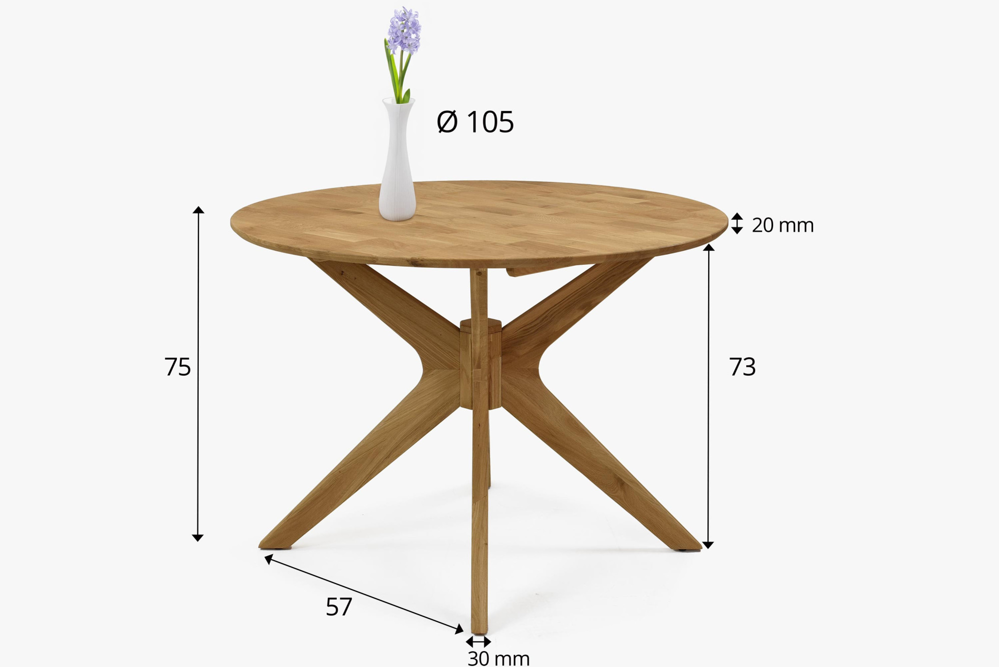 A kerek tömör tölgyfa asztal ideális választás a természetes anyagok és az elegáns dizájn kedvelőinek. A 105 cm átmérőjű asztallap elegendő helyet biztosít akár 4 széket, így kiváló étkező- vagy íróasztal kisebb és közepes méretű belső terekbe. A felületkezelés az olasz Borma Wachs márka természetes olajával készült, amely védi a fát a nedvességtől és megőrzi természetes erezetét. Az FSC tanúsítványnak köszönhetően biztos lehet benne, hogy fenntartható forrásból származó fát használtak, így környezetbarát.