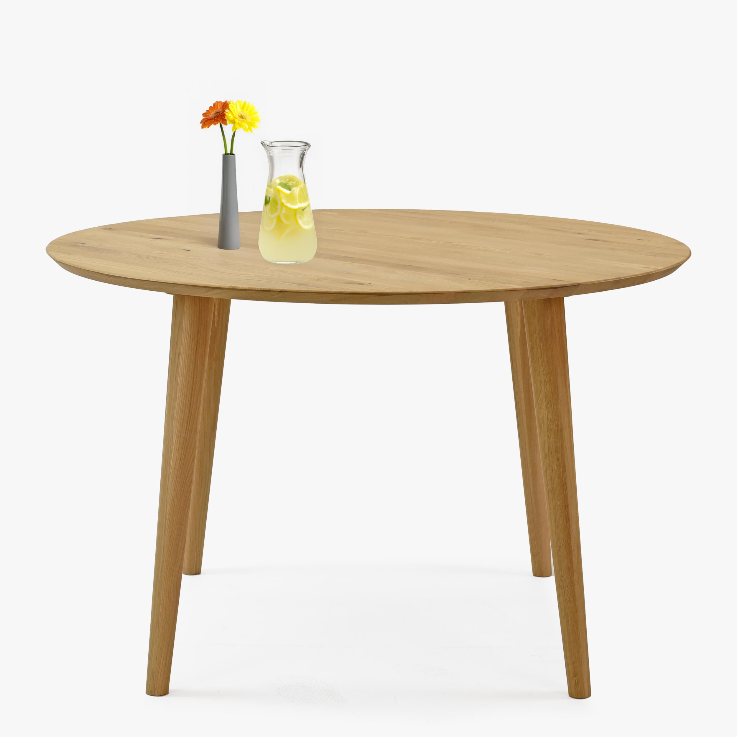 Ez a tölgyfa kerek asztal nemcsak időtálló tervezésével tűnik ki, hanem magas minőségű kivitelezésével is. Az asztallap tömör tölgyből készült, 25 mm vastagsággal, ami biztosítja annak szilárdságát és ellenállóságát. Az asztal lábai elegánsan formázottak, enyhén hengeres profillal, ami növeli az asztal stabilitását és kiemeli modern megjelenését. A felületkezelés olajjal nemcsak védi a fát, hanem kiemeli természetes szépségét és erezetét. A tölgyfa kerek asztal szétszerelve kerül szállításra, de az összeszerelés nagyon egyszerű, bárki el tudja végezni.
