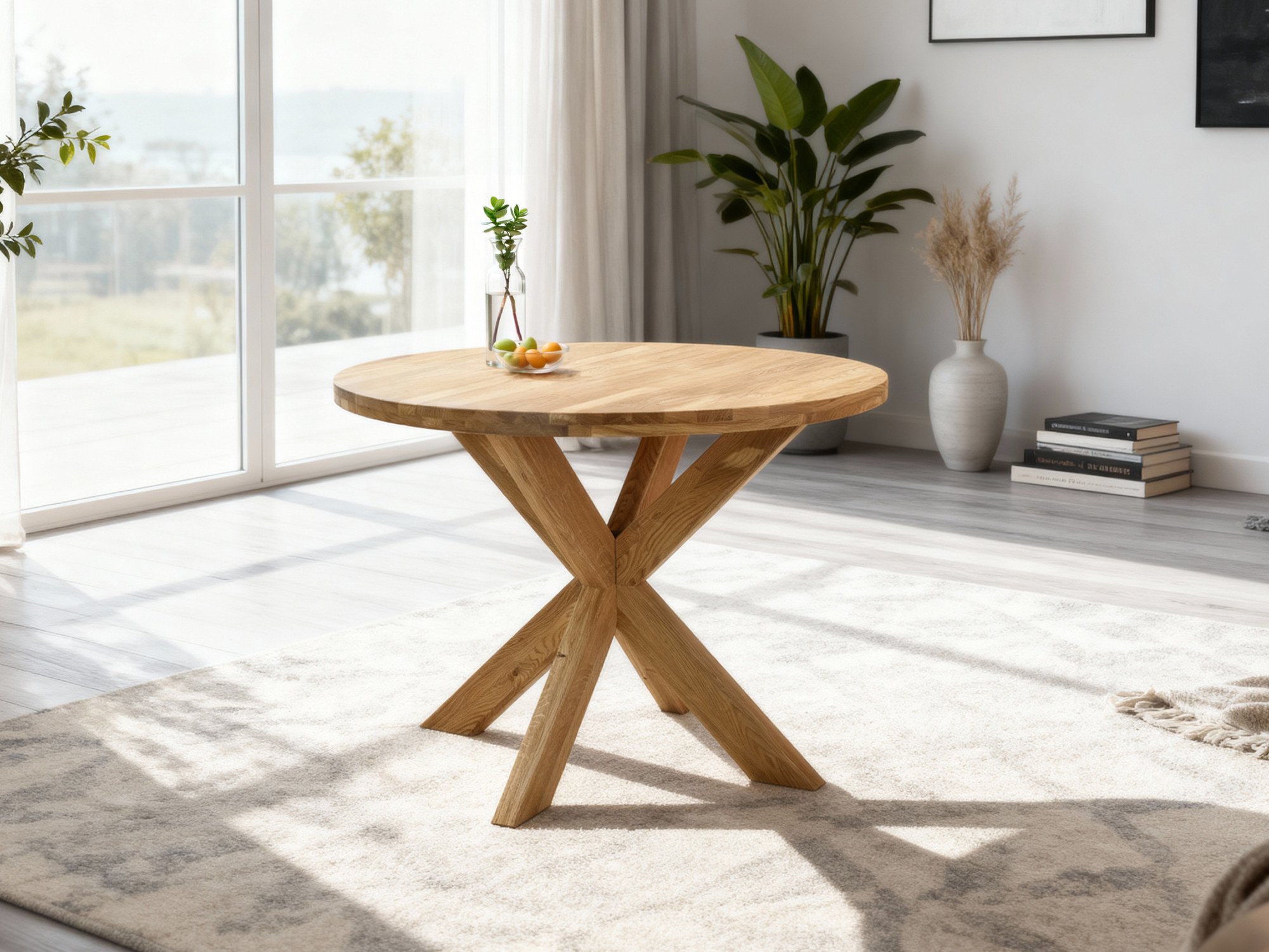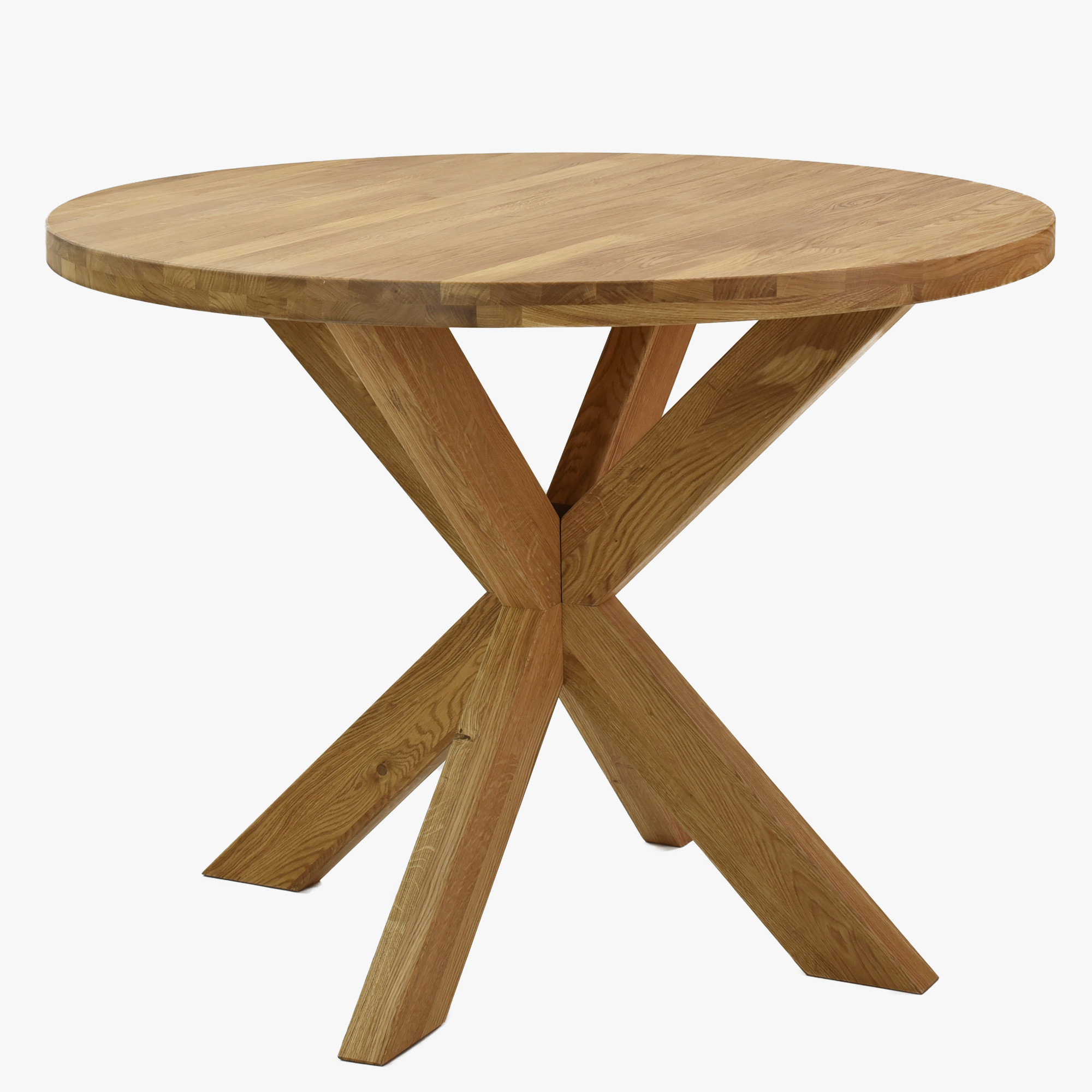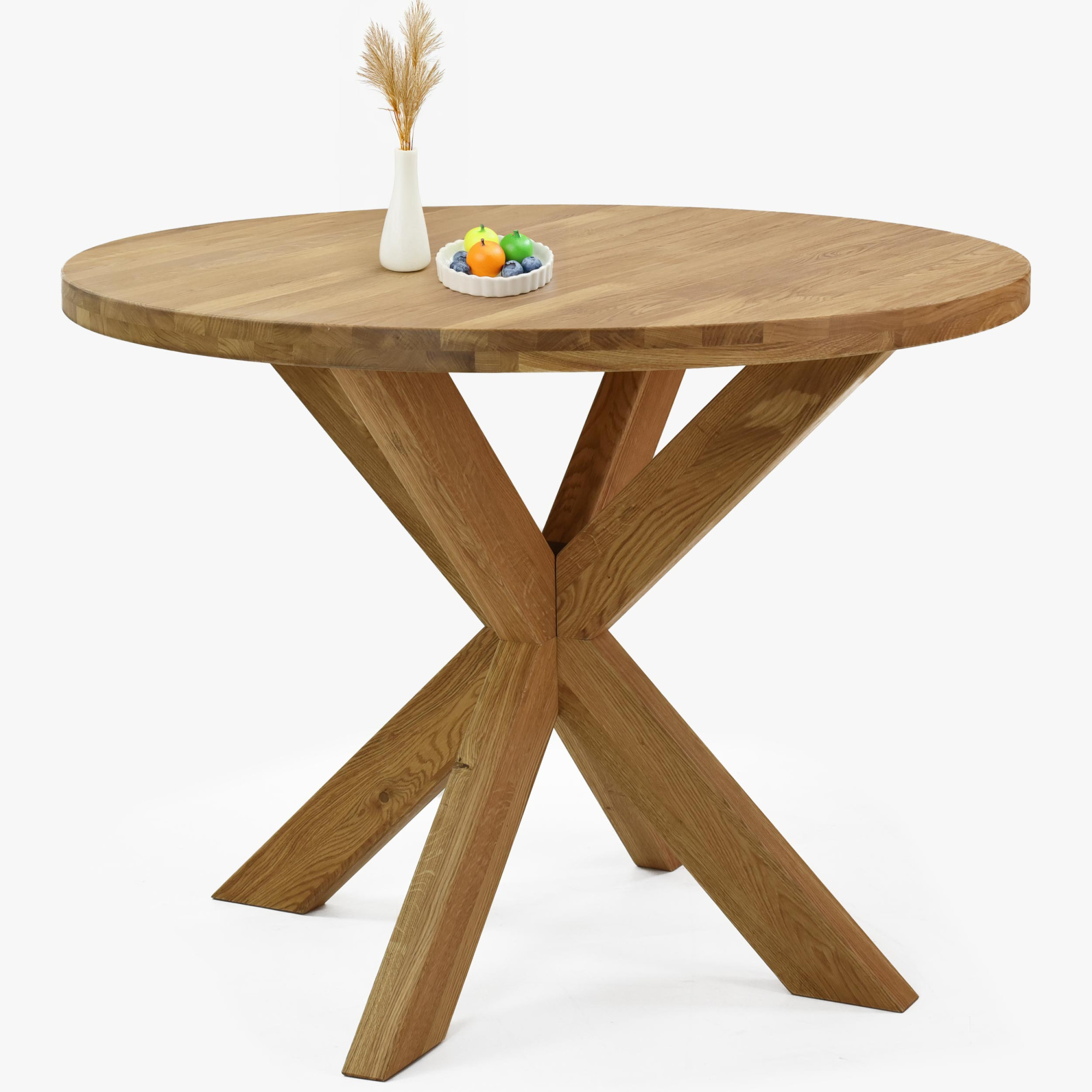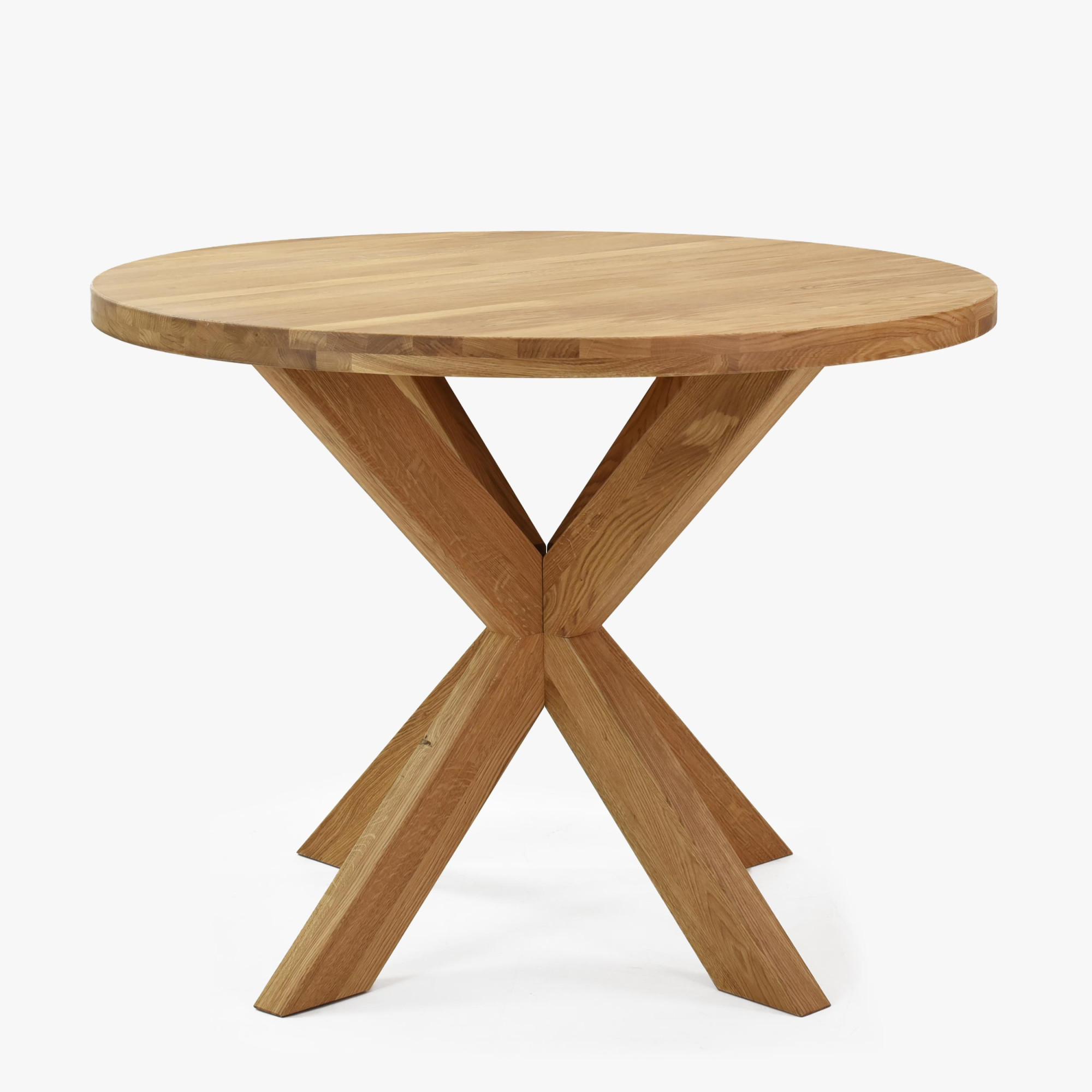Tölgyfa kerek étkezőasztal keresztezett lábakkal, 100 cm átmérővel