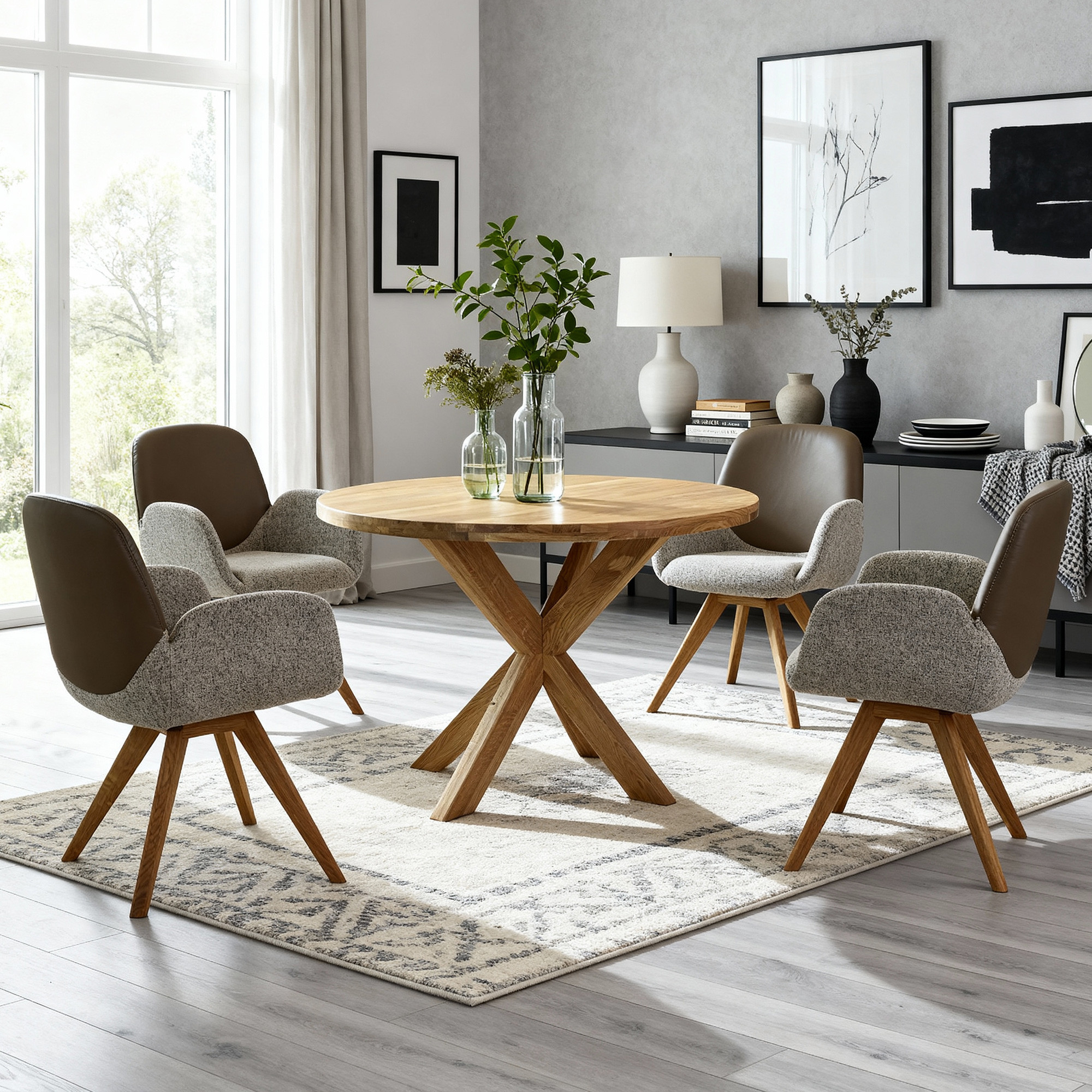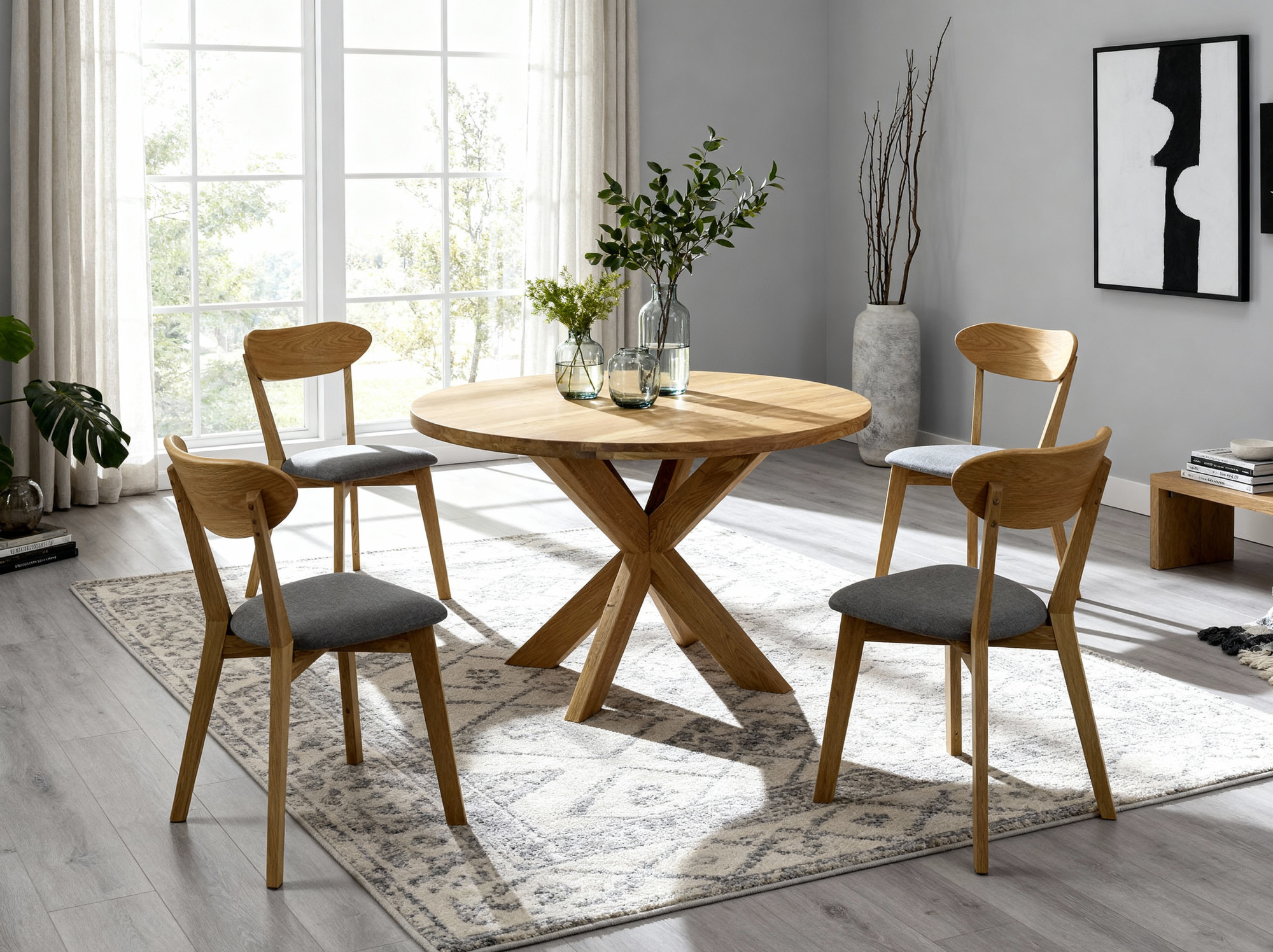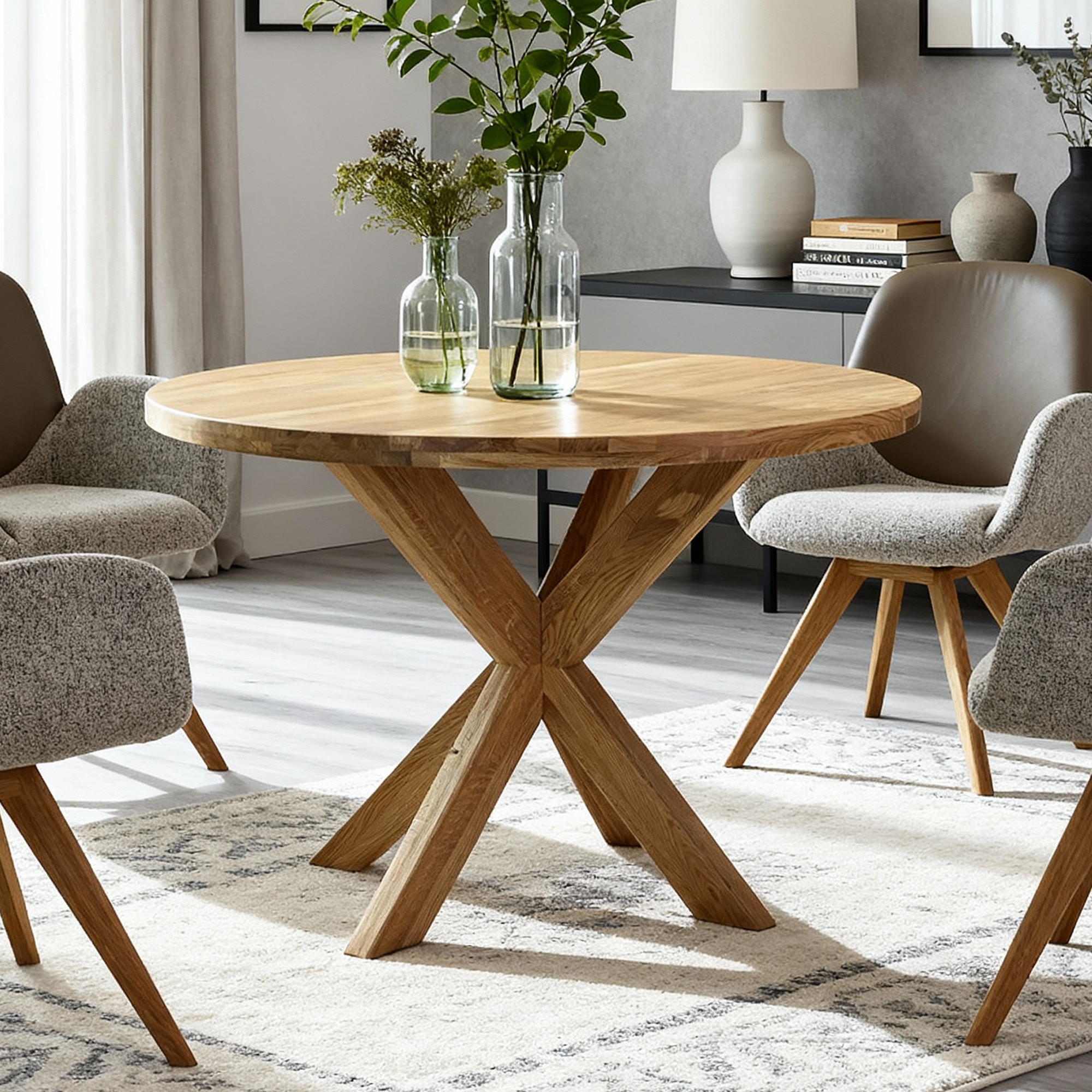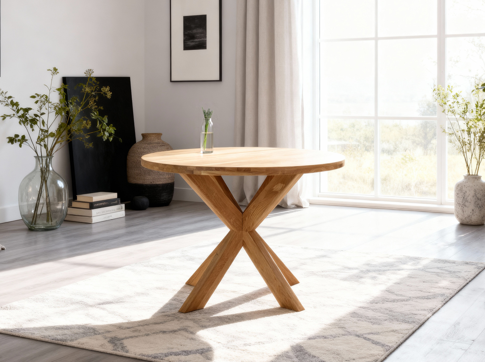Tölgyfa kerek étkezőasztal keresztezett lábakkal, 100 cm átmérővel