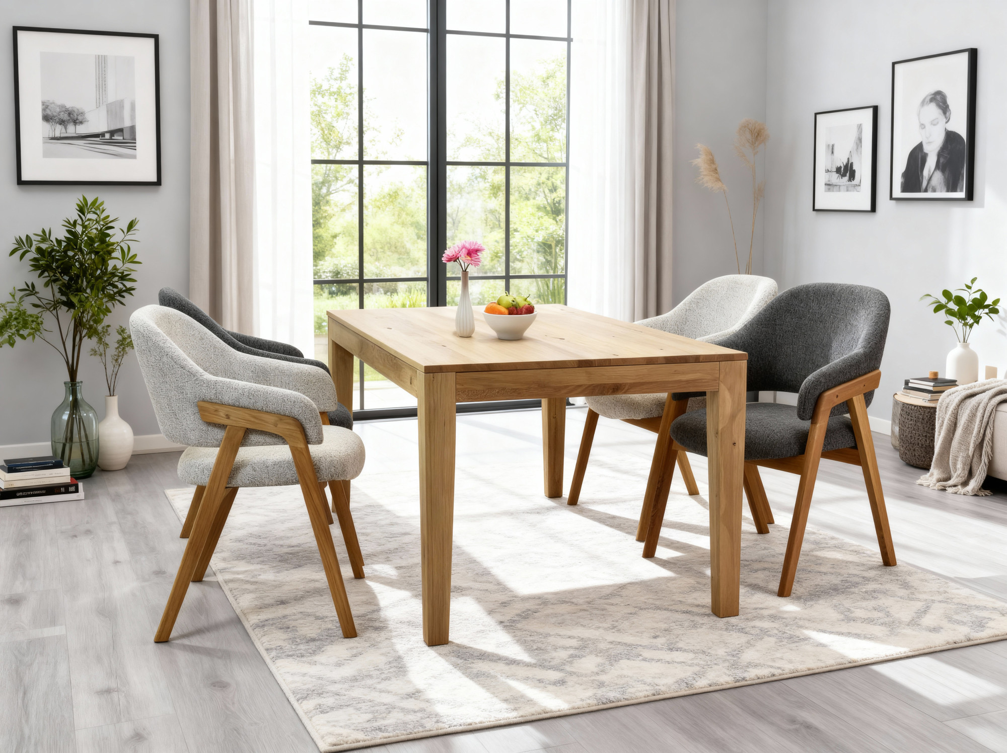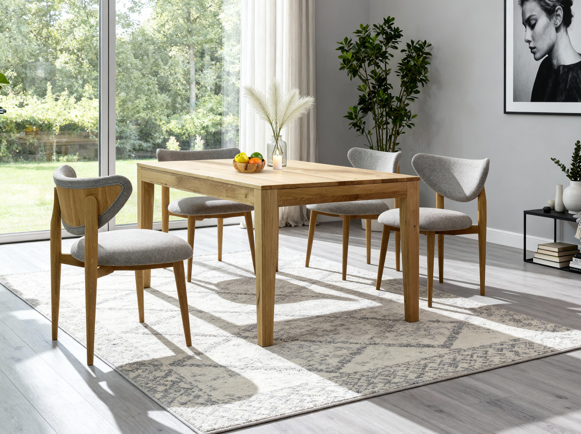 * A képen a Zeus bővíthető tölgyfa asztal 160 x 90, valamint a Beny tölgy szék szürke szövetben és sötét szövetben