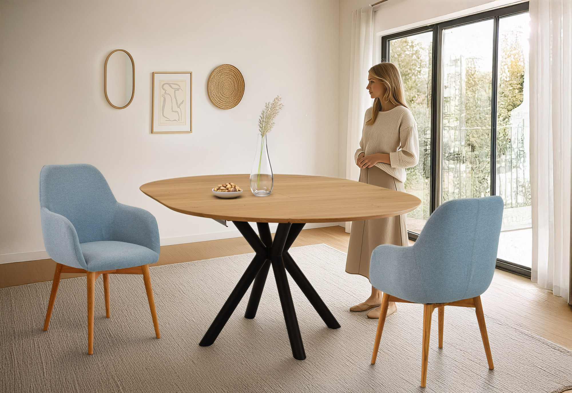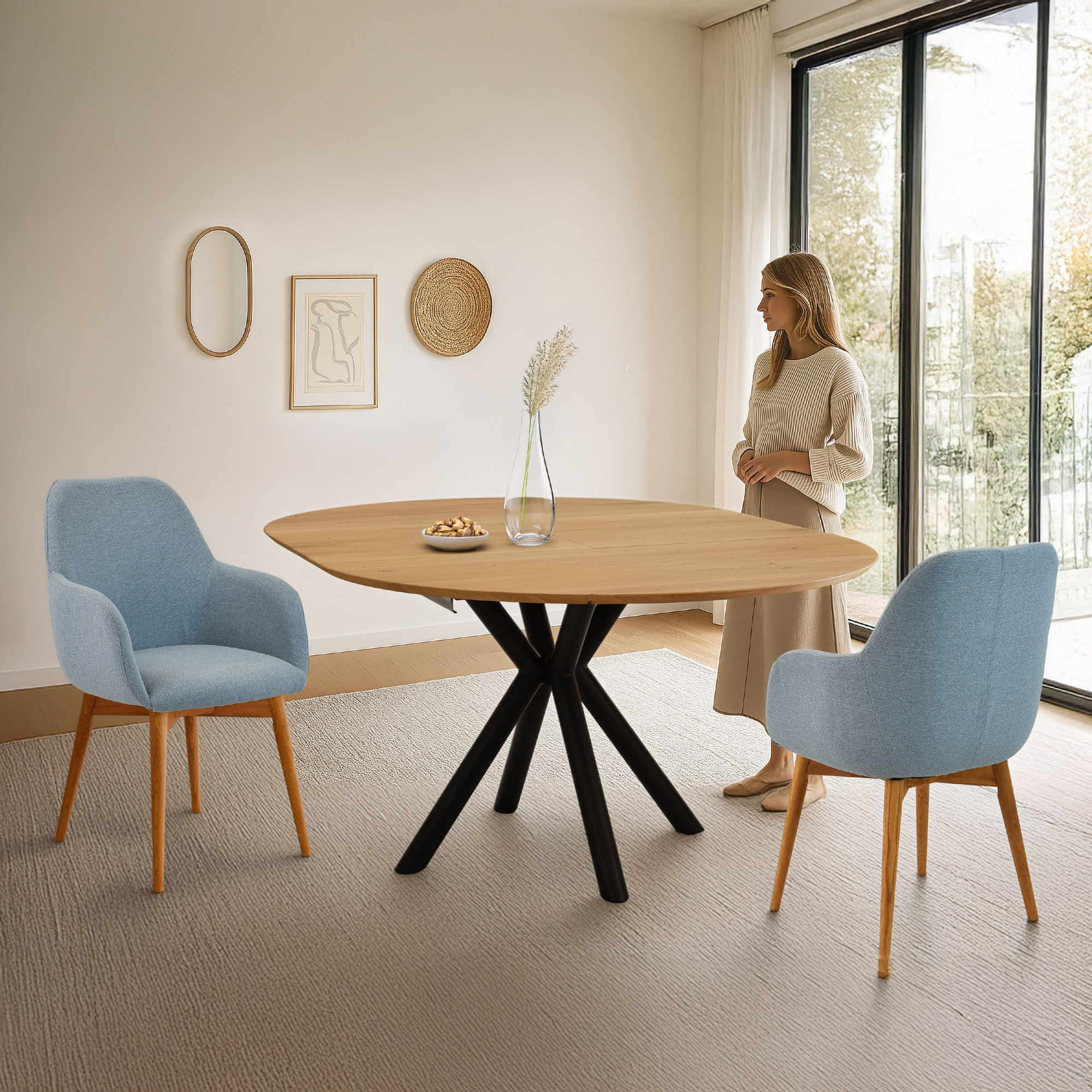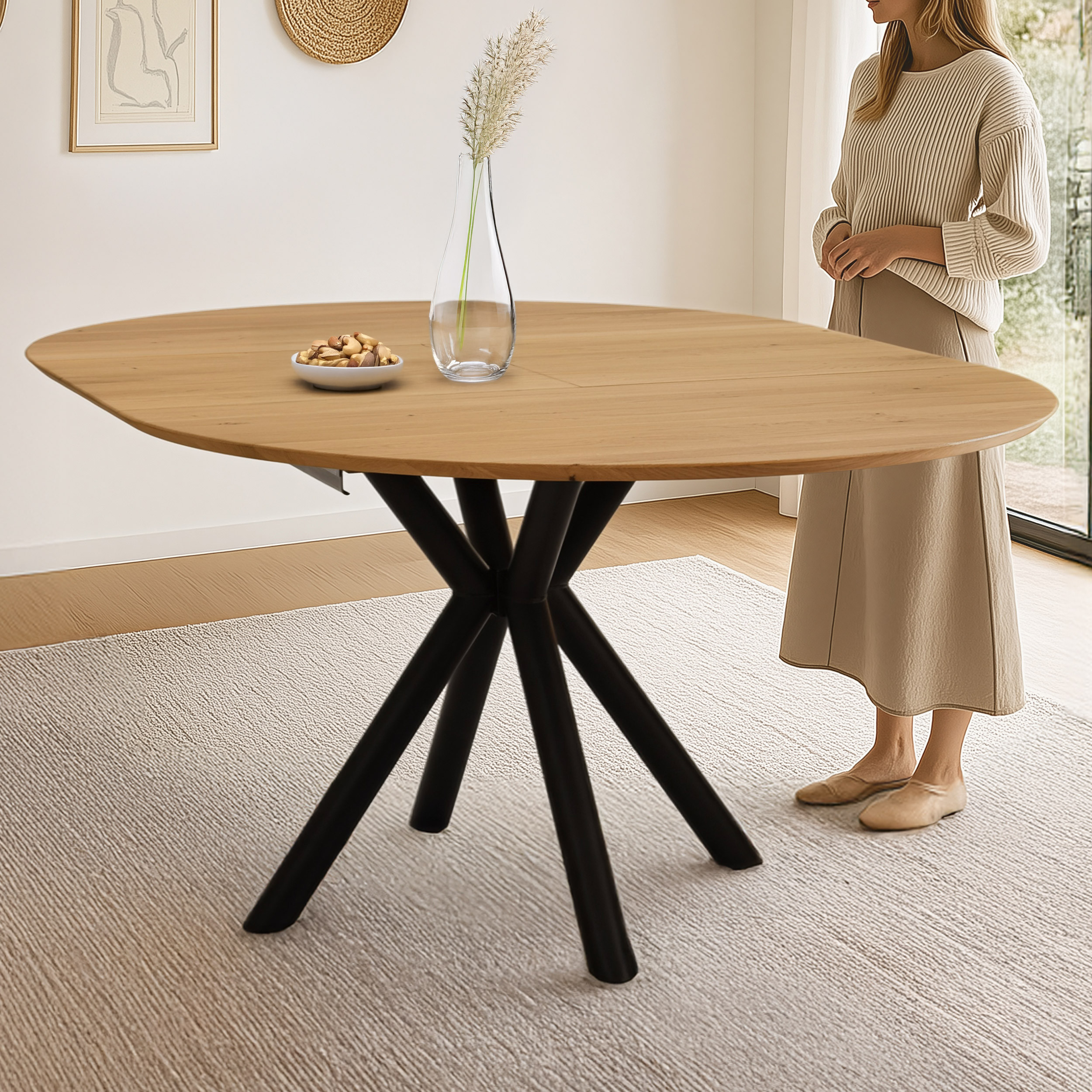 A kerek, kihúzható Karol asztal a hagyományos kézművesség és a modern funkcionalitás mesteri egyesítése. A 120 cm átmérőjű tömör tölgy asztallap melegséget és autentikus karaktert ad a belső térnek, míg a rejtett pillangómechanizmus néhány másodperc alatt ovális, 170 cm hosszú asztallá alakítja az asztalt – ideális nagyobb családi vagy baráti összejövetelekhez. A masszív fekete fém lábak elegáns kereszteződése könnyed ipari hangulatot kölcsönöz és stabilitást biztosít még teljes kihúzásnál is, anélkül, hogy kevesebb helyet hagyna a kényelmes ülésnek.