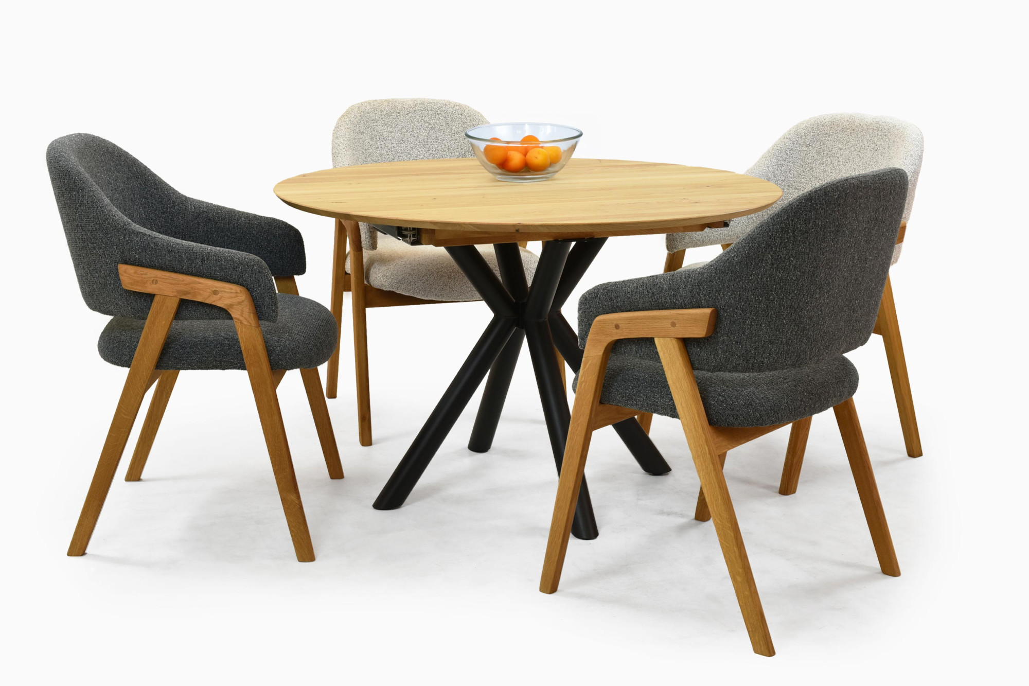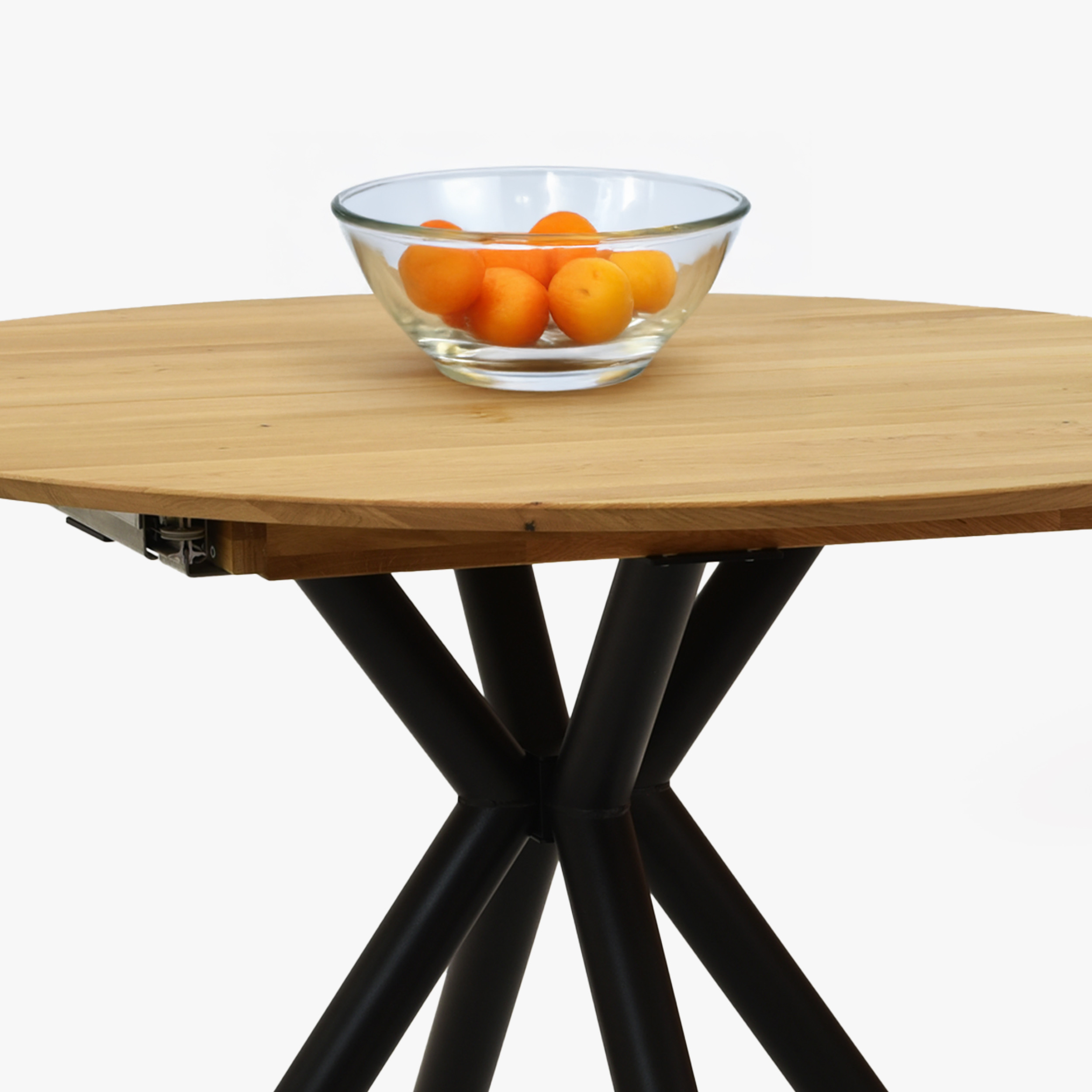 Kerek bővíthető tölgyfa étkezőasztal fekete fém lábakkal 120 cm
