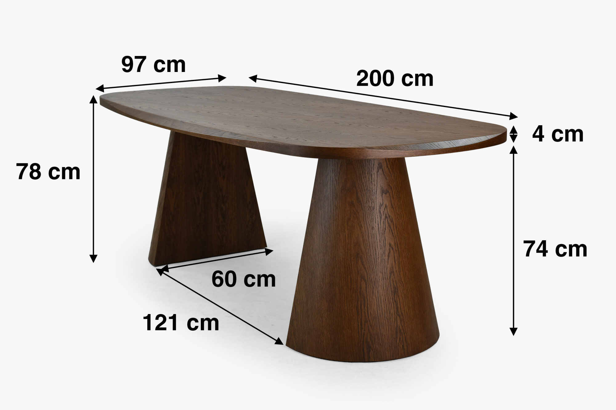 Bemutatjuk a kivételes étkezőasztalt elegáns lekerekített formával, amely az étkeződ szívévé válik. Ez a design asztal dió színben 200 cm hosszúságban első látásra megragadja figyelmet különösen masszív, 4 cm vastag asztallapjával és egyedi lábakkal, amelyek kétféle geometriai formában készültek – a kúpos és a piramis alakú láb eredeti és modern jelleget kölcsönöz az asztalnak. Az asztallap egész kerületén lekerekített élek biztosítják a biztonságot és a kellemes megjelenést.
