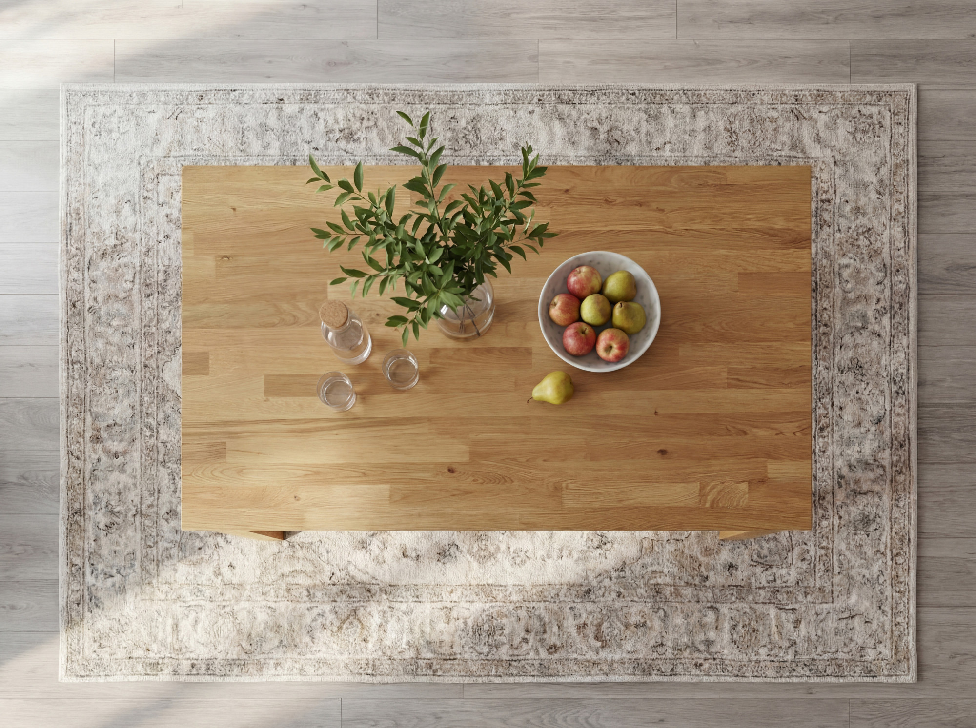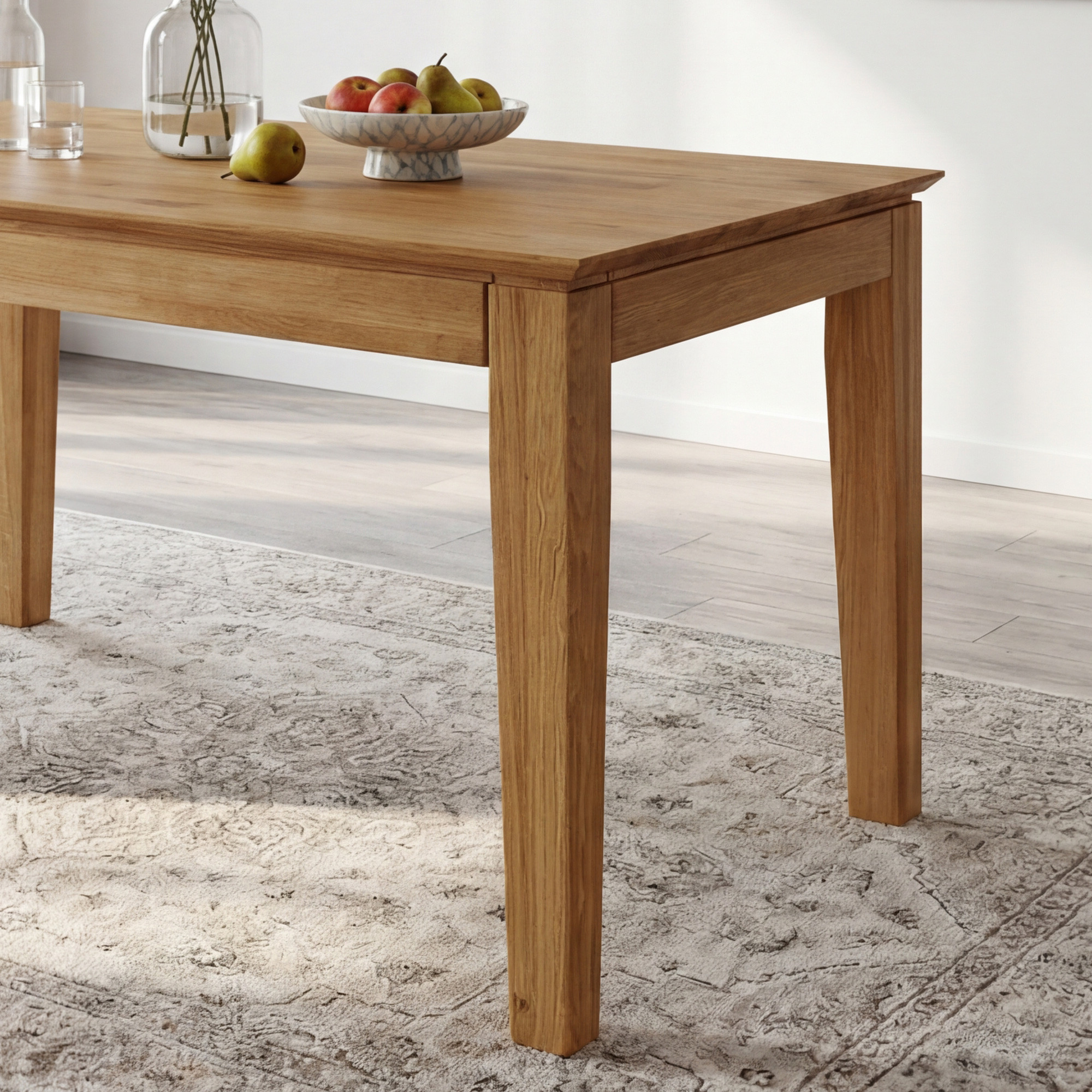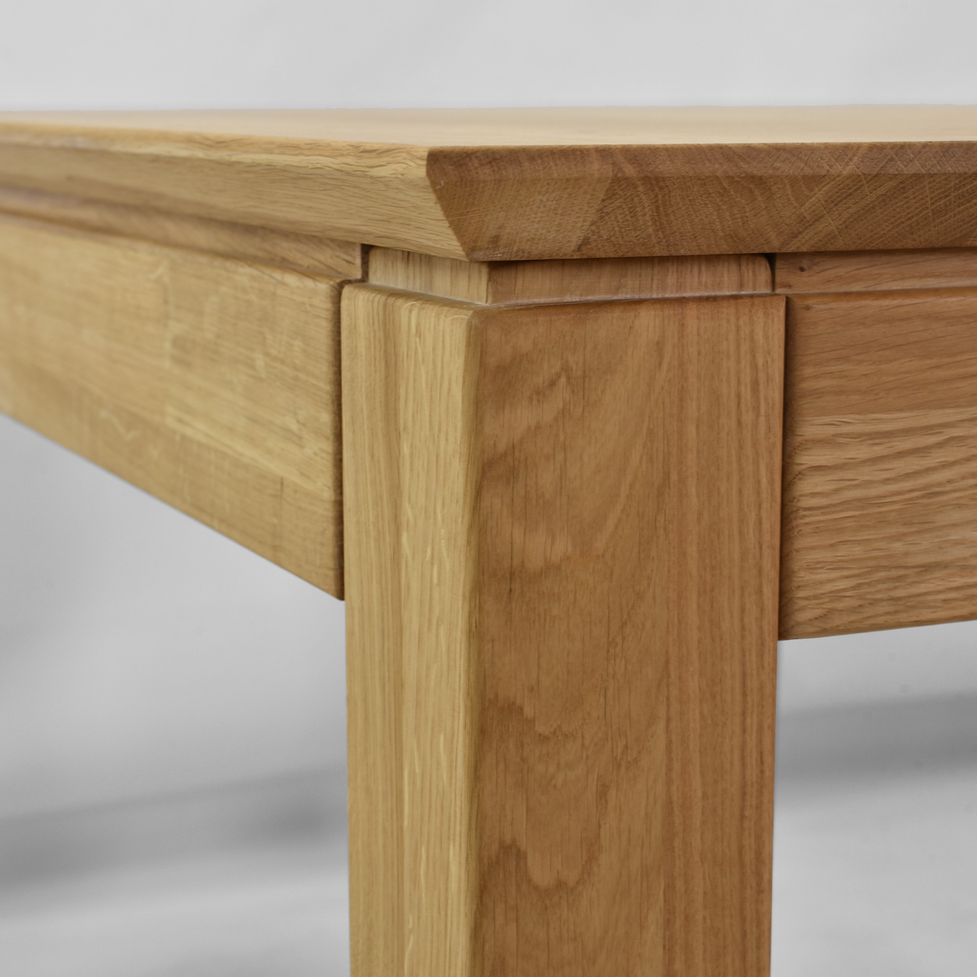 Az asztal fő előnye a maximális stabilitás még szétnyitás után is, hiszen az asztallábak szilárdan a helyükön maradnak – bővítéskor csak a felső lap mozdul el. Ez garantálja a stabilitást és a hely maximális kihasználását. Az asztallábak tölgyfából készülnek, és az egész váz szilárd és masszív. A felső lap tölgyfából készül, finger joint parketta mintával, amely kiemeli az anyag természetes rajzolatát. A felületkezelés természetes olajjal történik, amely védi a fát és egyedi megjelenést kölcsönöz neki.