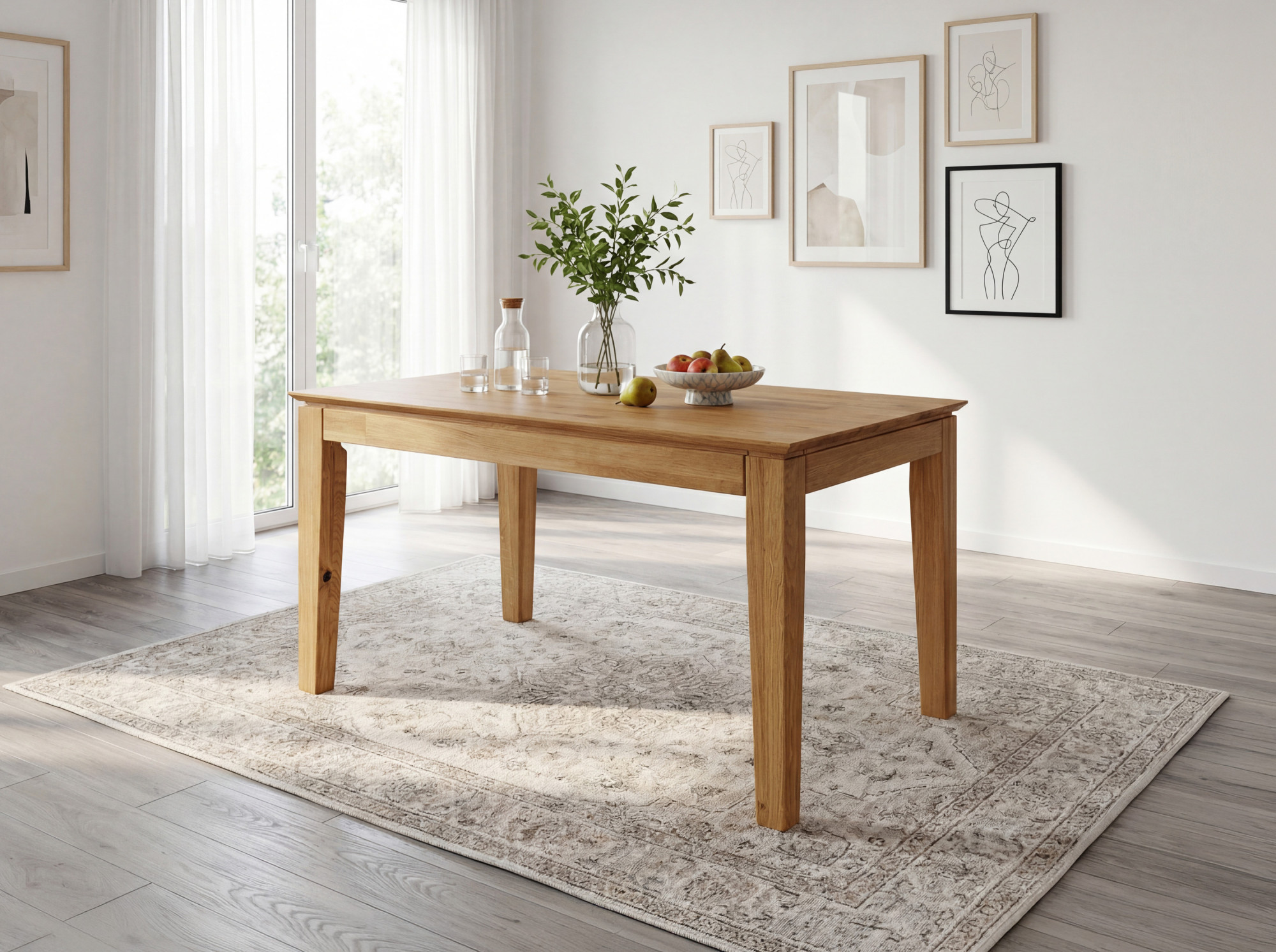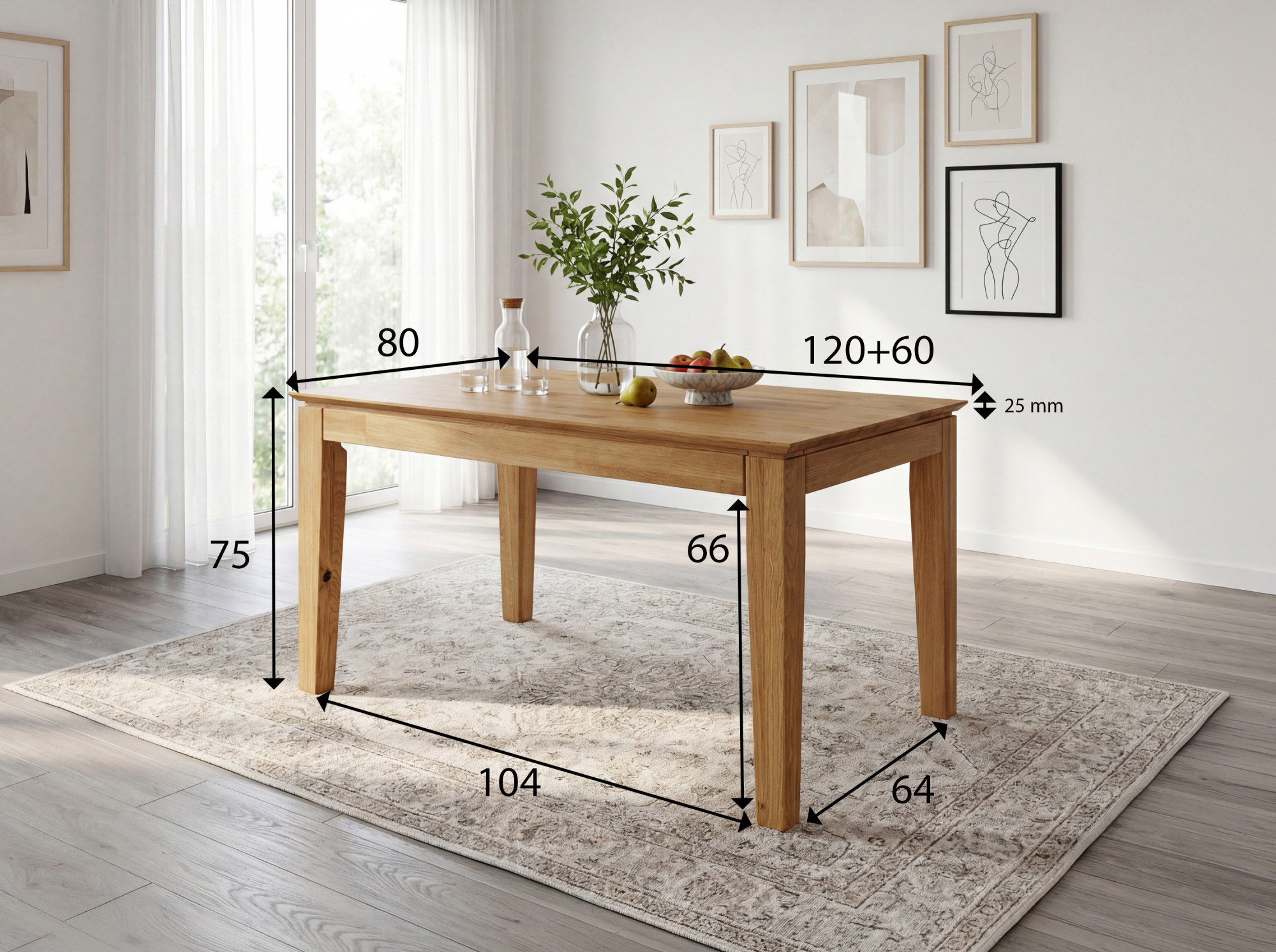 Ez a tölgyfából készült étkezőasztal tökéletes választás mindazoknak, akik elegáns és praktikus megoldást keresnek ebédlőjükbe. Az asztal alapmérete 120 x 80 cm, amely ideális a mindennapi használathoz. Bővíthető funkciójának köszönhetően az asztal könnyedén nagyobbítható 180 x 80 cm-re, így akár 6–8 személy számára is kényelmes teret biztosít. Az asztal egyik előnye a teljesen tömör fa kivitel, amely magas tartósságot és hosszú élettartamot garantál. A bővítő mechanizmus okosan rejtve van az asztal belsejében, ami hozzájárul az elegáns megjelenéshez.