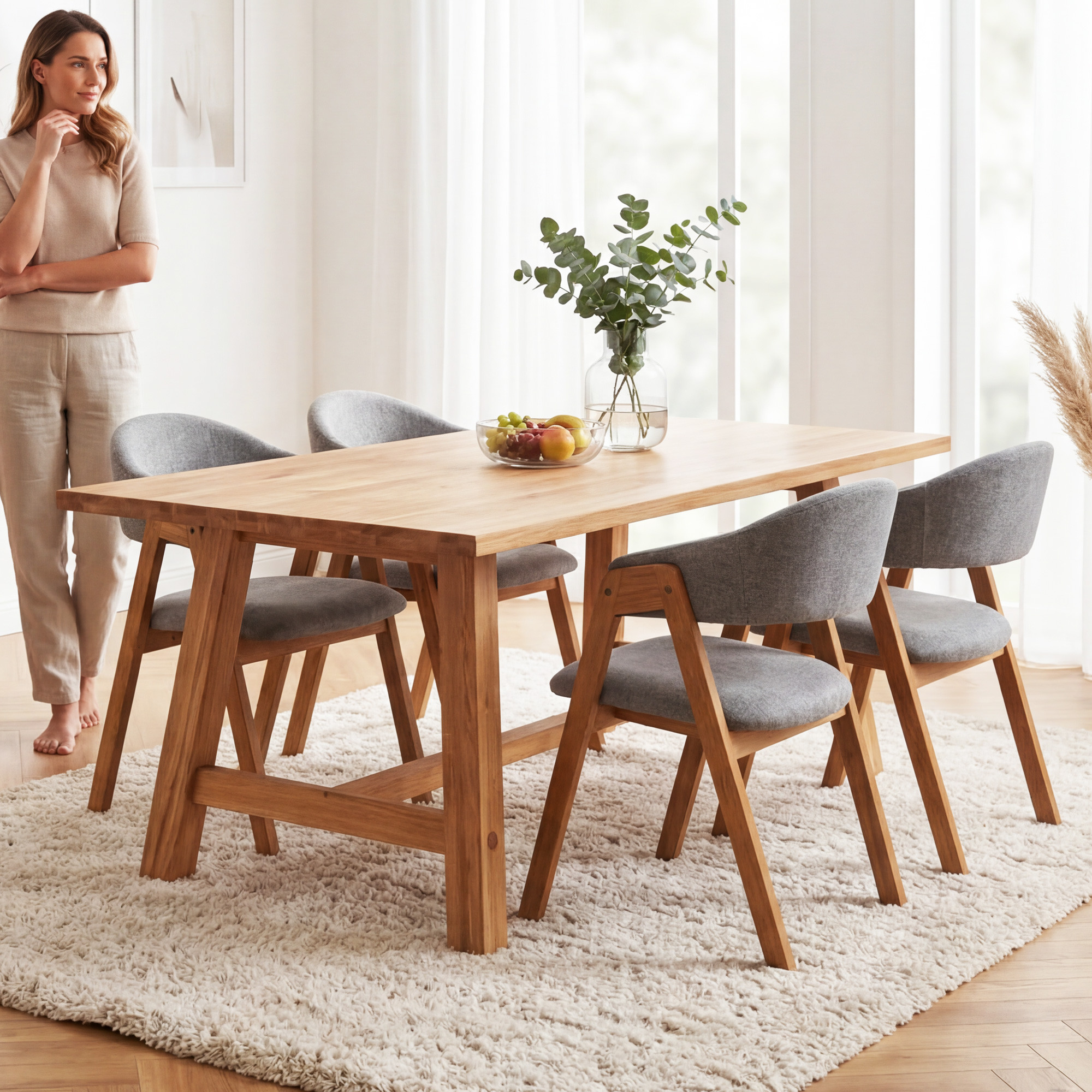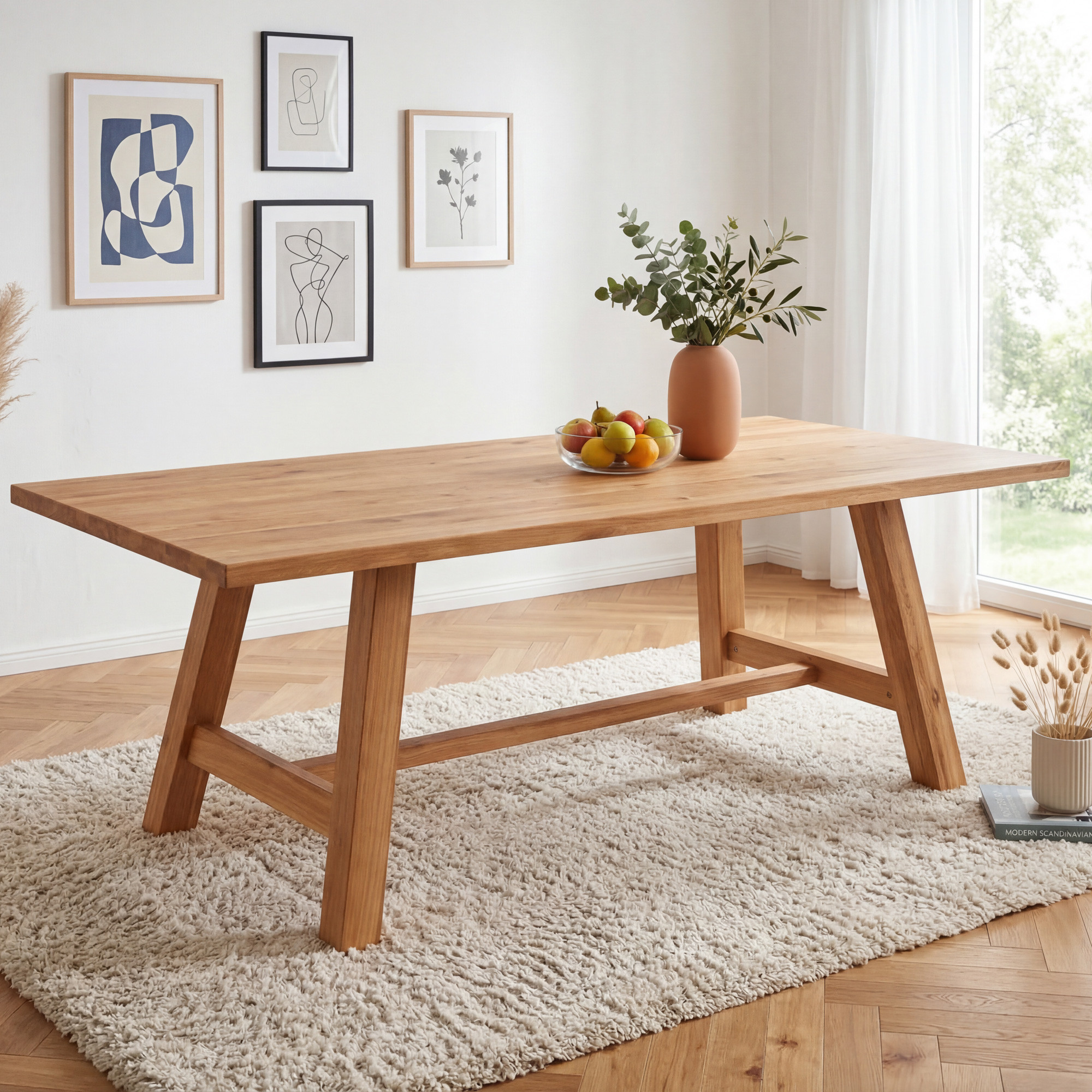 A felületet kiváló minőségű olajjal kezeltük, amely védi a fát és kiemeli annak természetes struktúráját és meleg árnyalatát. Az olajozott felület kellemes tapintású és évek múltán is egyszerűen felújítható. A lábtér magassága 71,3 cm kényelmes ülőhelyet biztosít akár étkezéshez, akár munkához. A lábtávolság 140 cm a hosszabb oldalon elegendő helyet biztosít minden ülő számára. Az asztal ideális választás étkezőbe, konyhába vagy tágas nappaliba, ahol a belső tér hangsúlyos központjává válik.