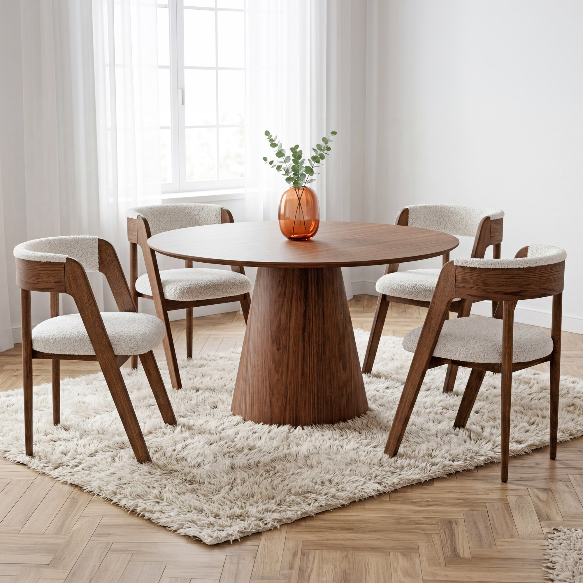 Keresi azt a kerek étkezőasztalt, amely a lakása hangsúlyos dominánsává válik? Ez a design asztal 120 cm átmérővel első látásra felkelti a figyelmet kifinomult bordó-dió színével és minimalista formájával. Az asztallap egy látványos kúpos központi lábon nyugszik, amely modern és légies karaktert kölcsönöz a bútornak. A meleg dió-vörös árnyalat luxus és otthonosság érzetét hozza a helyiségbe. A 120 cm-es átmérőnek köszönhetően kényelmesen leülhet 4–5 osob közösen étkezni anélkül, hogy az asztal túl sok helyet foglalna.