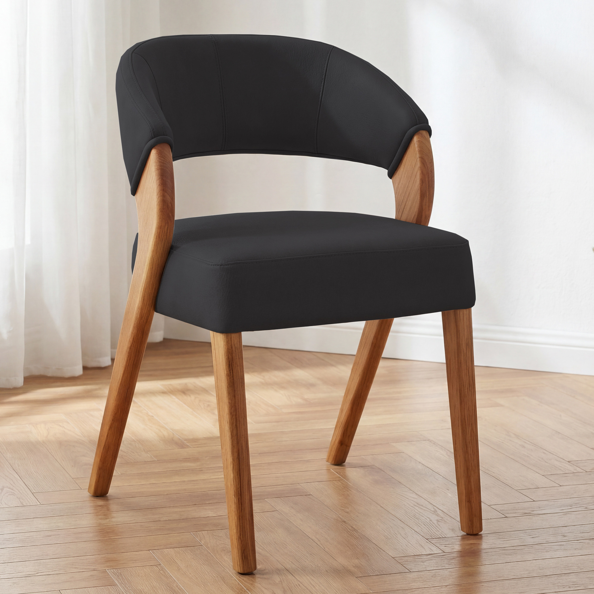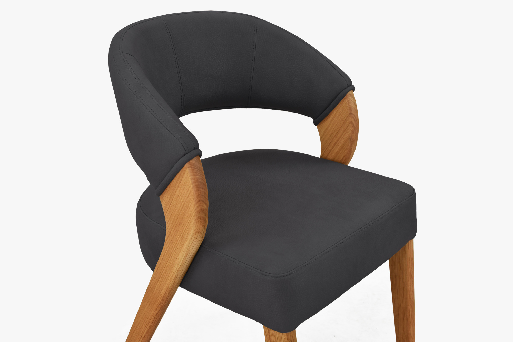 Bemutatjuk ezt a design étkezőszéket, amelyet a fekete kárpit és a tömör tölgy meleg árnyalatának elegáns kontrasztja tesz különlegessé. Az ívelt háttámla és a kényelmes ülőfelület, amelyet strapabíró Texas fekete szövet borít, kifinomult karaktert kölcsönöz a belső térnek. A tömör tölgyfa lábak természetes olajjal kezelve harmonikusan kiegészítik a sötét bevonatot, így vizuálisan is lenyűgöző egységet alkotnak. Az ergonomikusan kialakított háttámla hosszabb, közös vacsorák alkalmával is biztosítja a kényelmes ülést az asztalnál.