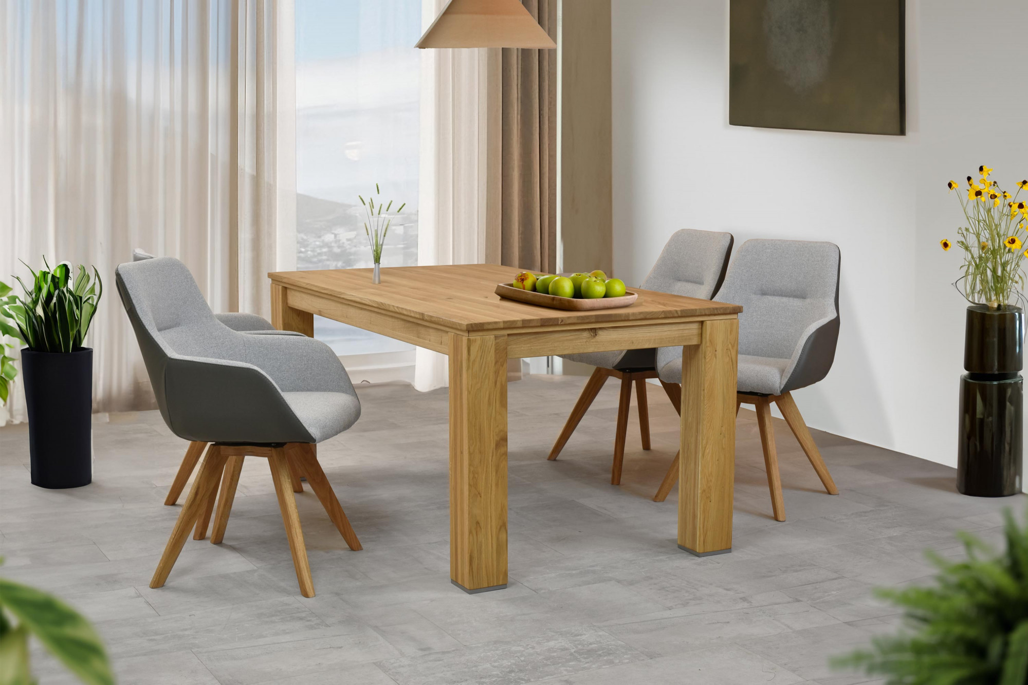 Modern étkezőszék forgatható ülőrésszel ideális kiegészítő otthonába. A szék lábai tölgyfából készültek, melyeket természetes olajjal, tölgy natural színben kezeltek, így nemcsak szép megjelenést, hanem hosszú élettartamot is biztosítanak. Ez a szék különböző típusú belső terekhez alkalmas, és könnyen kombinálható más tölgyfa bútorokkal. Az FSC fa tanúsítványnak köszönhetően biztos lehet benne, hogy székét fenntartható forrásokból szerzik. Az ülőrész forgatható, ami növeli a funkcionalitást és kényelmes használatot tesz lehetővé az étkezőasztalnál vagy akár az íróasztalnál. A szék hátsó részén található sötétszürke anyag elegáns hatást kelt és kellemesen utánozza a természetes bőrt, míg az ülőfelület elülső részén lévő szürke anyag modern megjelenést kölcsönöz és kényelmes ülést biztosít. A Colmar szék kiváló választás azoknak, akik stílusos, kényelmes és funkcionális bútort keresnek otthonukba.