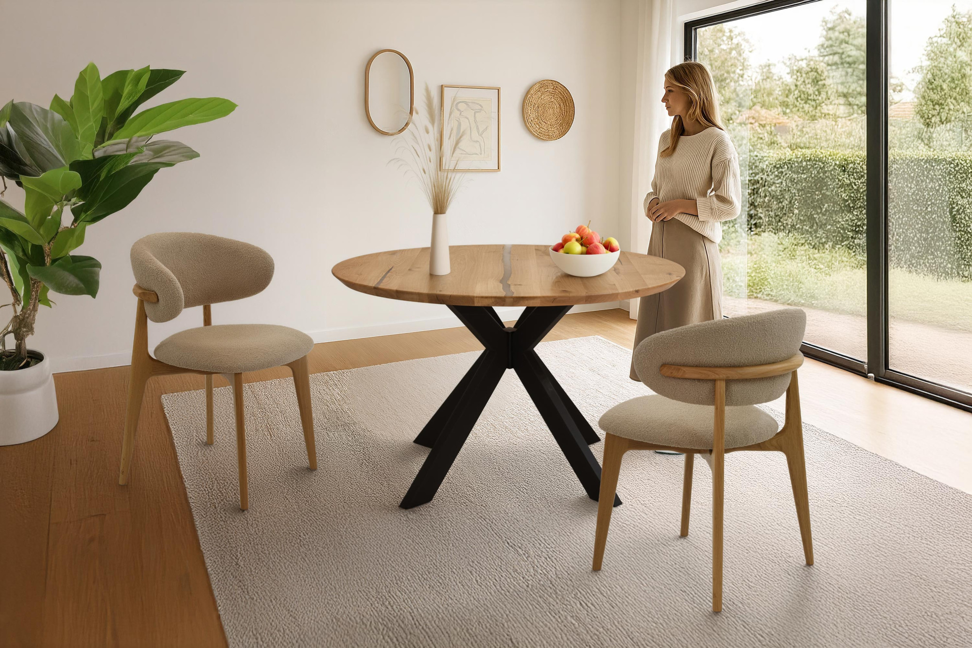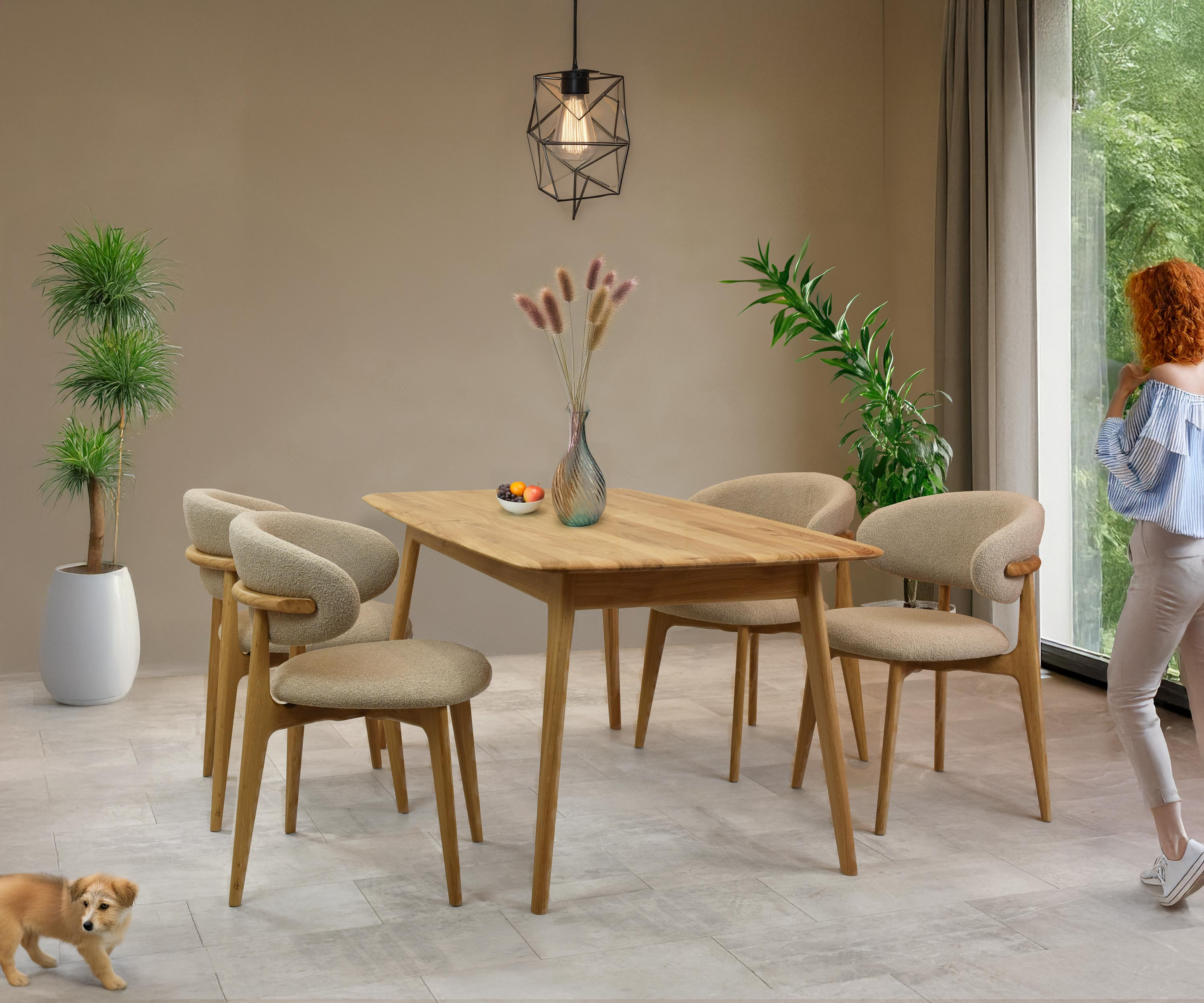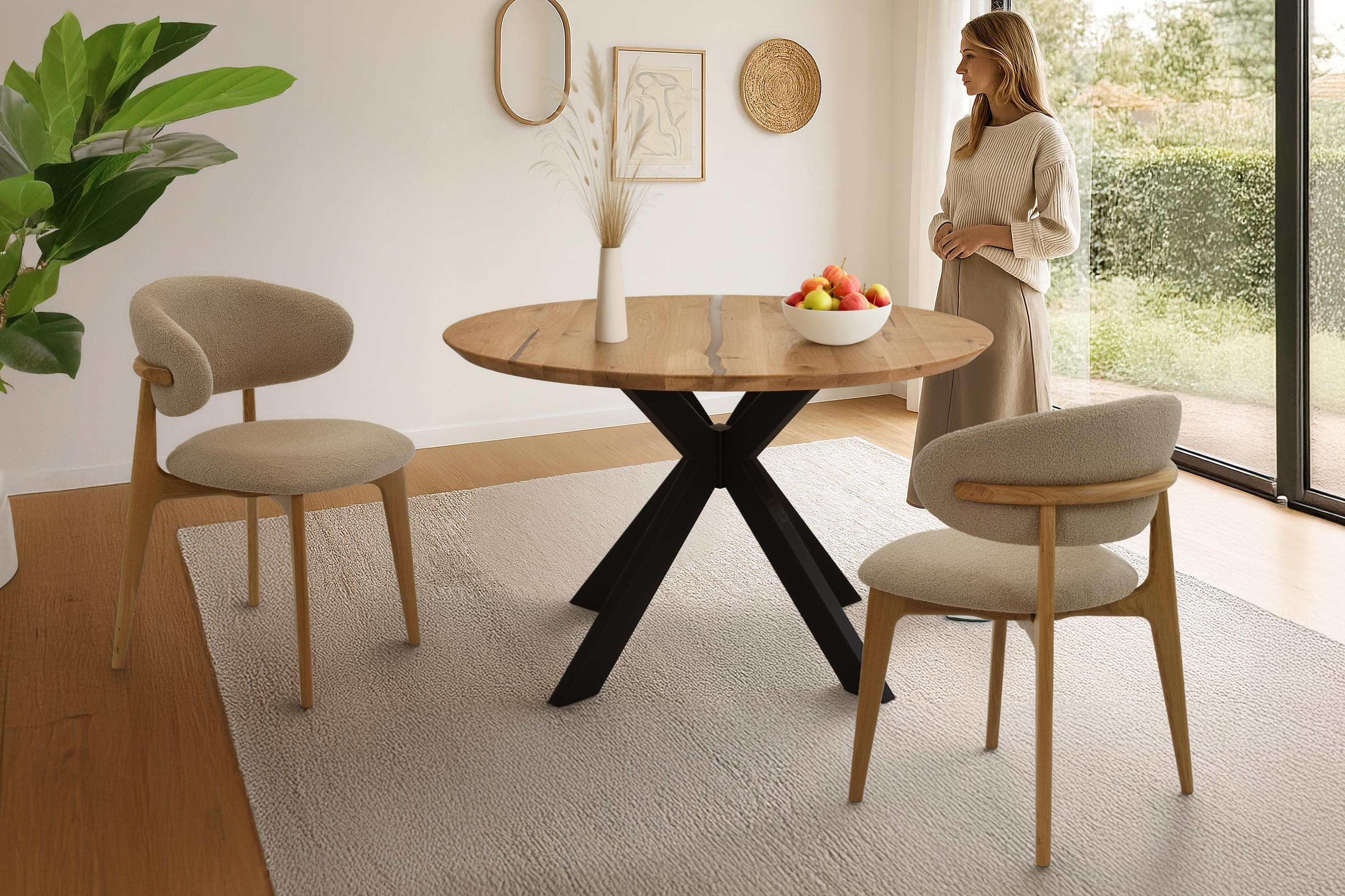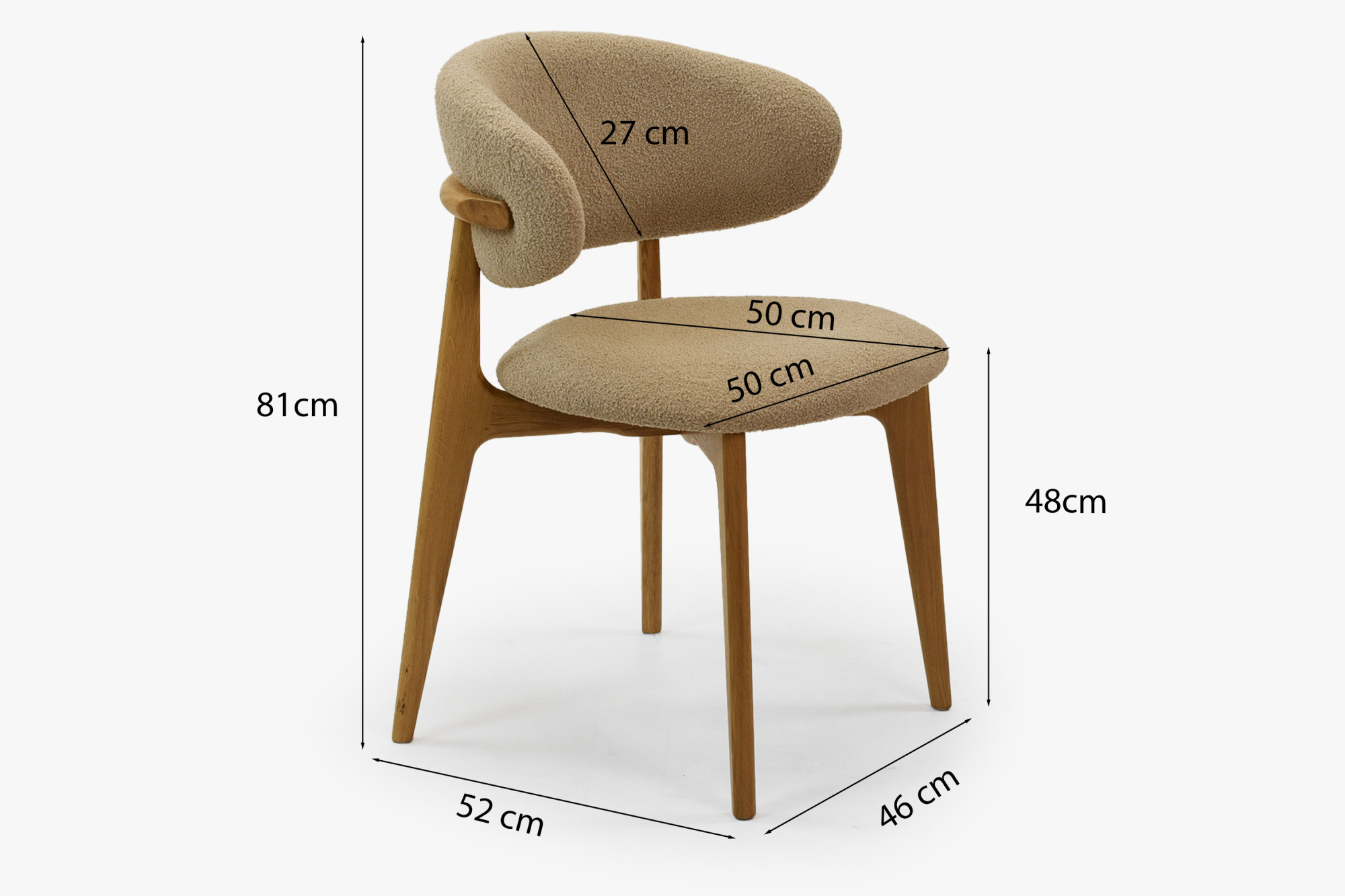 Prémium tölgyfa szék Rose ideális választás azoknak, kteří hledají elegáns, kényelmes és természetes ülőbútorra. Ez a luxus szék tömör tölgyfából készül, amely ismert szilárdságáról, hosszú élettartamáról és esztétikus mintázatáról. A felületet matt lakkal tölgy natural árnyalatban kezeltük, amely kiemeli a fa természetes szépségét, és egyben védelmet nyújt a nedvesség és a szennyeződések ellen. A háttámla és az ülőfelület bézs-barna árnyalatú bouclé típusú puha anyaggal van kárpitozva, amely simogatószerű, érintésre rendkívül kellemes és könnyen tisztítható semleges pH-jú szappanos vízzel.