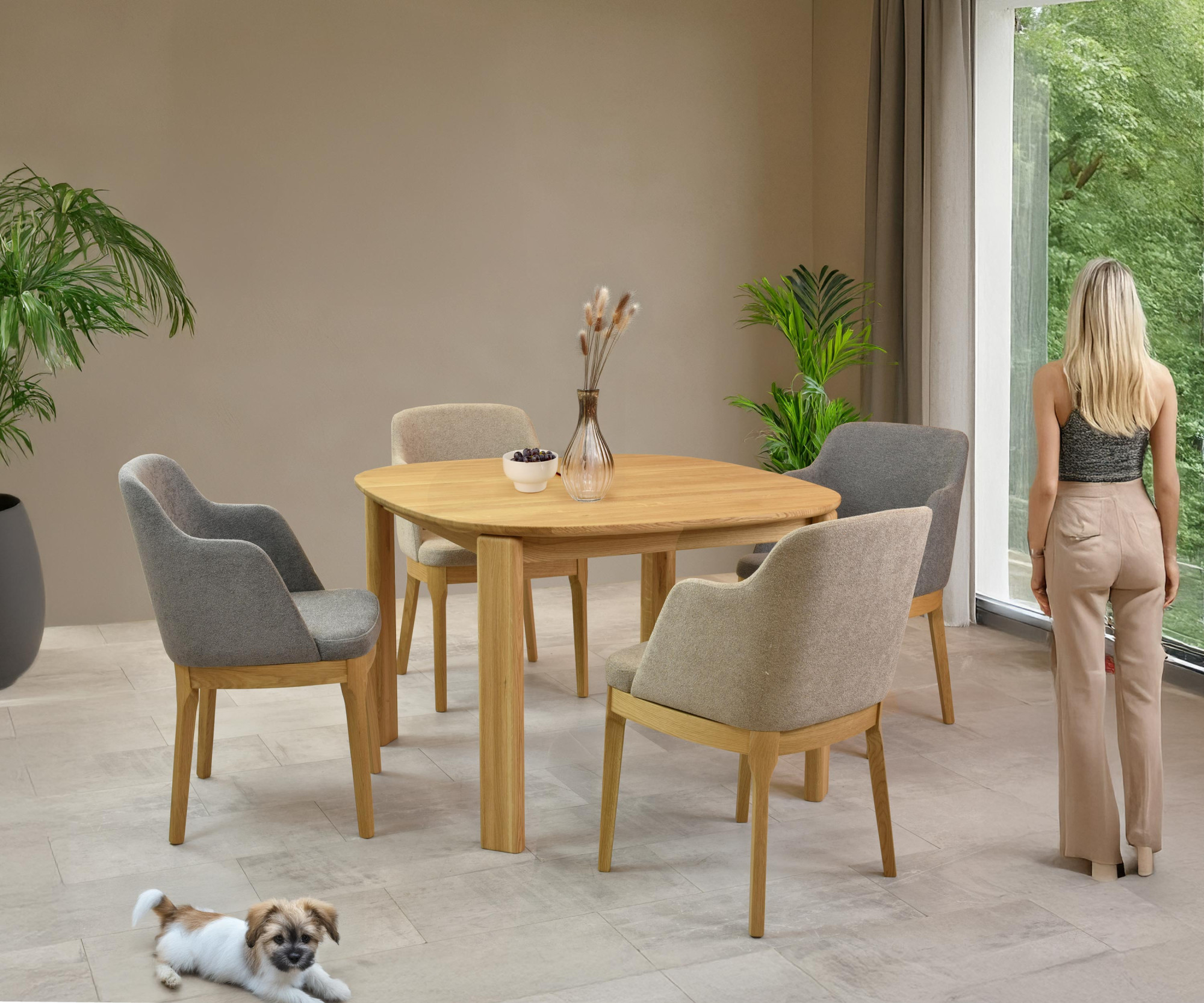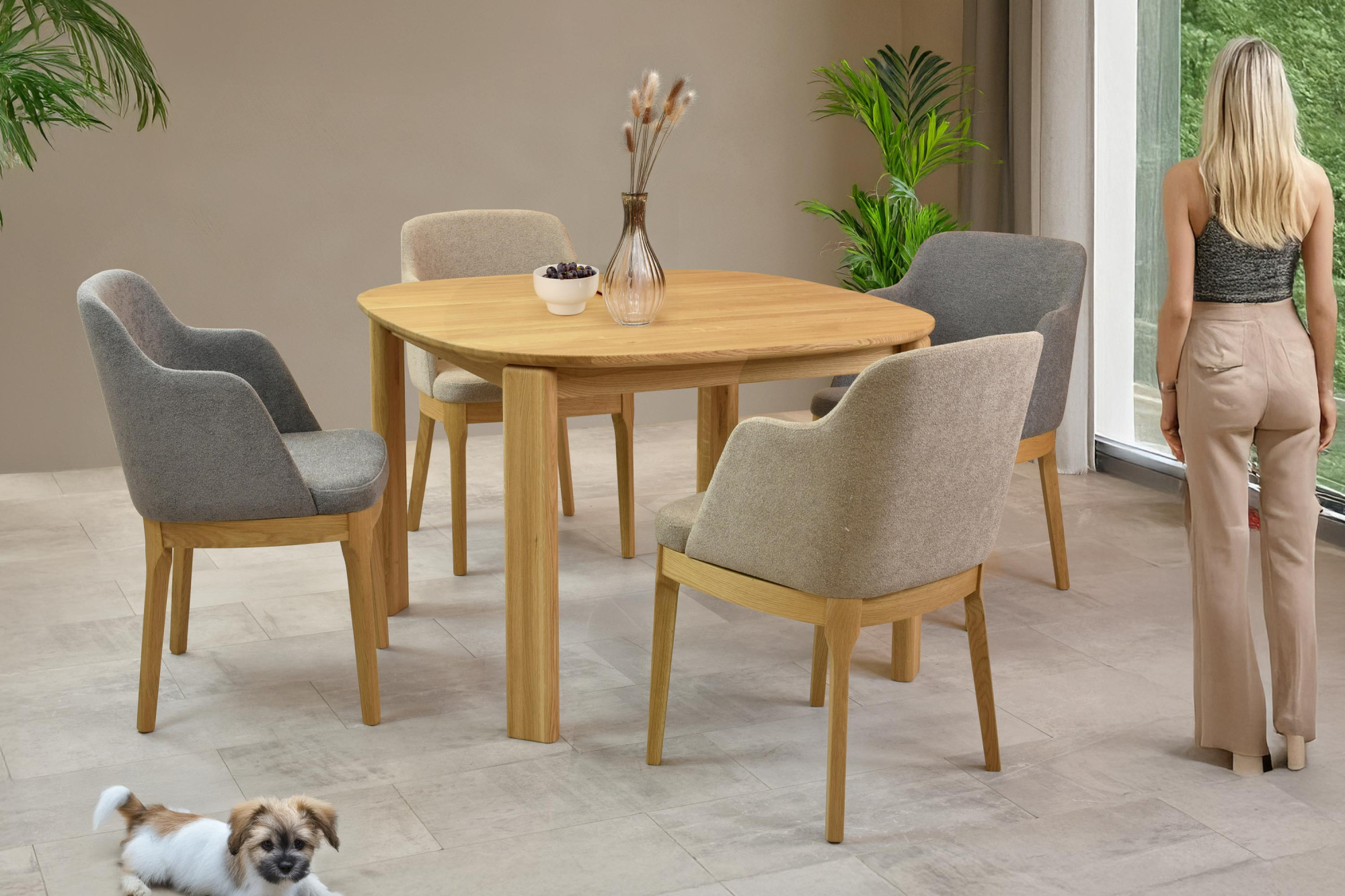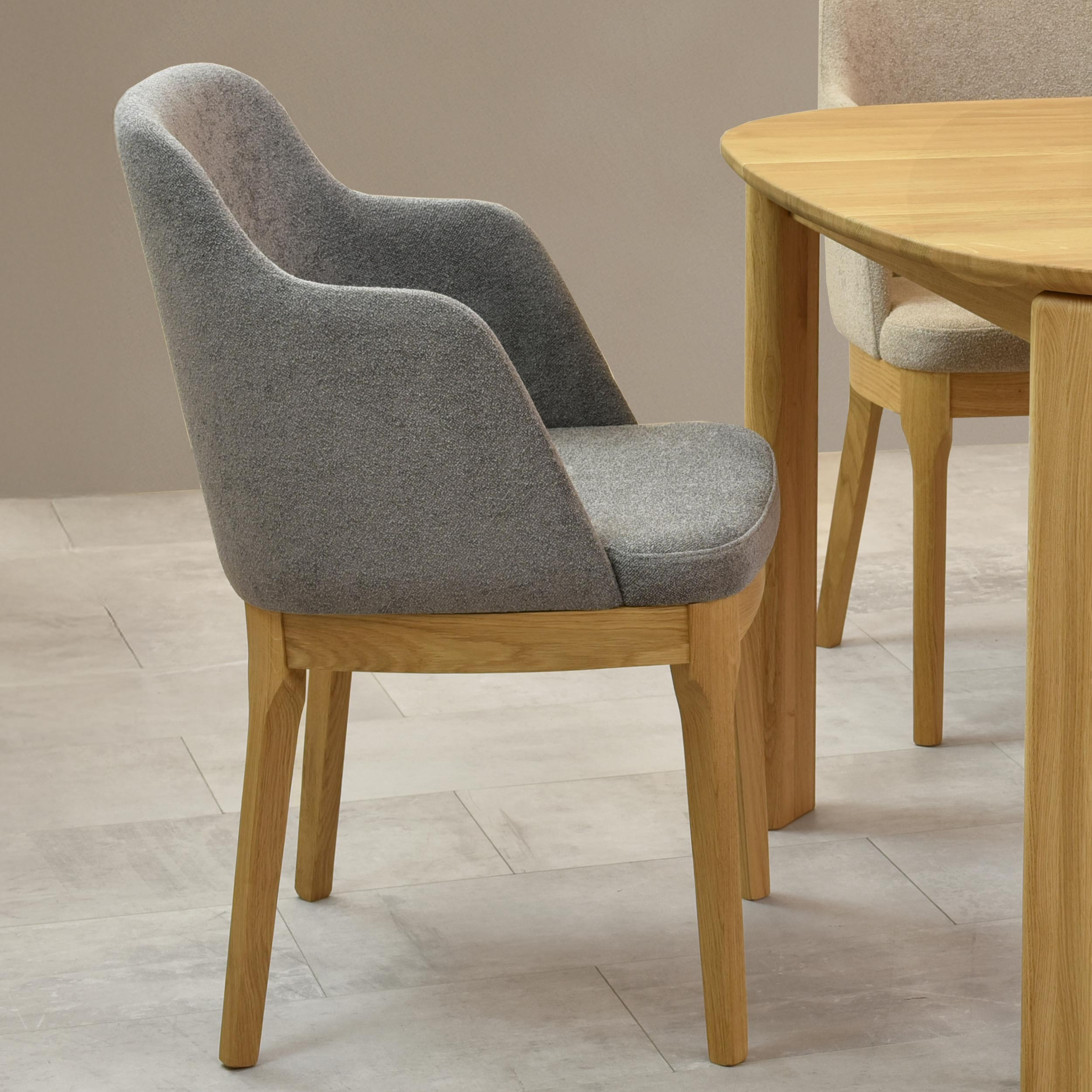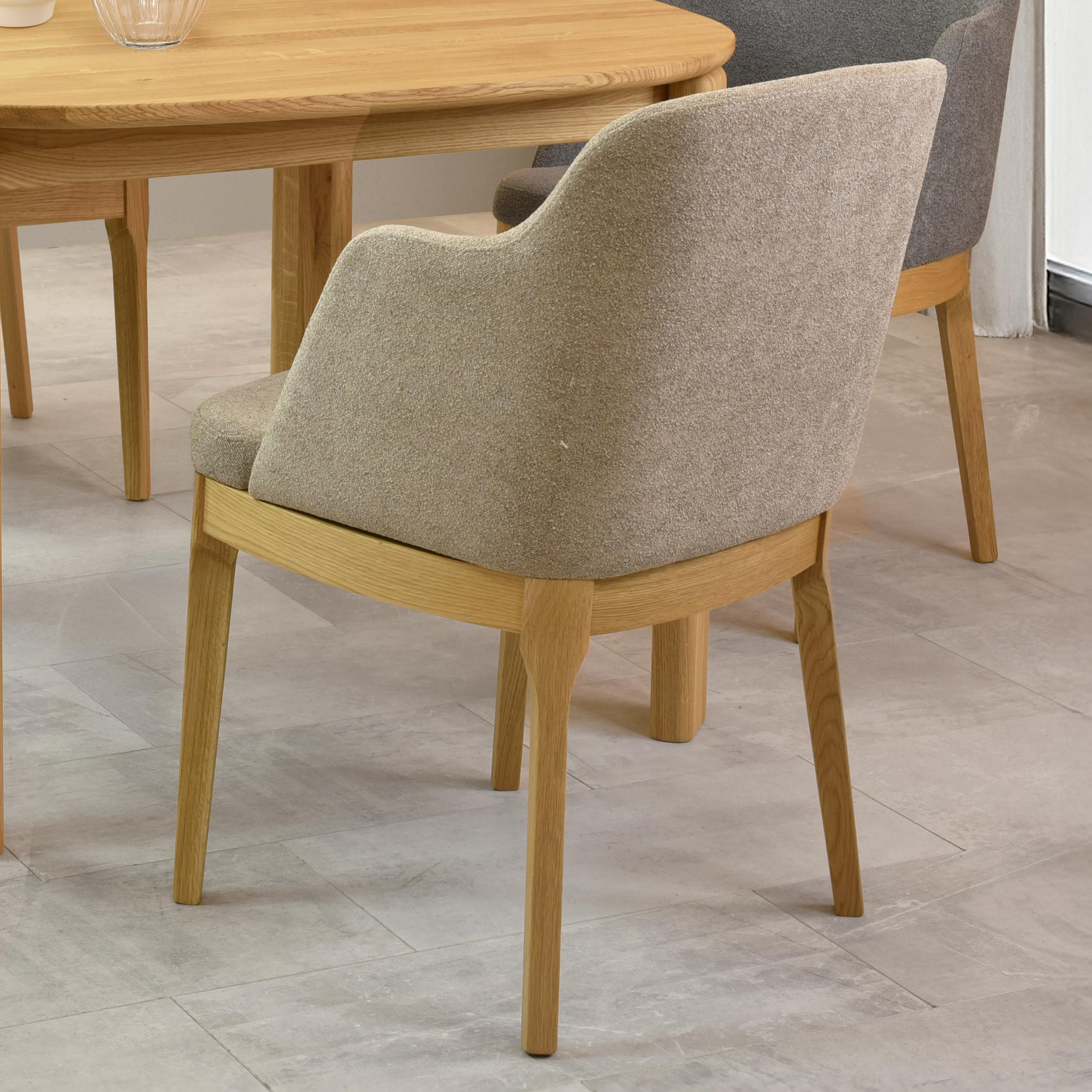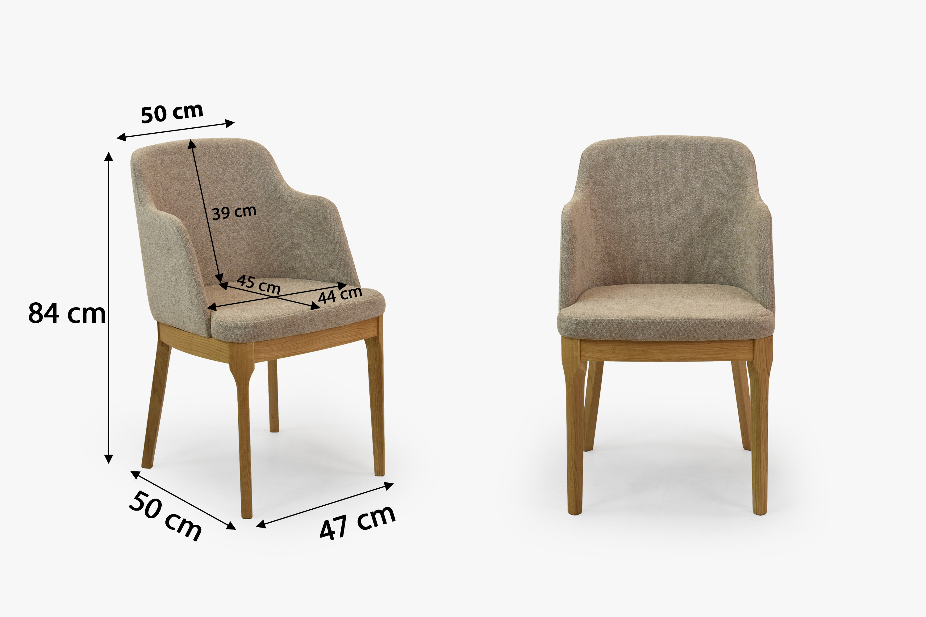 Az ergonomikusan formázott háttámla és a kárpitozott ülőlap kivételes ülési kényelmet biztosít, amelynek köszönhetően Ön és vendégei hosszú vacsorákat vagy munkamegbeszéléseket élvezhetnek kényelmetlenség nélkül. Az anyag FSC tanúsítvánnyal rendelkezik (FSC certifikát), így vásárlásával a fenntarthatóan kezelt erdőket támogatja. A tölgyfotel könnyen összehangolható más tölgybútorokkal, legyen szó asztalok, komódok vagy polcok esetén, ami megkönnyíti egy harmonikus és időtálló belső létrehozását. A tartós kárpitszövet ráadásul könnyen karbantartható – tisztításhoz általában elegendő az enyhe porszívózás vagy egy nedves ronggyal való áttörlés.