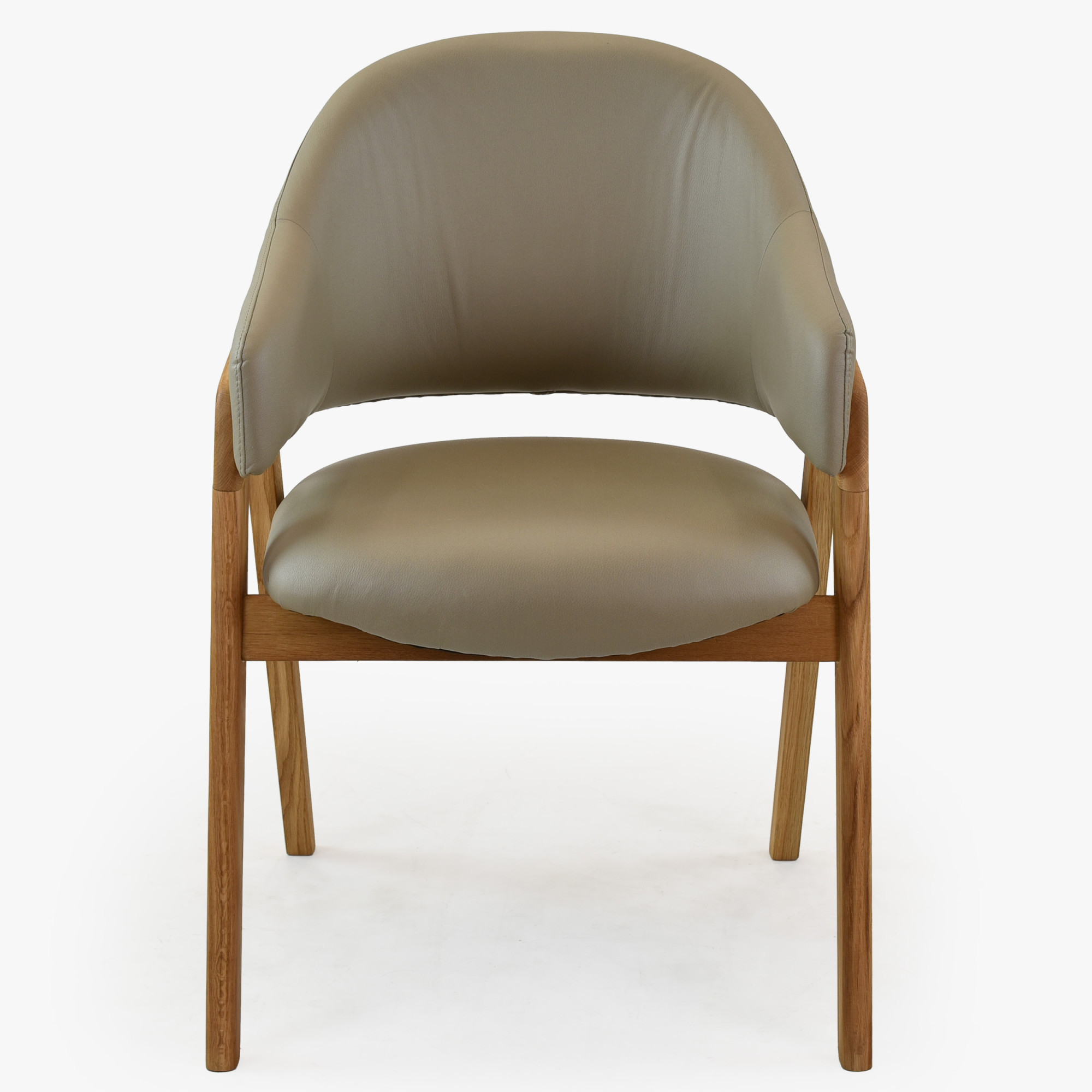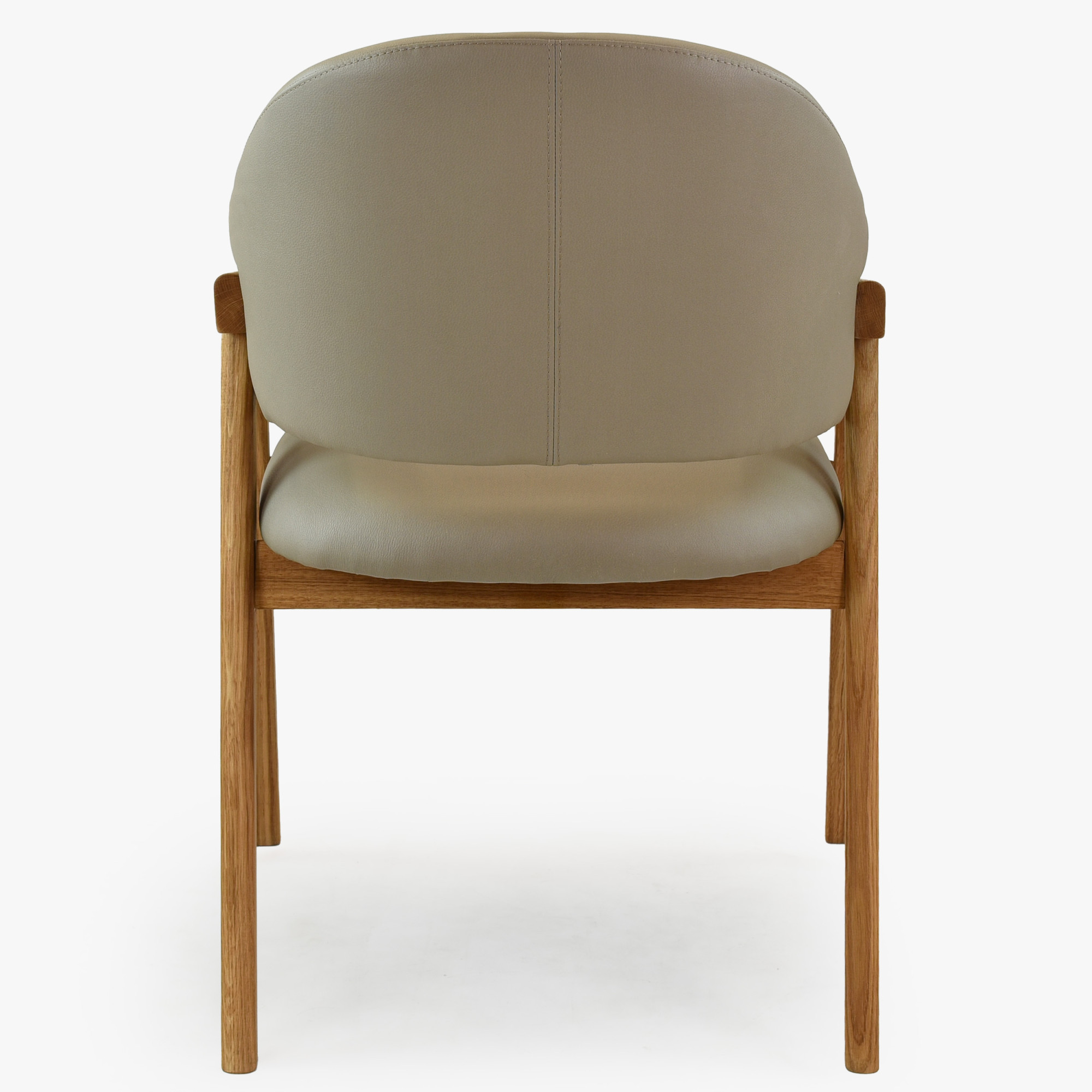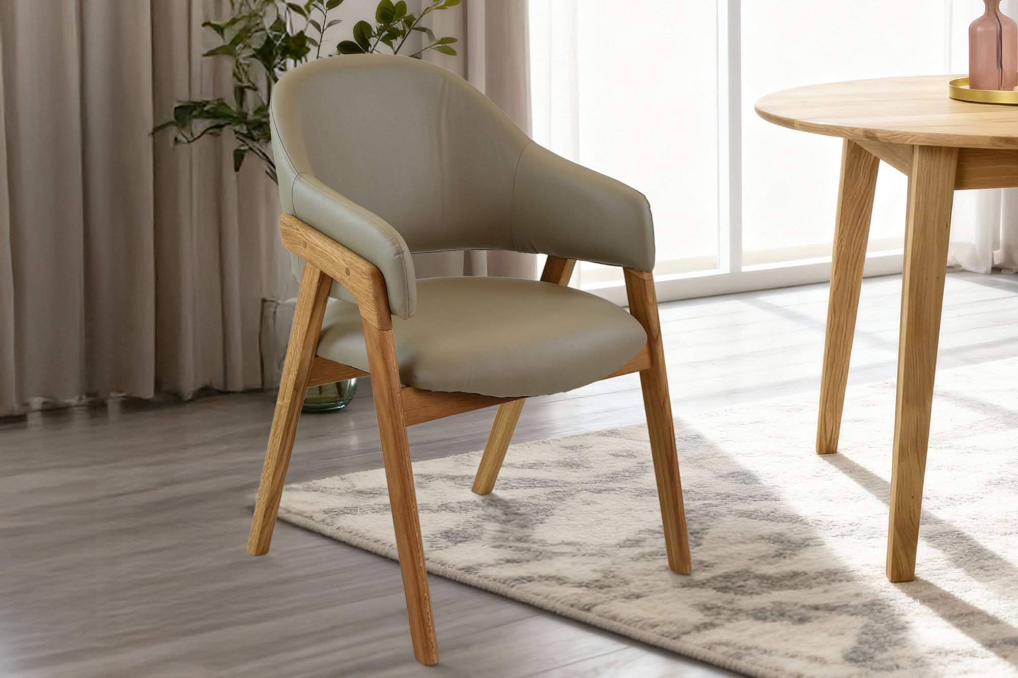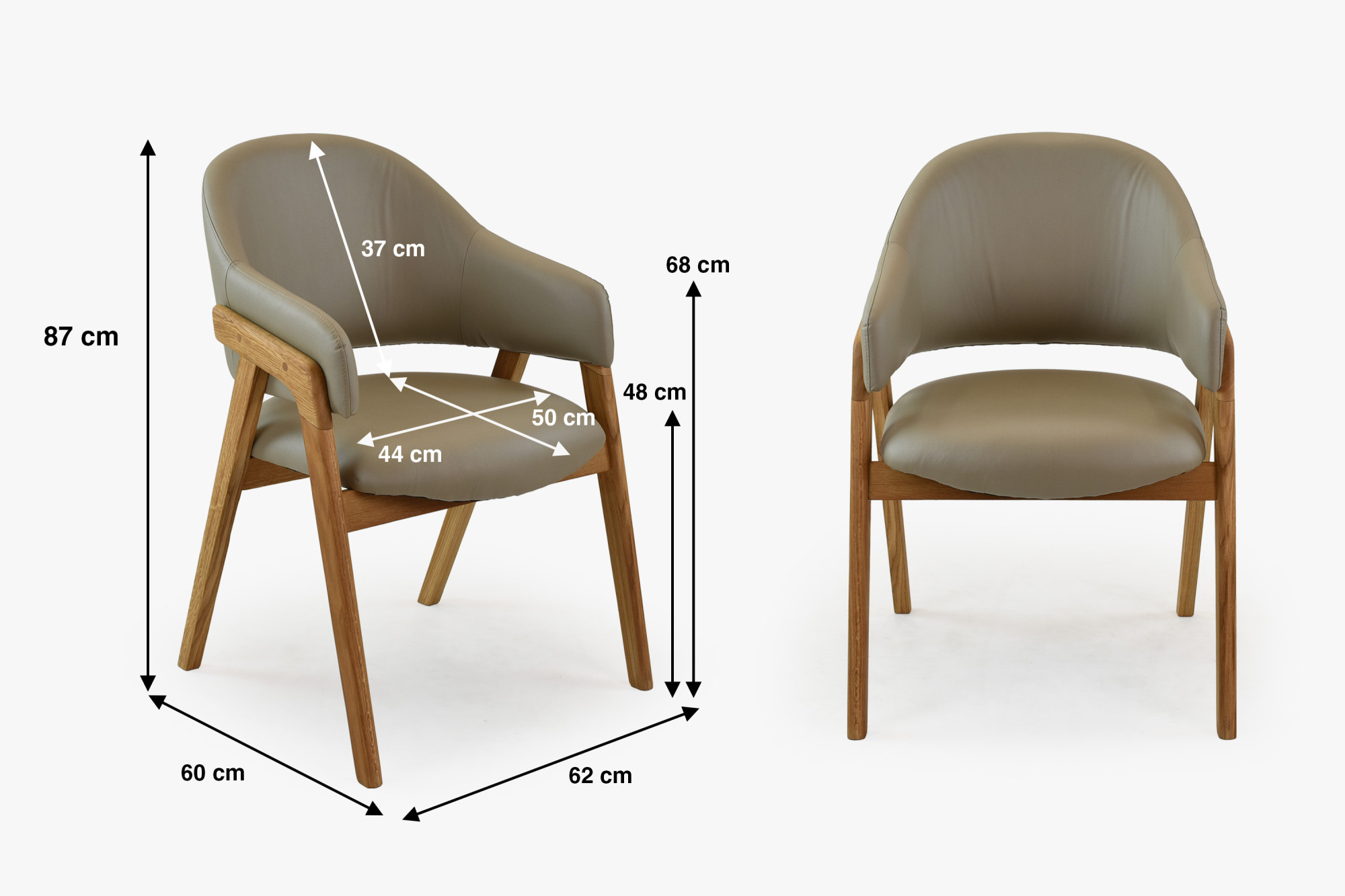 Fedezze fel a természetes otthon luxusát tölgyfa étkezőszékünkkel karfákkal, amely ötvözi a hagyományos kézműves kidolgozást a modern dizájnnal. Ez a masszív tölgyfából készült, kárpitozott szék kiváló minőségű natúr tölgyszínből készült, gondosan ápolt, prémium dán olajjal kezelve, amely kiemeli a fa természetes karakterét és erezetét. Az ülőrész és a háttámla kiváló minőségű vegán bőrrel kárpitozott, amely tökéletesen utánozza a valódi bőr megjelenését, ugyanakkor könnyebb a karbantartása és környezetbarátabb. A szék számos kárpit színváltozatban elérhető, így kiválaszthatja azt, amely tökéletesen illik otthonába.