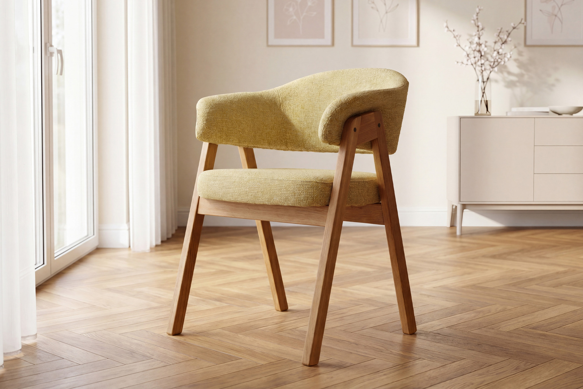 Tölgyfa karfás szék Mona, sárga – kárpitozott tömörfa étkezőszék