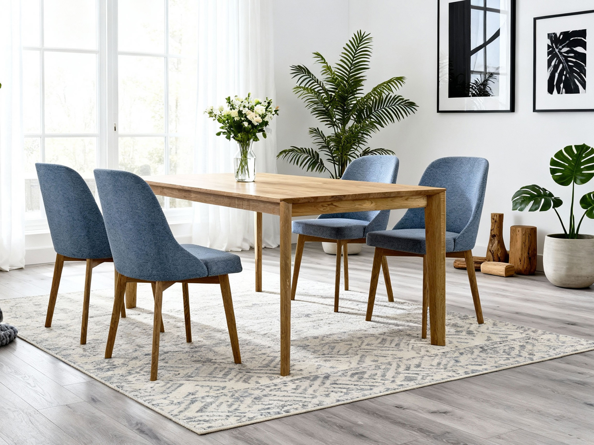 * A fényképen tölgy asztal 180 x 90 Monako és Milis étkezőszék kék szövetben.