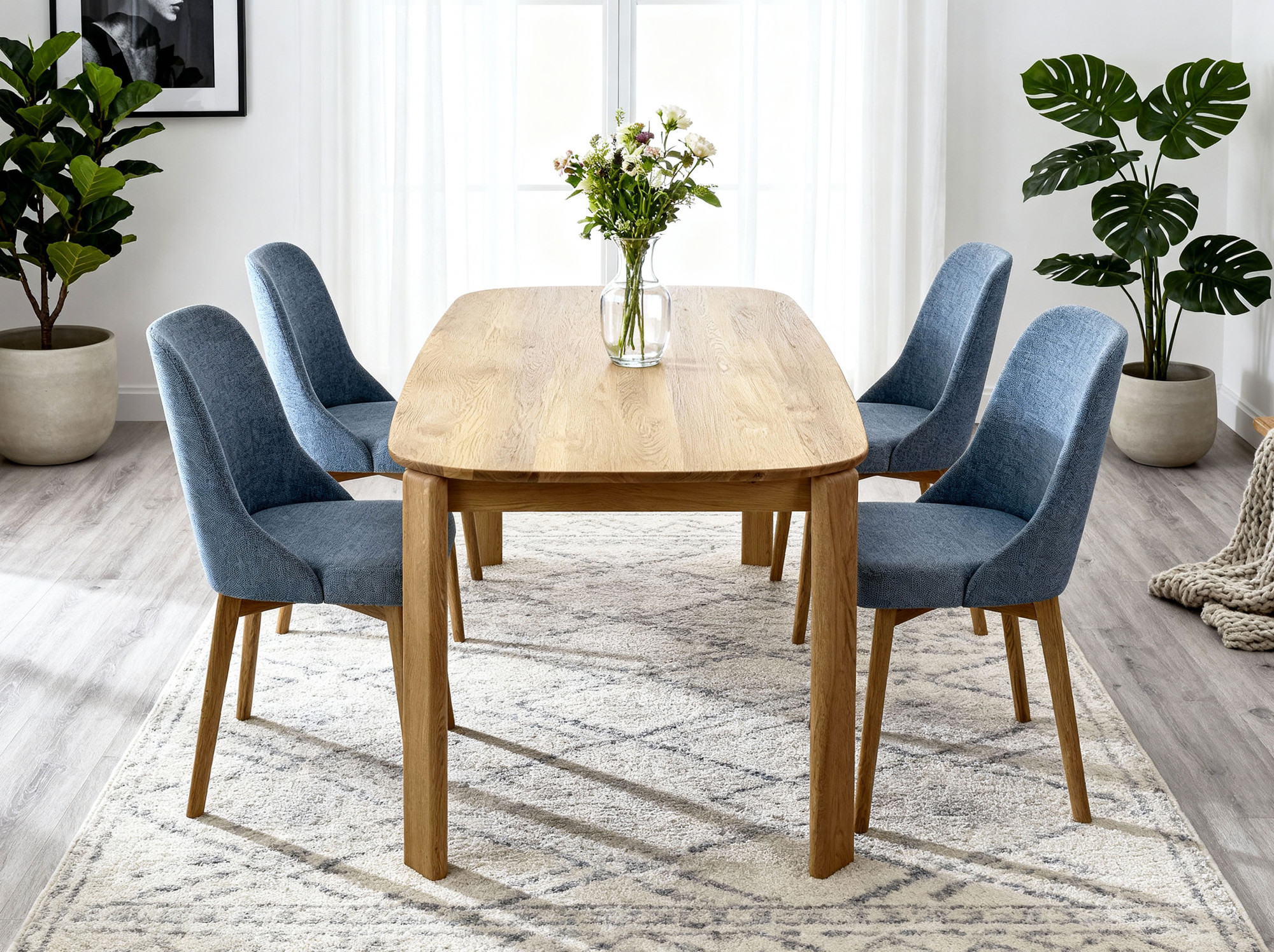 * A fényképen tölgy asztal 180 x 90 Countryside és Milis étkezőszék kék szövetben.