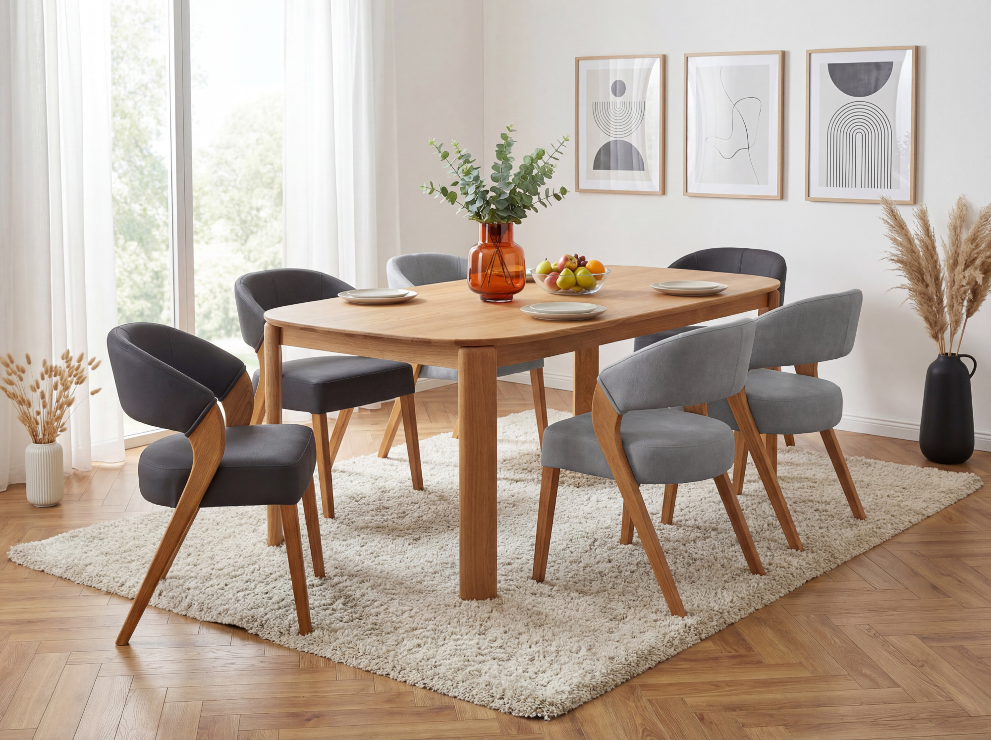 A Texas huzat 100% poliészterből, grammázsa 480 g/m², a legellenállóbb kárpitozott anyagok közé tartozik – a Martindale-teszten 60 000–70 000 ciklust ér el. A pilling-állóság 4. fokozatnak felel meg, és a száraz dörzsölésnél mért színstabilitás a legmagasabb, 5. fokozatot kapta. Az egész teherhordó szerkezet FSC-minősítésű tömör tölgyfából készült, ami a szilárdság és az anyag felelősen kezelt eredetének garanciája. A szék teljesen összeszerelve érkezik – kicsomagolás után azonnal az asztalhoz állítható.