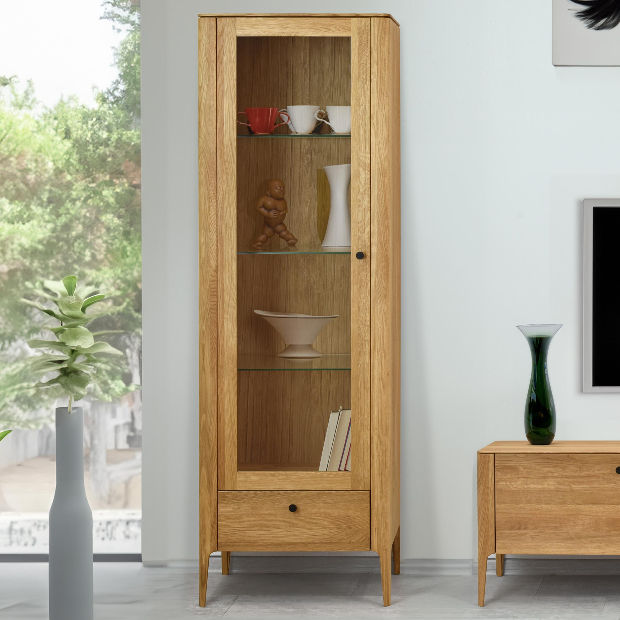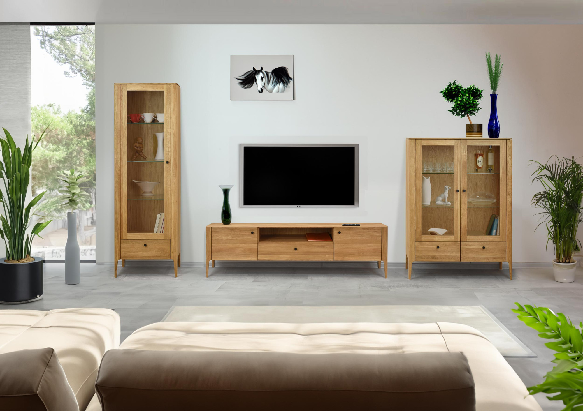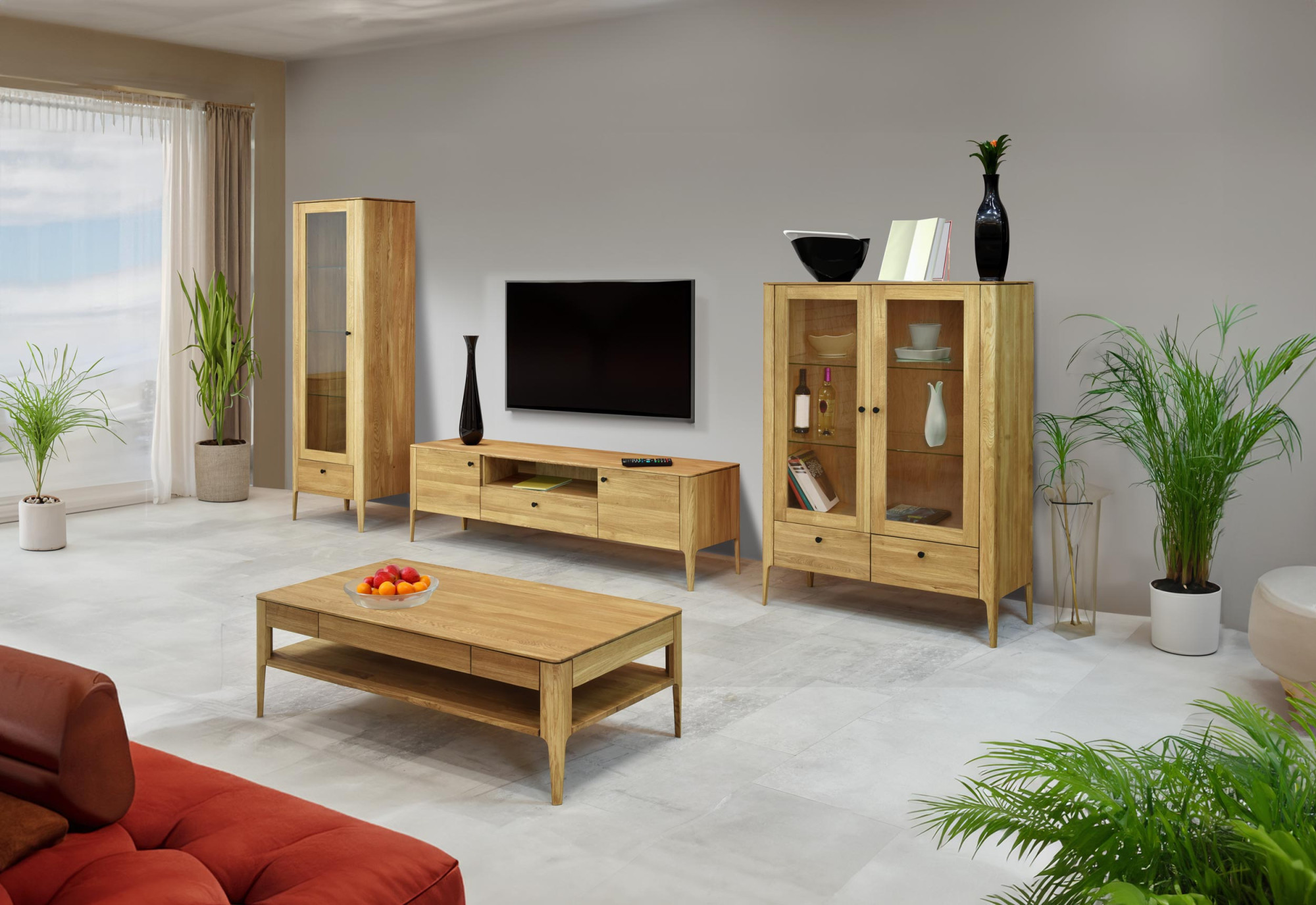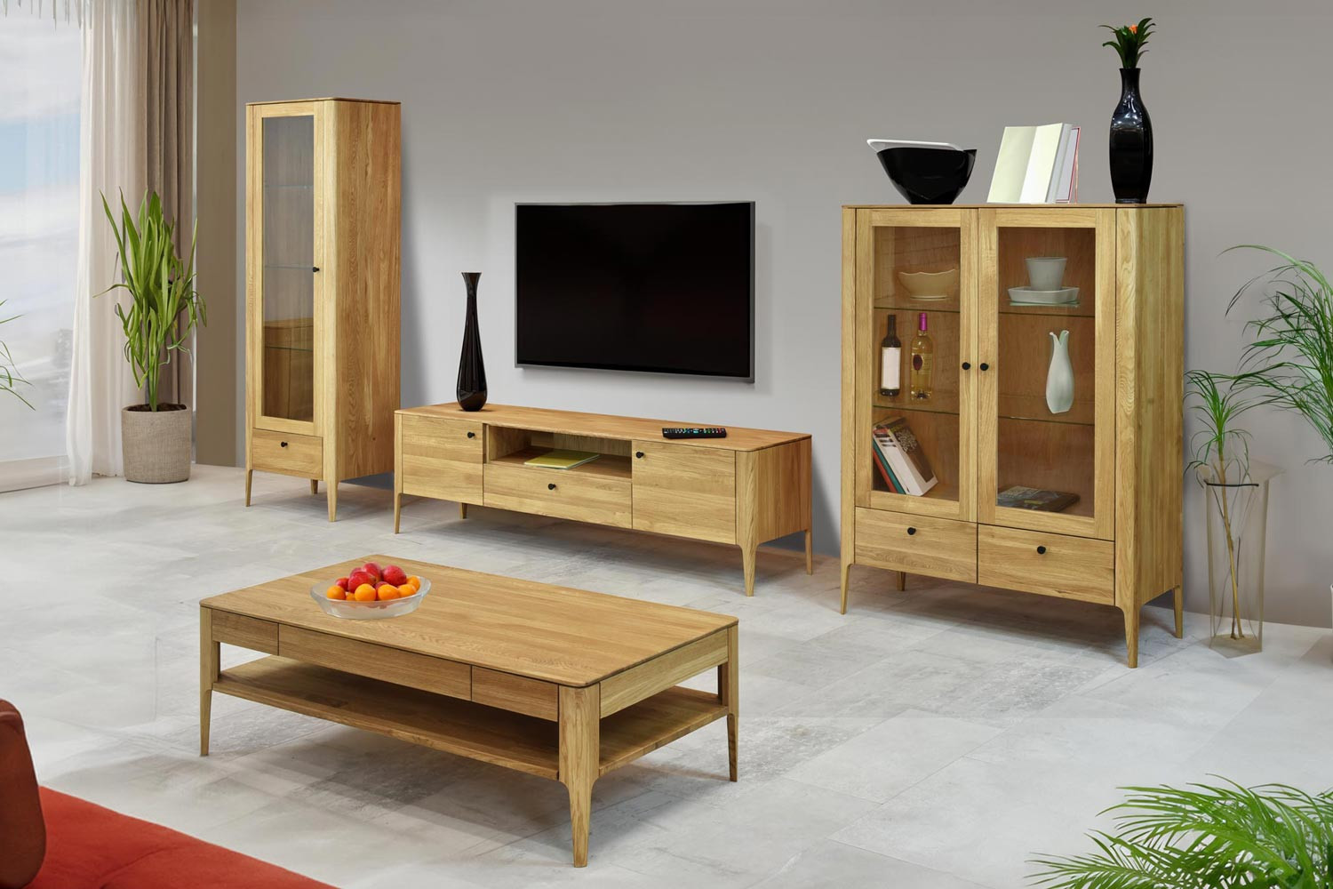 Ez a nappali fal nagyon praktikus átgondolt elrendezésének köszönhetően. Több elemből áll: vitrinből, TV-állványból és fali polcból, amelyek elegendő tároló- és lerakóhelyet biztosítanak igényeihez. Az összes fiók és ajtó halk záródású soft-close szerkezettel van ellátva, amely biztosítja a sima és halk működést, és meghosszabbítja a bútor élettartamát. A vitrin üvegpolcokkal rendelkezik, amelyek ideálisak kedvenc dísztárgyai, porcelánjai vagy poharai bemutatására. A bútor felületét minőségi olasz Borma Wachs olajjal kezelték tölgy natural színben, amely kiemeli a fa természetes erezetét és védelmet nyújt a külső hatások ellen.