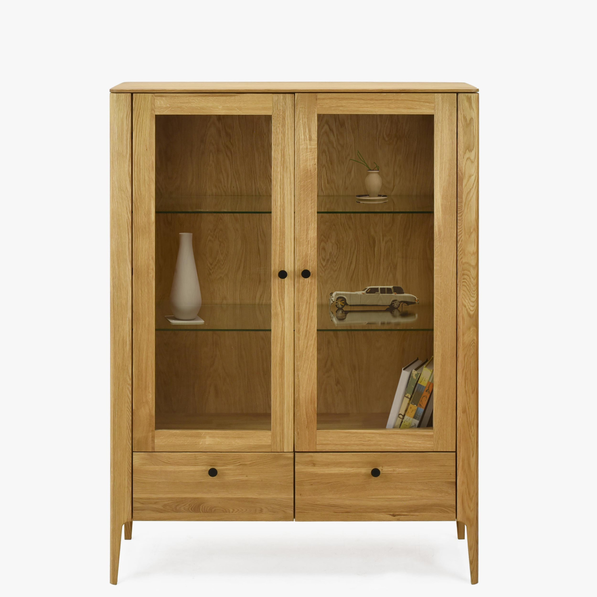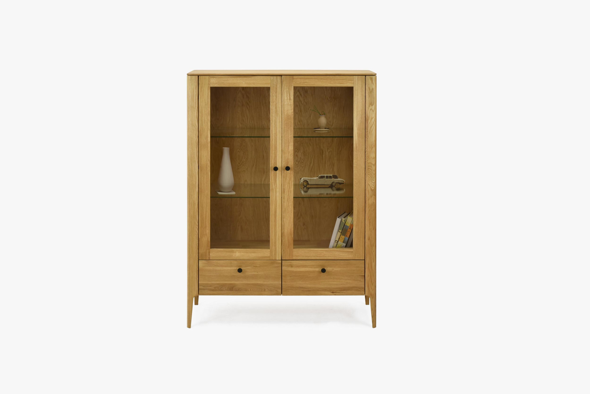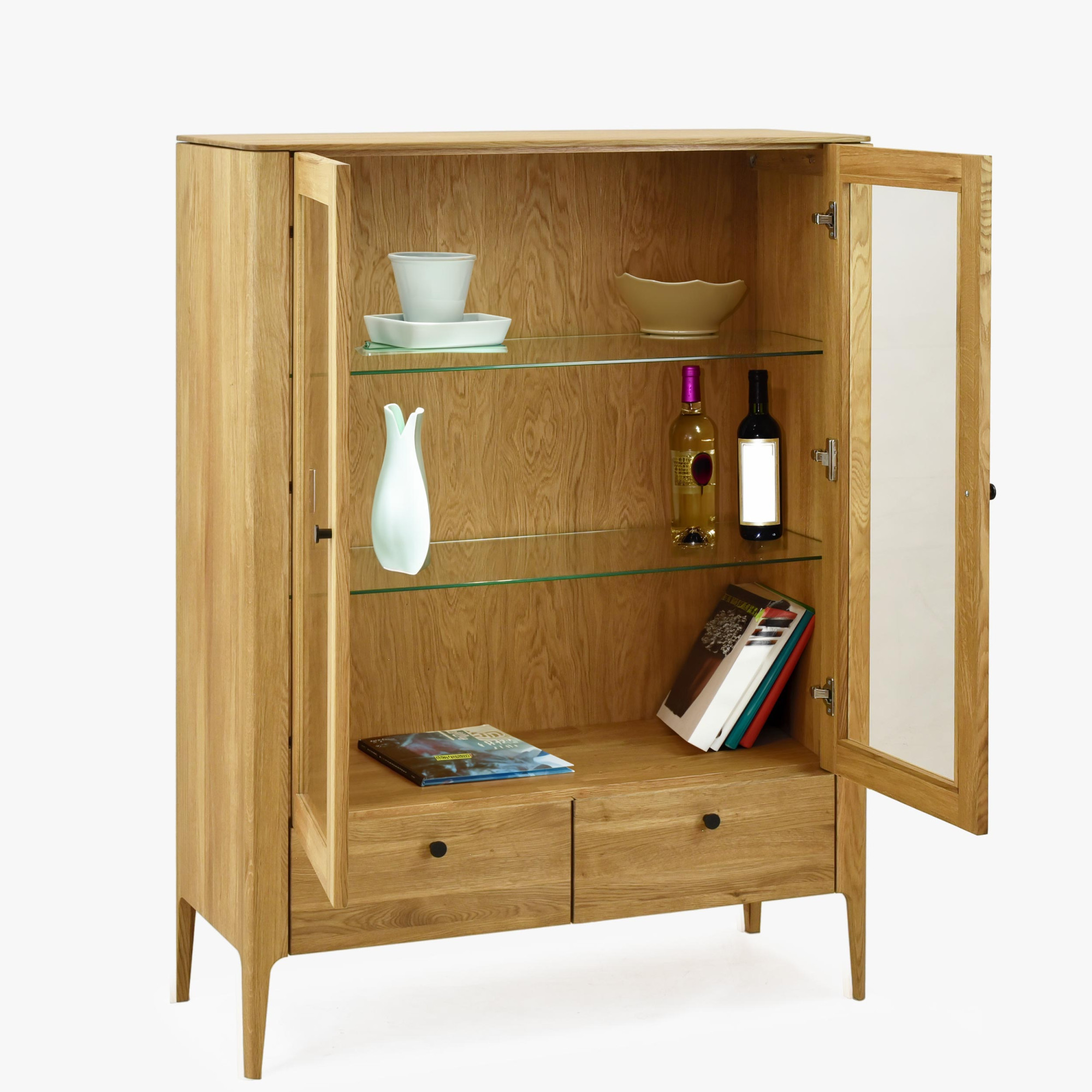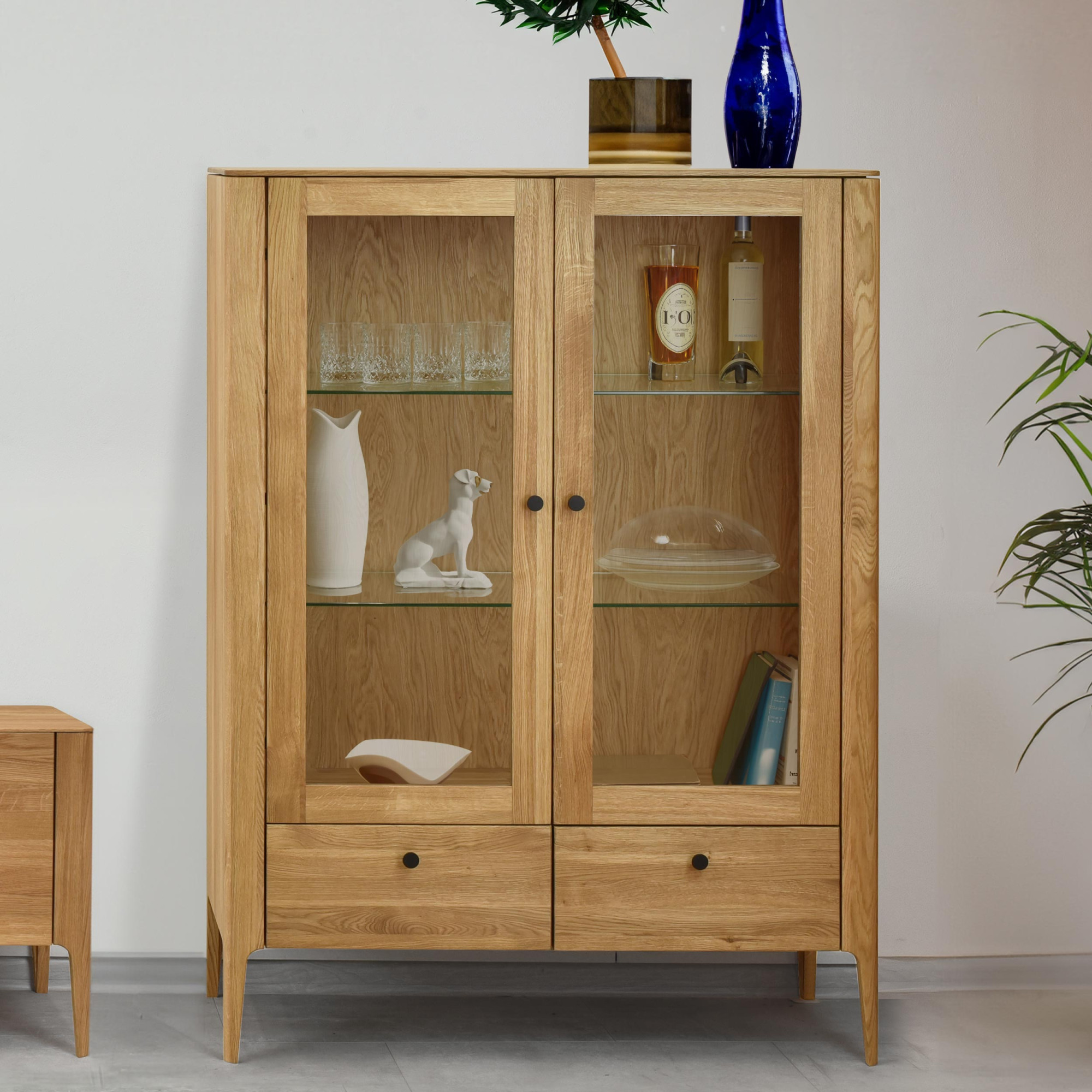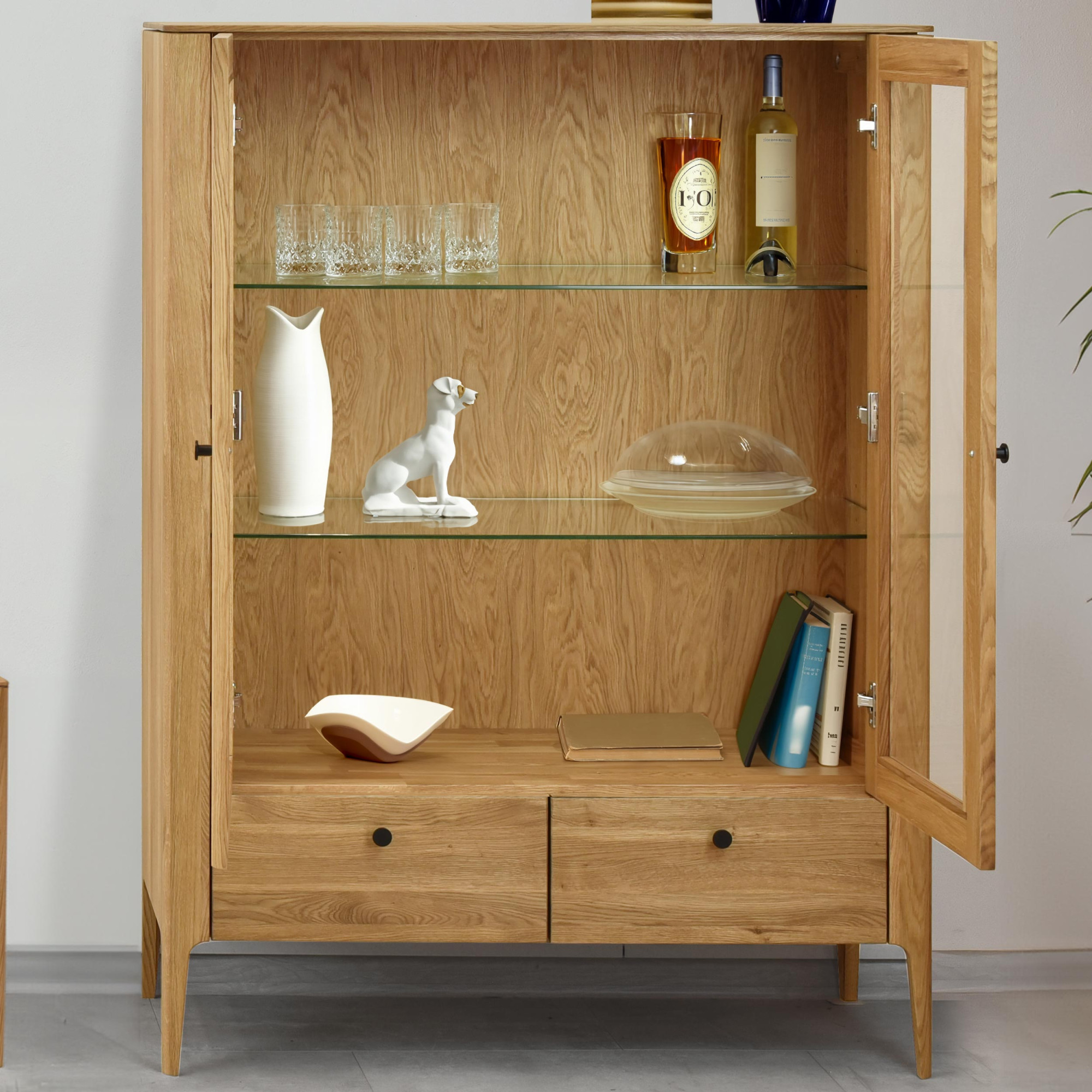 - Belső üvegpolcok: Ideális díszek és poharak bemutatásához.