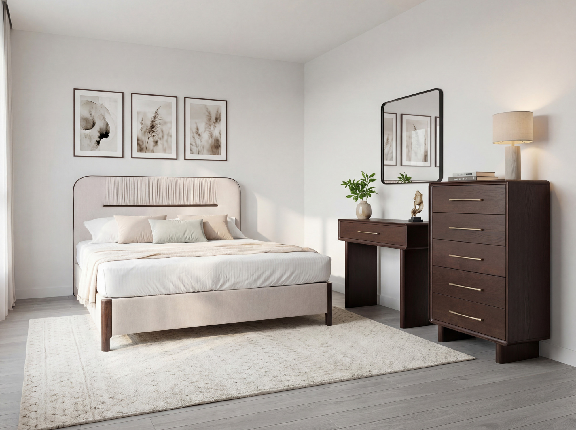Bemutatjuk Önnek a luxus kárpitozott Koper ágyat 180x200 cm-es fekvőfelülettel, amely különleges dizájnt ötvöz maximális praktikummal. Ez az elegáns franciaágy a Koper kollekció meghatározó darabja, és hálószobája központi eleme lesz. Az ágy fejtámlája első pillantásra magára vonzza a figyelmet – a finoman ráncolt részlet a felső részen luxus megjelenést kölcsönöz, míg a diószínű fa keret szépen kapcsolja össze a kárpitozott részt a kollekció többi bútorával. Az egész ágy minőségi, világos szövettel van bevonva, amely kellemes tapintású és könnyen tisztítható.