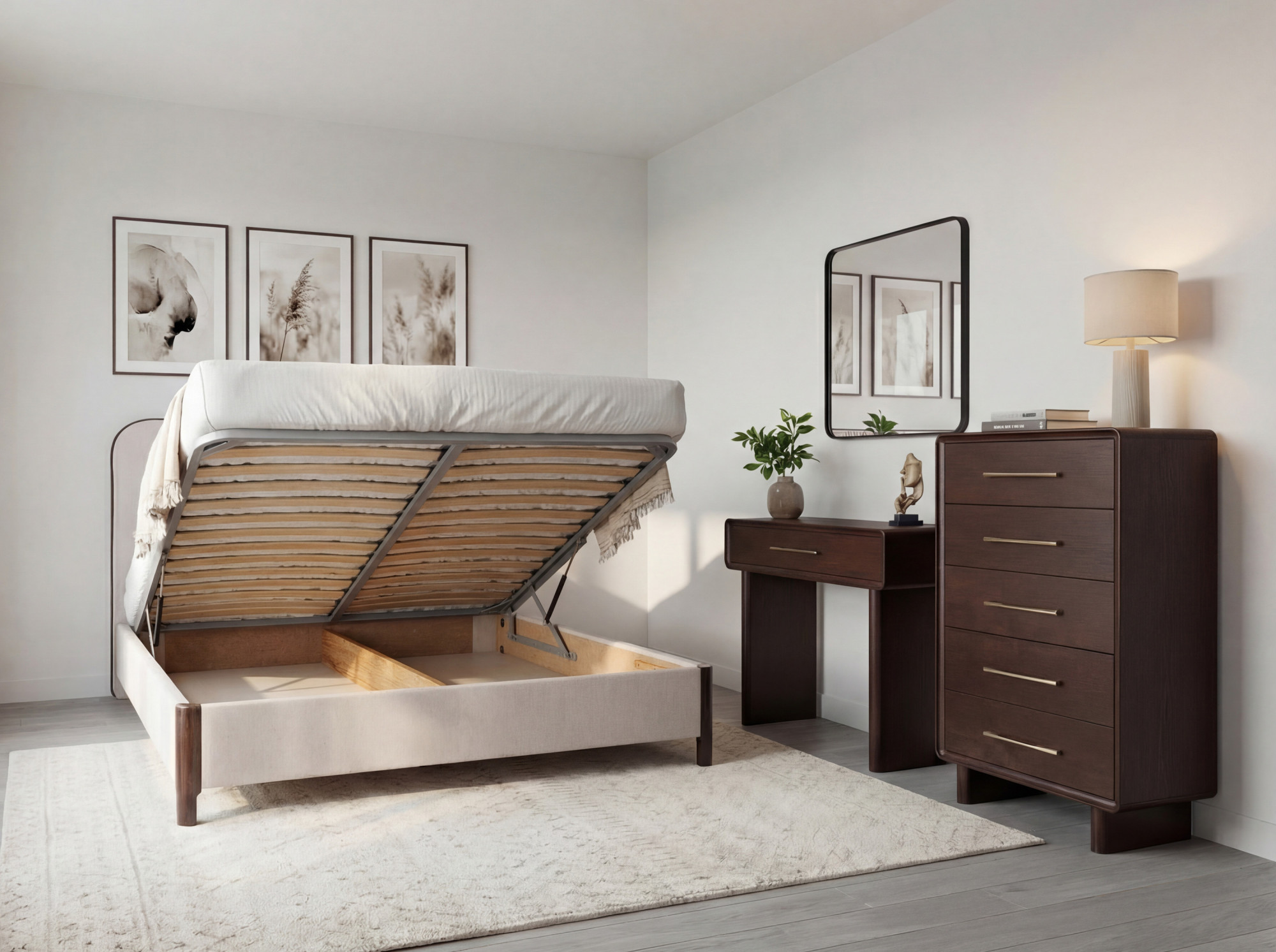 Az ágy alatt tágas tárolóhely található, amely felnyitható léces ágyrácson keresztül érhető el – elég csak felnyitni a rácsot, és máris bőséges helyet kap ágynemű, takarók vagy szezonális ruházat számára. A léces ágyrács a csomag része, így csak matracot kell vásárolnia hozzá tetszése szerint. Az ágy teherhordó váza tömör tölgyfából készült, ami maximális stabilitást és hosszú élettartamot garantál. A tömör tölgy lábak diószínben elegánsan kiegészítik a dizájnt, és biztosítják az ágy szilárd rögzítését.