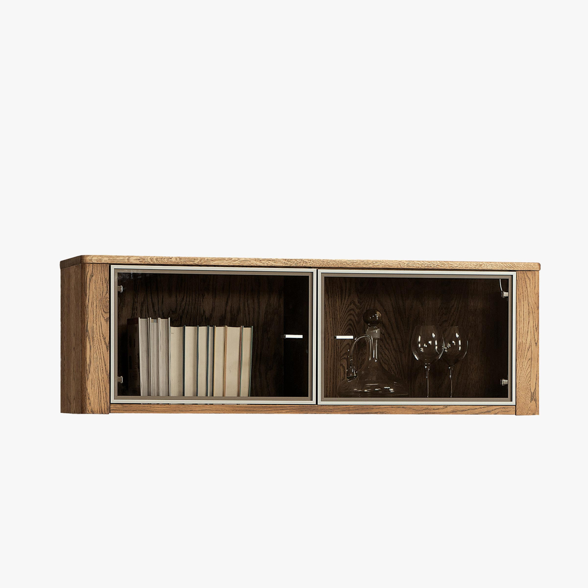 Felfüggesztett tömör polc belső tere üveges ajtókkal van fedve, minimalista alumínium kerettel és elegáns fogantyúkkal. Függőleges válaszfal a szekrényt két egyenlő méretű részre osztja. Alapfelszereltség a halk soft-stop önbehúzó ajtó.