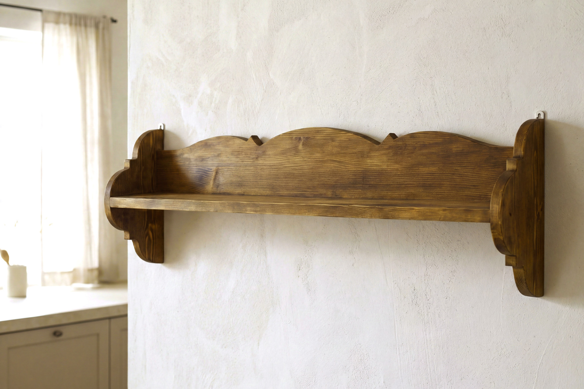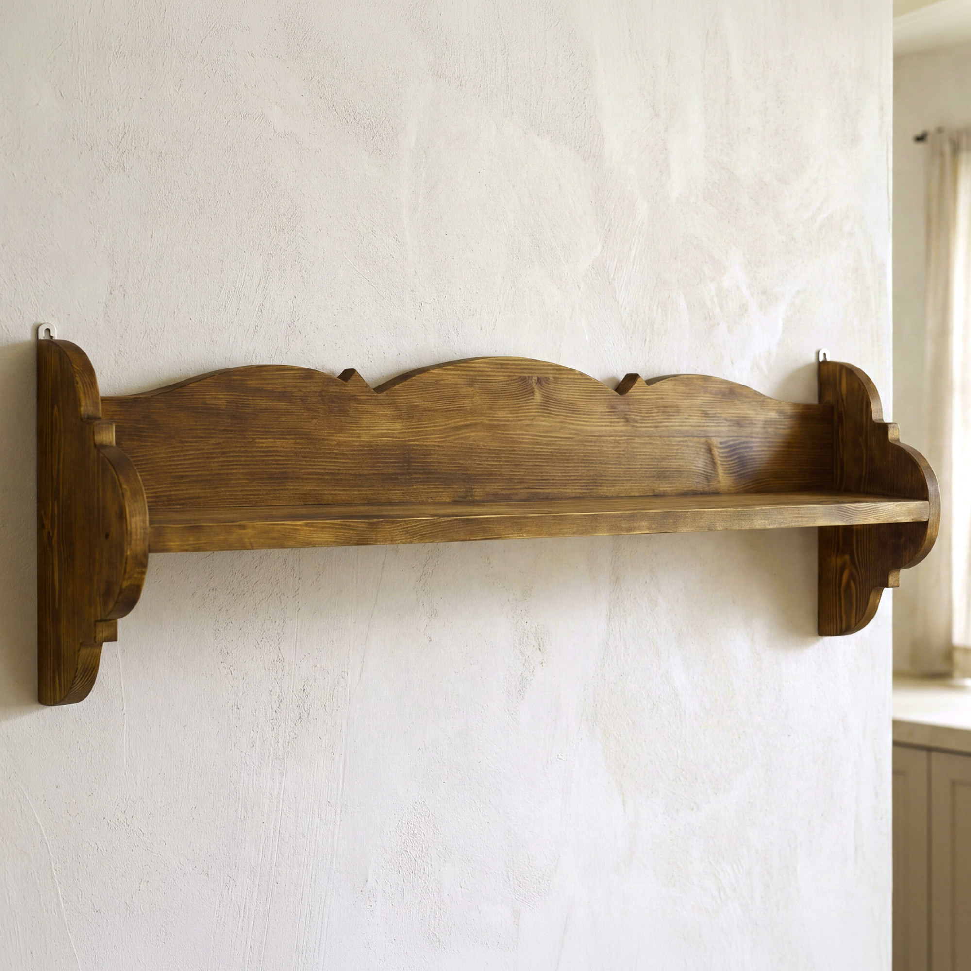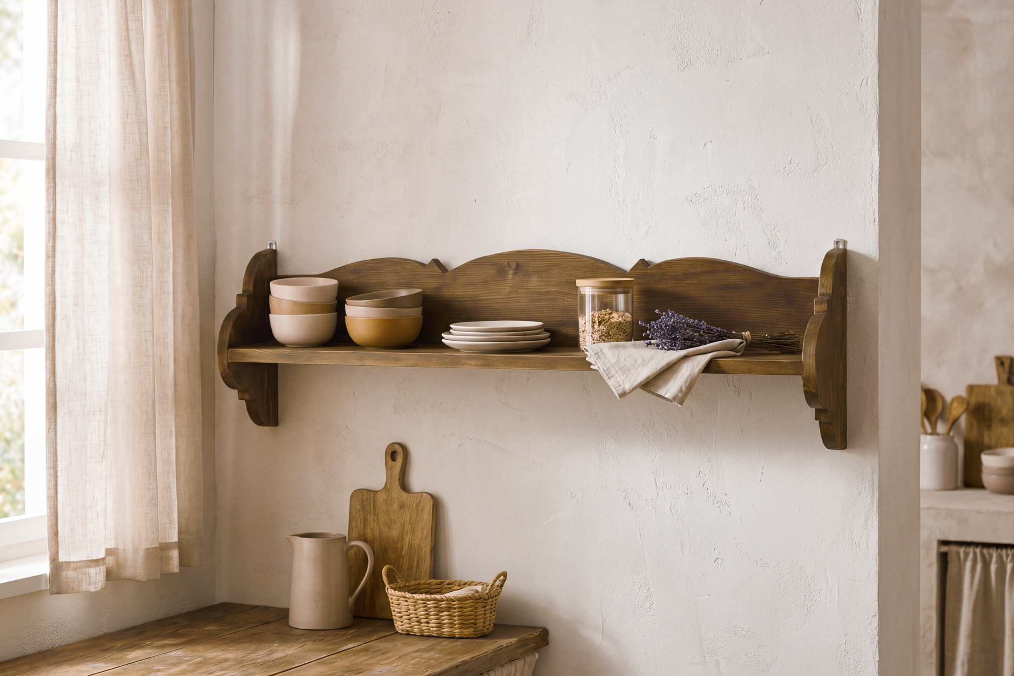 Ez a vidéki, rusztikus polc ideális nyaralókba, családi házakba, illetve vidéki, hagyományos vagy falusi stílusú lakásokba. Szépen illik a konyhába, étkezőbe, nappaliba vagy az előszobába is.