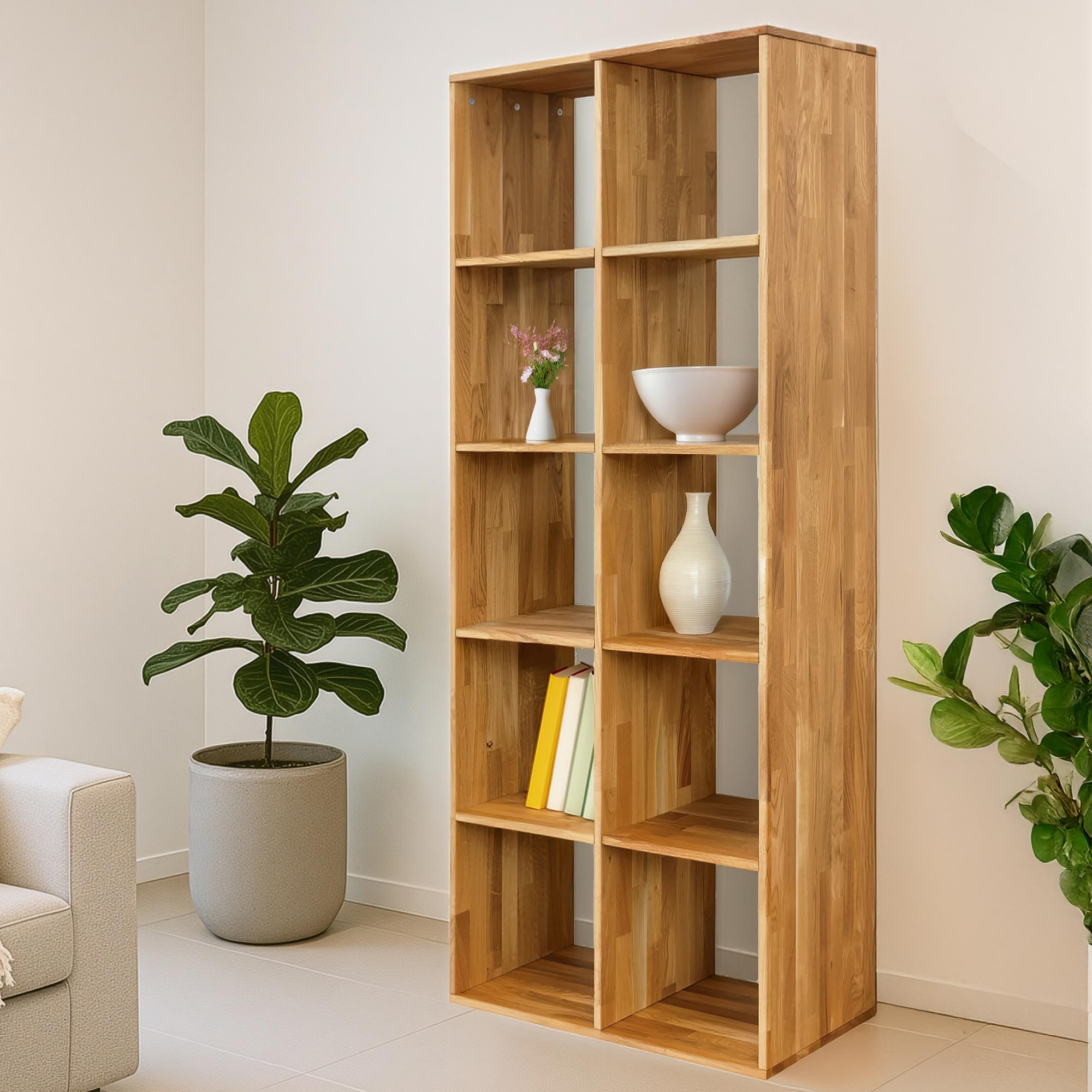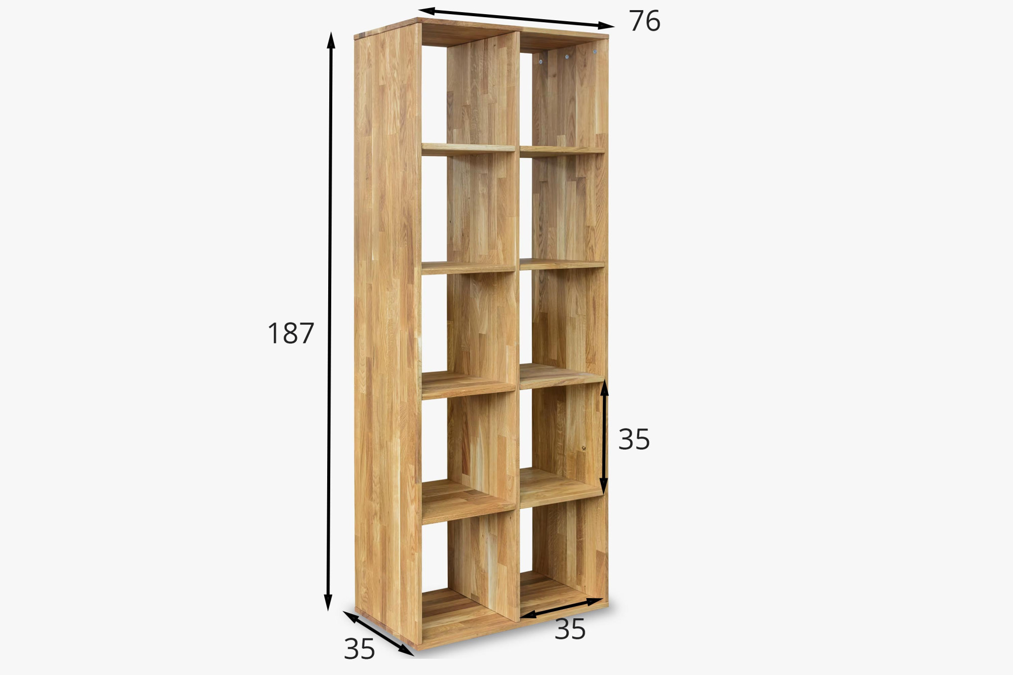Tölgyfa regál egy sokoldalú tárolóelem, amely otthonába a természetes fa melegét és időtlen eleganciát hozza. A tömör tölgy szerkezet kiváló tartóssággal és hosszú élettartammal tűnik ki, a Dub Natural árnyalatú felület természetes olajjal kezelt, amely kiemeli a fa erezetét és lehetővé teszi a könnyű helyi felújítást. A nyitott kialakítás tíz azonos rekesszel átlátható helyet biztosít könyveknek, dísztárgyaknak és apró tárolódobozoknak – kiválóan illik a dolgozószobába, a nappaliba és a gyerekszobába.
