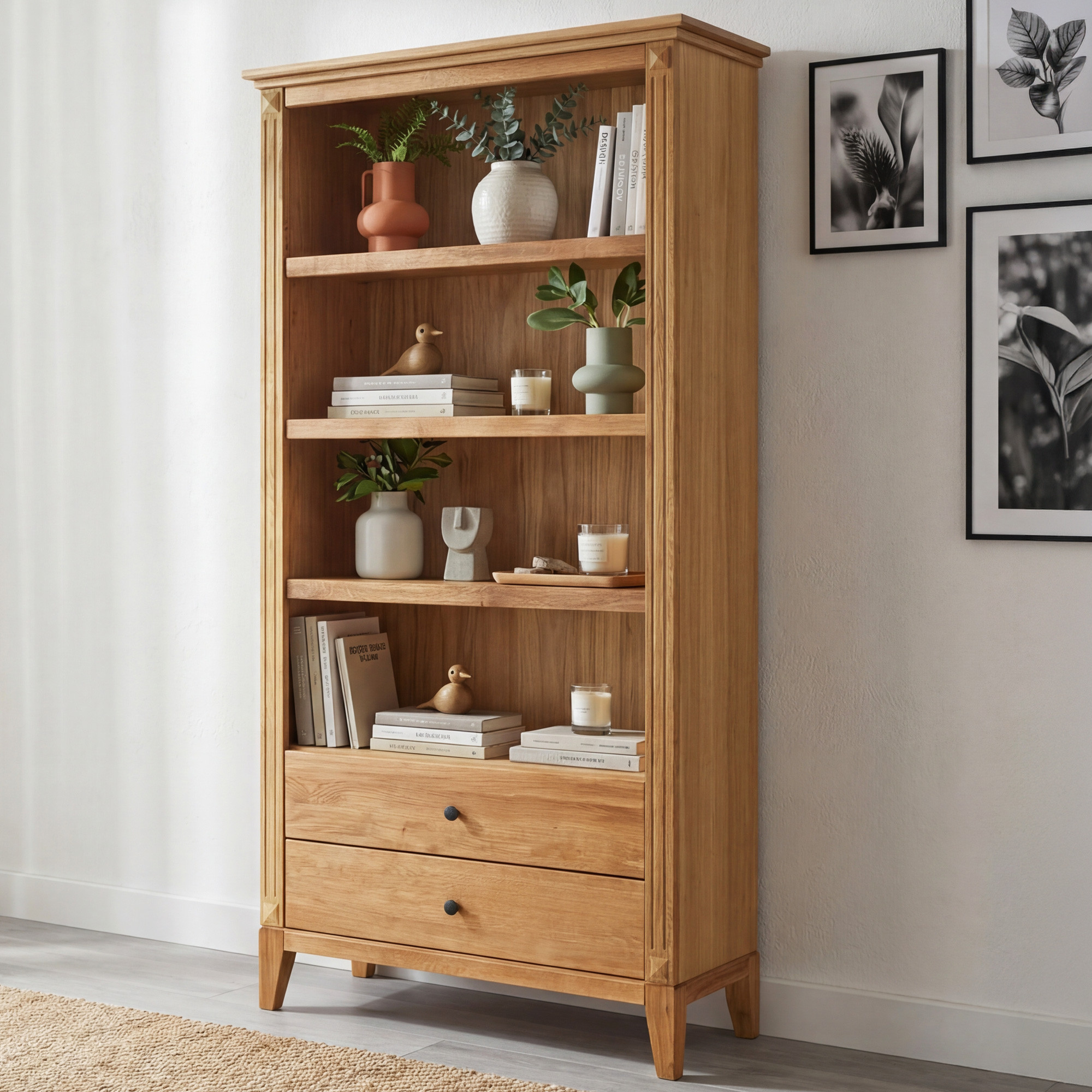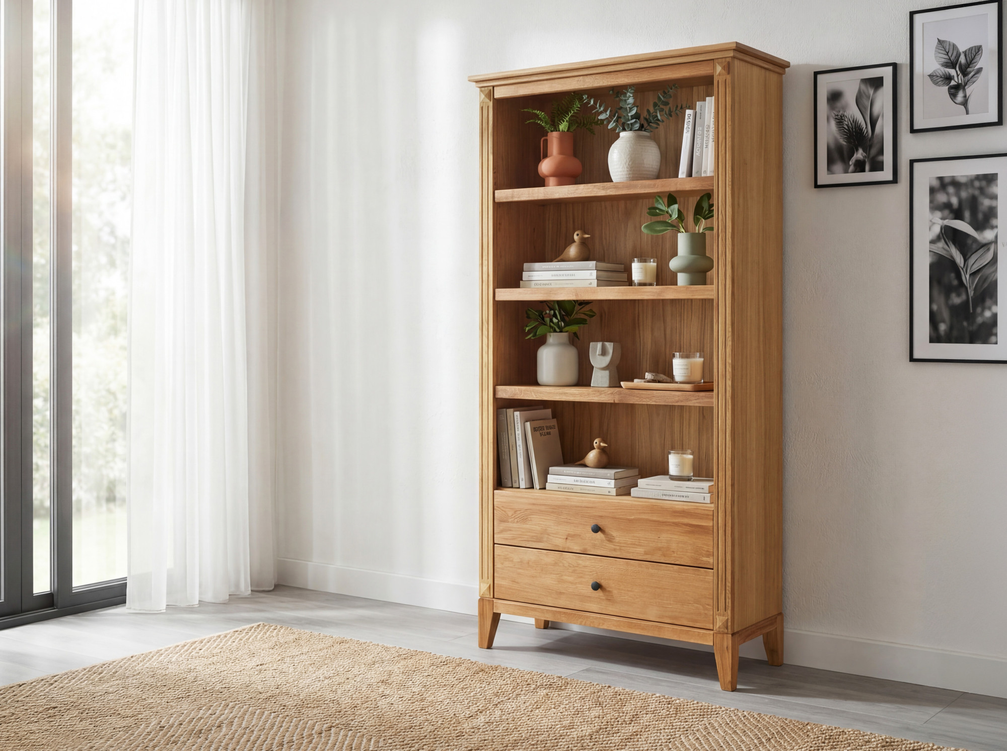 Keres egy tágas tölgyfa polcos szekrényt, amely ötvözi a nyitott tárolóhelyet a praktikus fiókokkal? A Gaja kollekció polcosa ideális választás a természetes fa és a skandináv dizájn kedvelőinek. Ez a tömör tölgyből készült polcos szekrény rusztikus északi stílusban 3 fix polcot kínál könyvek, dísztárgyak vagy növények bemutatására, illetve 2 fiókot az alsó részen azoknak a dolgoknak a tárolására, amelyeket szeretne elrejteni. Impozáns méreteivel, 100 × 195 × 42 cm, ez a fa polcos szekrény a nappali, dolgozószoba vagy hálószoba domináns darabja lesz, és elegendő helyet biztosít kedvenc tárgyainak.