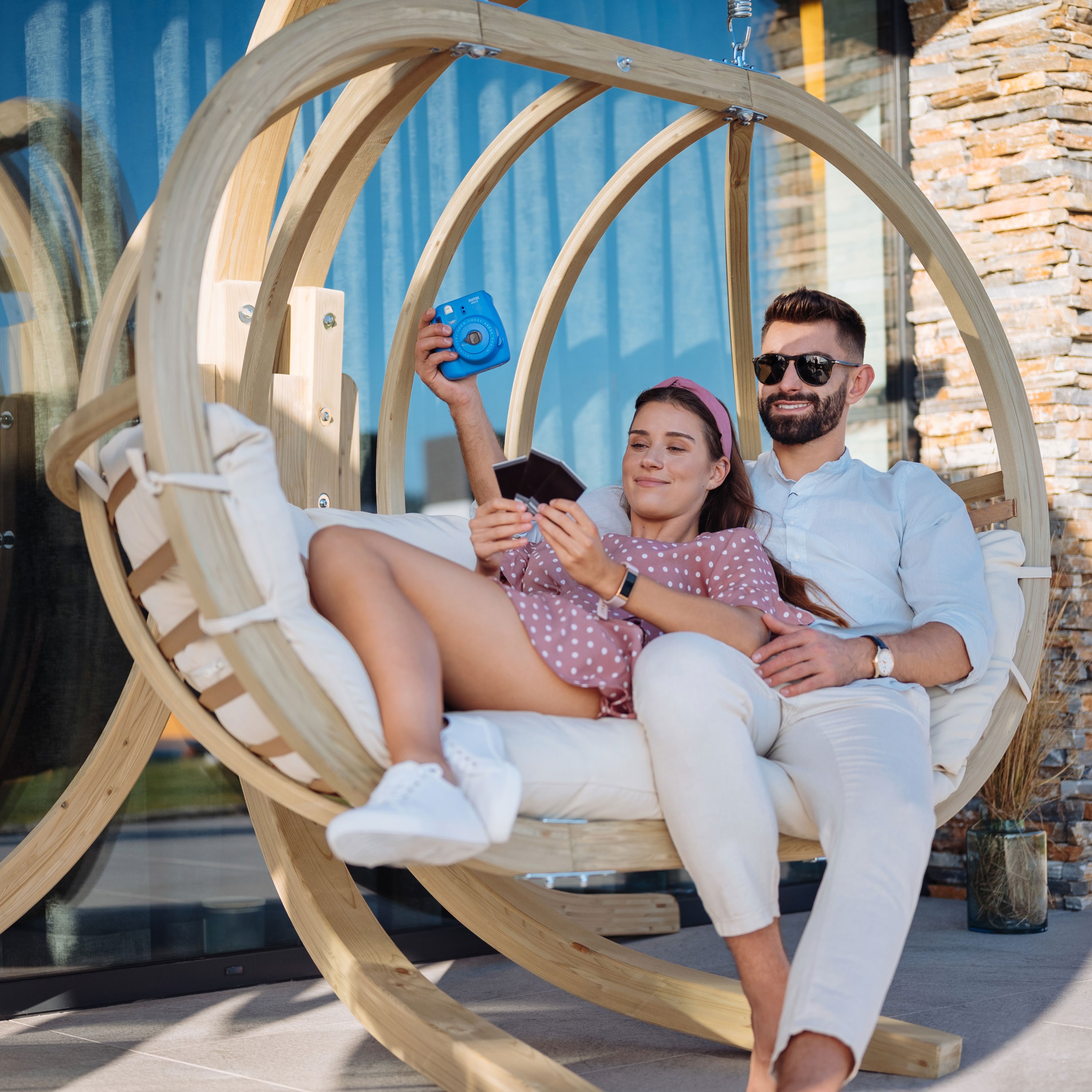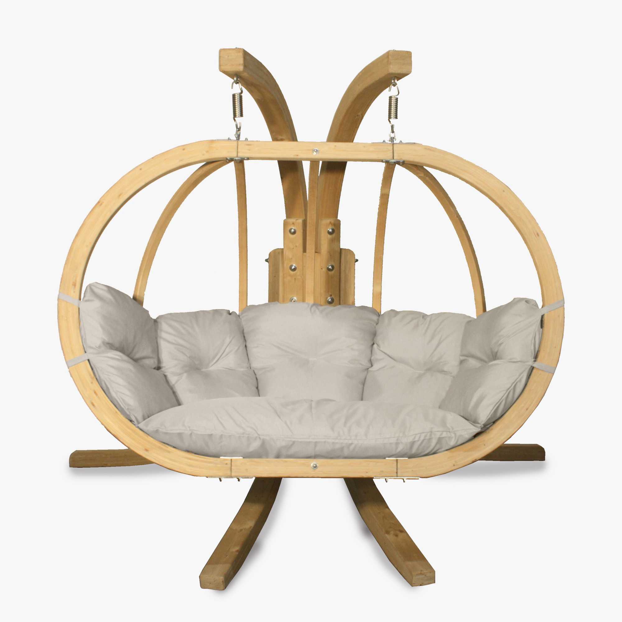 Katka XL függőfotel párnákkal. Különlegessége egyedi formatervezésében és a használat kényelmében rejlik. Tartós, legmagasabb minőségű anyagokból készült. A fotel kényelmesen befogad 2 személyt, és minden évszakra, valamint minden típusú beltéri és kerti elrendezésbe ajánlott. Kiválóan alkalmas pihenésre a nappaliban, a teraszon vagy a kertben, de szállodákban, kávézókban vagy SPA-helyiségekben is. A kosár és az állvány váza impregnált rétegelt lucfenyőből készült. A fotel kényelmes, PUR habbal töltött párnával van felszerelve, és 100% poliészter Cleanaboo anyaggal kárpitozott, amely ellenáll a szennyeződéseknek.