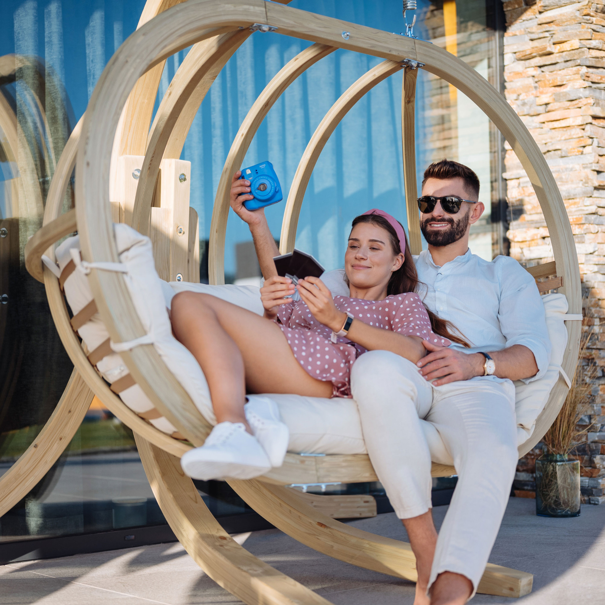 Ha különleges pihenőhelyre vágyik, amelyet könnyen elhelyezhet a teraszon, a kertben vagy egy tágasabb belső térben, a SwingPod XL hinta a megfelelő választás Önnek és szeretteinek. Képzelje el, hogy egy fárasztó nap után kényelmesen leülhet kedvenc könyvével vagy egy csésze kávéval, és élvezheti a finom ringatást, amely megszabadítja a stressztől és lehetővé teszi, hogy egy pillanatra megfeledkezzen minden gondról. Köszönhetően a robosztus szerkezetnek és a minőségi, impregnált lucfenyőből készült faanyagnak, amely jobb ellenállást biztosít a nedvességgel és más időjárási viszonyokkal szemben, hosszú távon számíthat a teljes szett tartósságára. Ugyanakkor javasoljuk a bevonat rendszeres karbantartását nagyjából évente egyszer, ha a hintát kültéri hatások érik. A SwingPod XL két személy számára tervezett, így a nyugodt közös pillanatokat partnerével vagy barátaival élvezheti. A hinta összeszerelése és esetleges szétszerelése egyszerű, így szükség esetén könnyen áthelyezhető más helyre. A kényelmet nemcsak a masszív fa szerkezet biztosítja, hanem egy puha, kényelmes és mégis praktikus párna is, amely kiváló minőségű anyagból készült, megkönnyítve a tisztítást. Feltűnő krémszínű színe elegáns és modern megjelenést kölcsönöz a hintának, így vonzó kiegészítője lesz bármely környezetnek. Akár romantikus sarkot szeretne a szabadban, akár stílusos beltéri elemet, krémszínű párnával kielégíti kényelmi és esztétikai elvárásait.