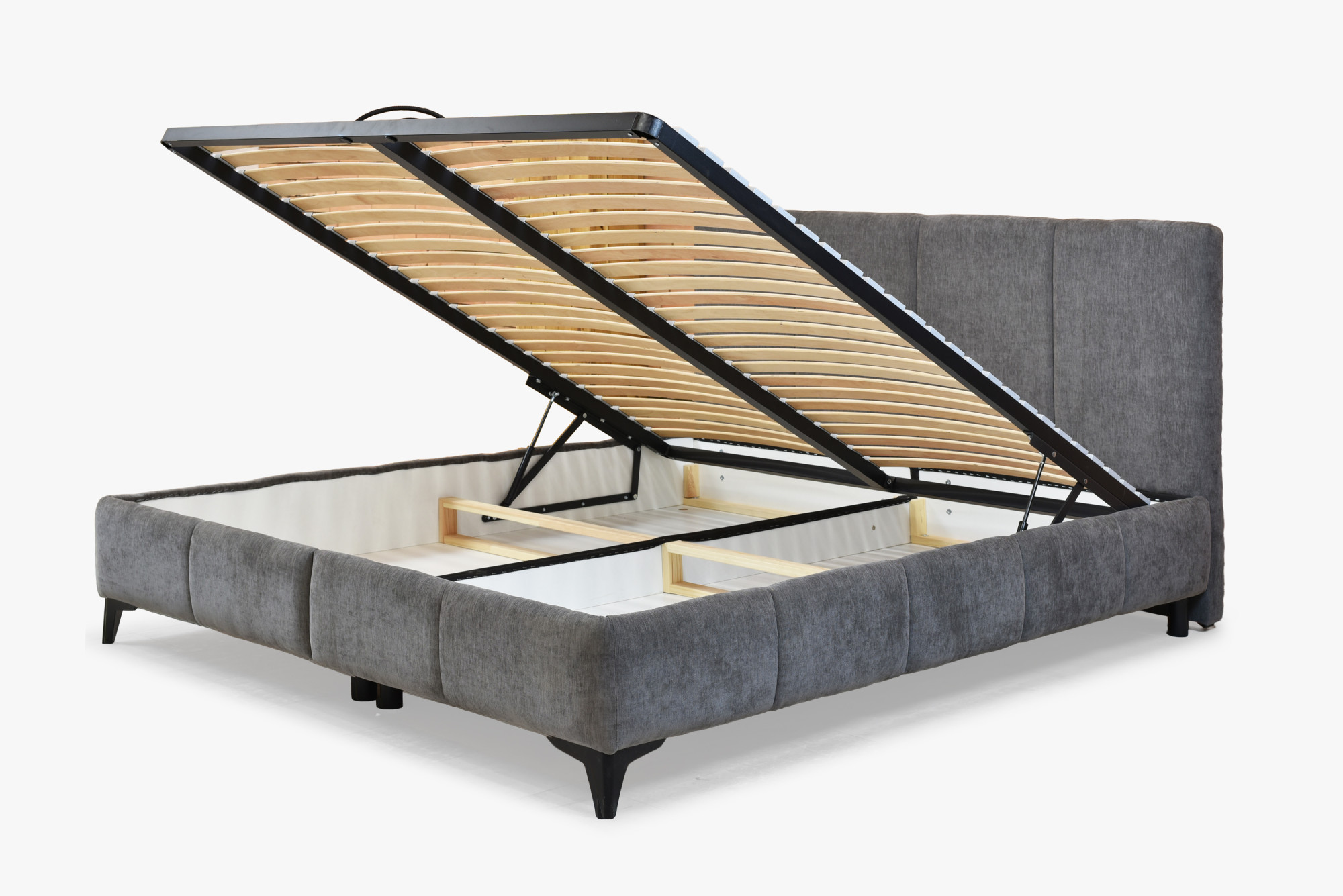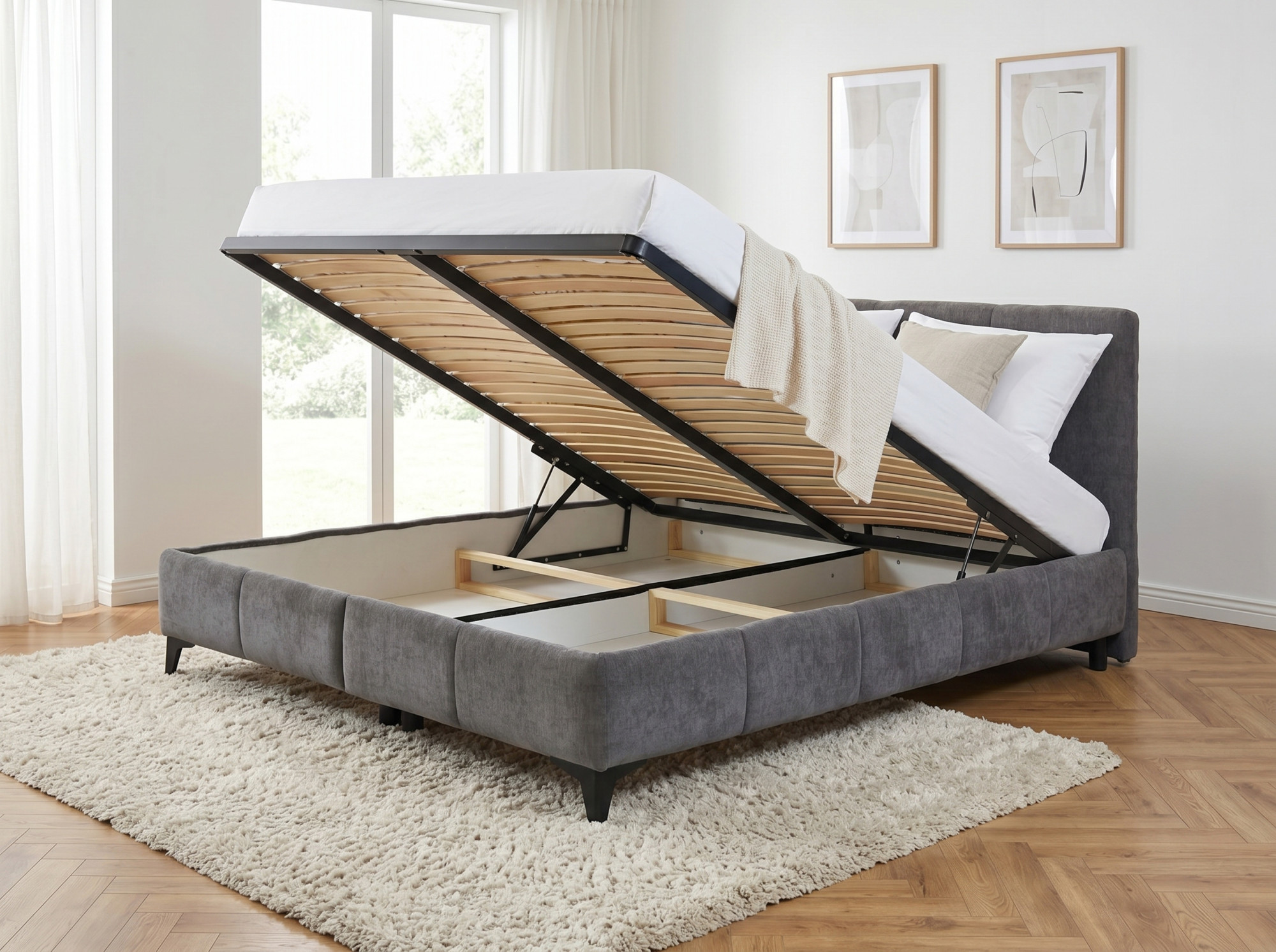 Az ágykeret alatti tér minden oldalról hozzáférhető, és alkalmas ágyneműk, párnák vagy szezonális textilek tárolására.