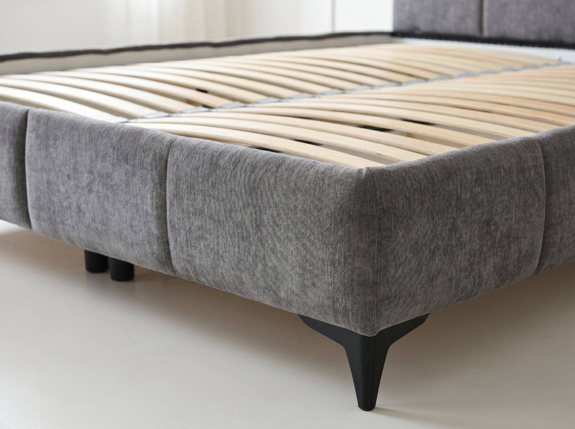 A szerkezetet a napi kényelem és a praktikum előtérbe állításával tervezték. A szállítási tartozék a lamellás ágyrács, így az ágy azonnal használatra kész – csak a matracot kell külön megvásárolni. A keret alatt egy tágas tárolóhely rejtőzik, amely ideális ágyneműk, párnák vagy szezonális textilek tárolására. A masszív tartószerkezet stabilitást és hosszú élettartamot biztosít. A Flow 02 anyag (100% poliészter, 260 g/m²) kopásállósága eléri a 70 000 Martindale-ciklust, így a mindennapi intenzív használatot is kibírja. Az ágy részekre szerelve érkezik, részletes összeszerelési útmutatóval.