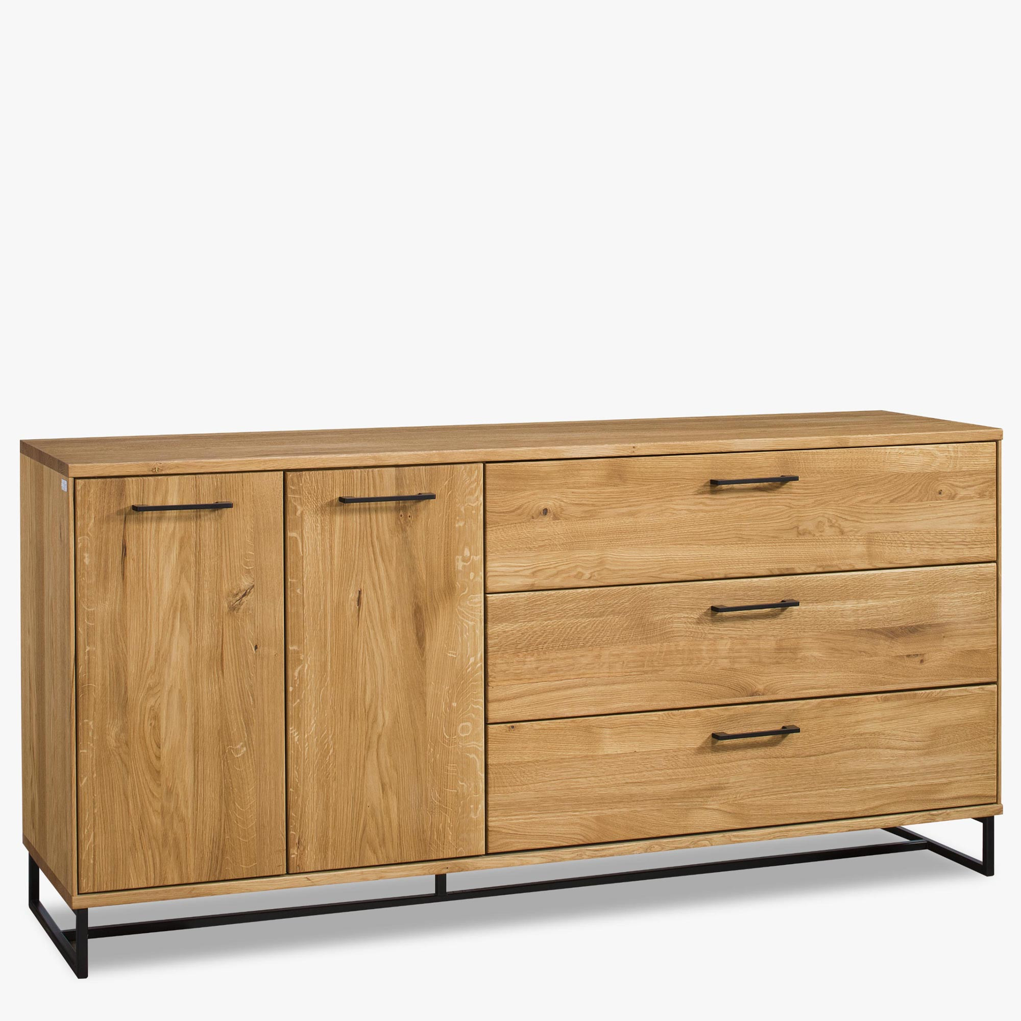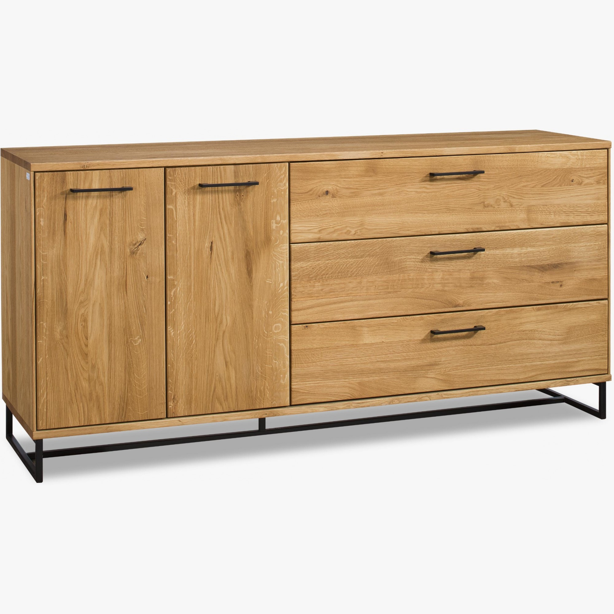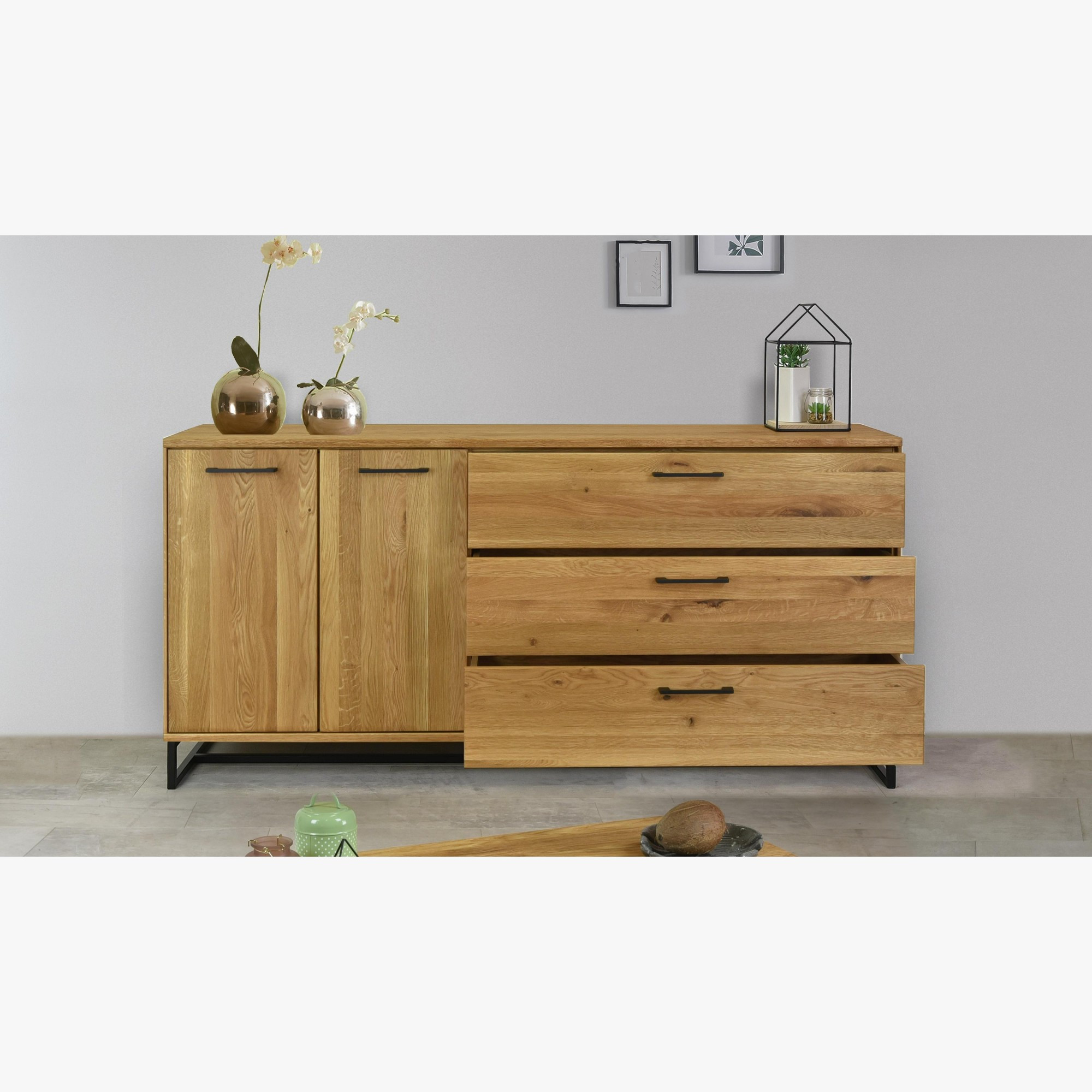 Modern tömörfa bútor tölgyfából készült, gyönyörű természetes tölgy furnérral kombinálva, ipari stílusban. A kollekció jellegzetességei a matt fekete fogantyúk és a fekete színű fém lábak, amelyek a természetes fával kombinálva jelennek meg. A bútor modern loftokba ideális de az Ön lakásába is, ha egyedi bútorral szeretné feldobni. A kollekció egyik gyönyörű eleme, hogy a bútorok fekete fém lábakon állnak.