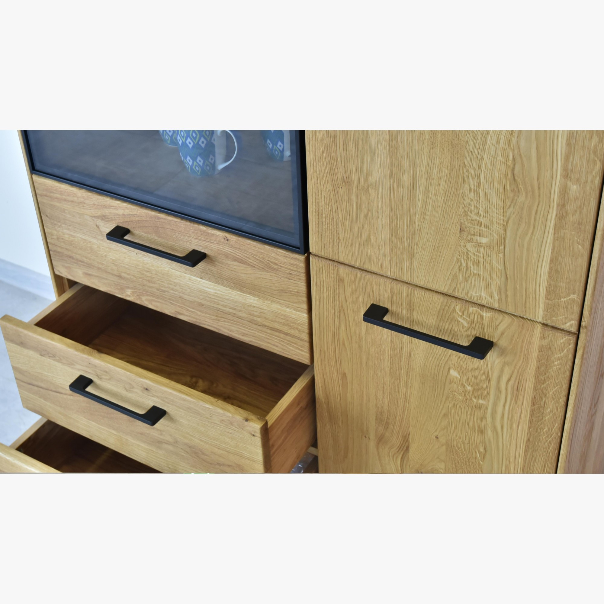 Magas tölgyfa üveges komód Loft stílusban, modern enteriőrbe. Az üveges komód fekete fém lábakon áll, így ipari hatást kelt. A fém és a fa kombinációja különösen vonzó. A komód már összeszerelve kerül kiszállításra. A világítás nem része a csomagnak, de felár ellenében megvásárolható. Bútorainkat a legmodernebb CNC gépekkel készítjük, ami a legmagasabb minőséget garantálja. Tekintse meg a Lagos kollekció összes típusát és modelljét.