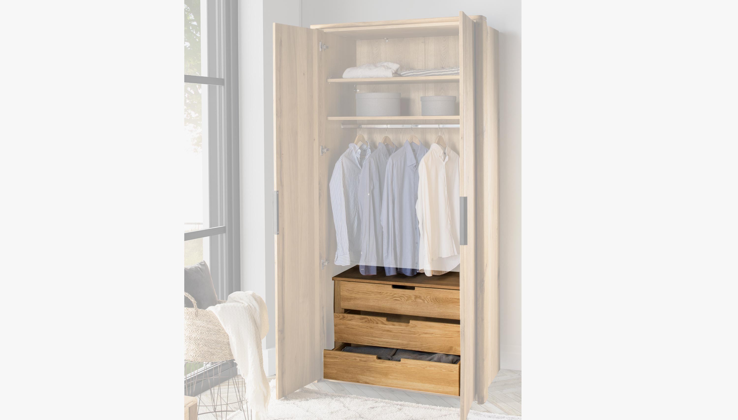Eredeti kiegészítő a Texas gardróbszekrényhez. A komód 3 fiókkal rendelkezik és összeszerelve szállítjuk, közvetlenül behelyezhető a szekrénybe. Helyezze a komódot a szekrénybe, amikor a szekrény ajtói még nincsenek felszerelve. A komód fiókjai soft-close, azaz halk záródásúak.