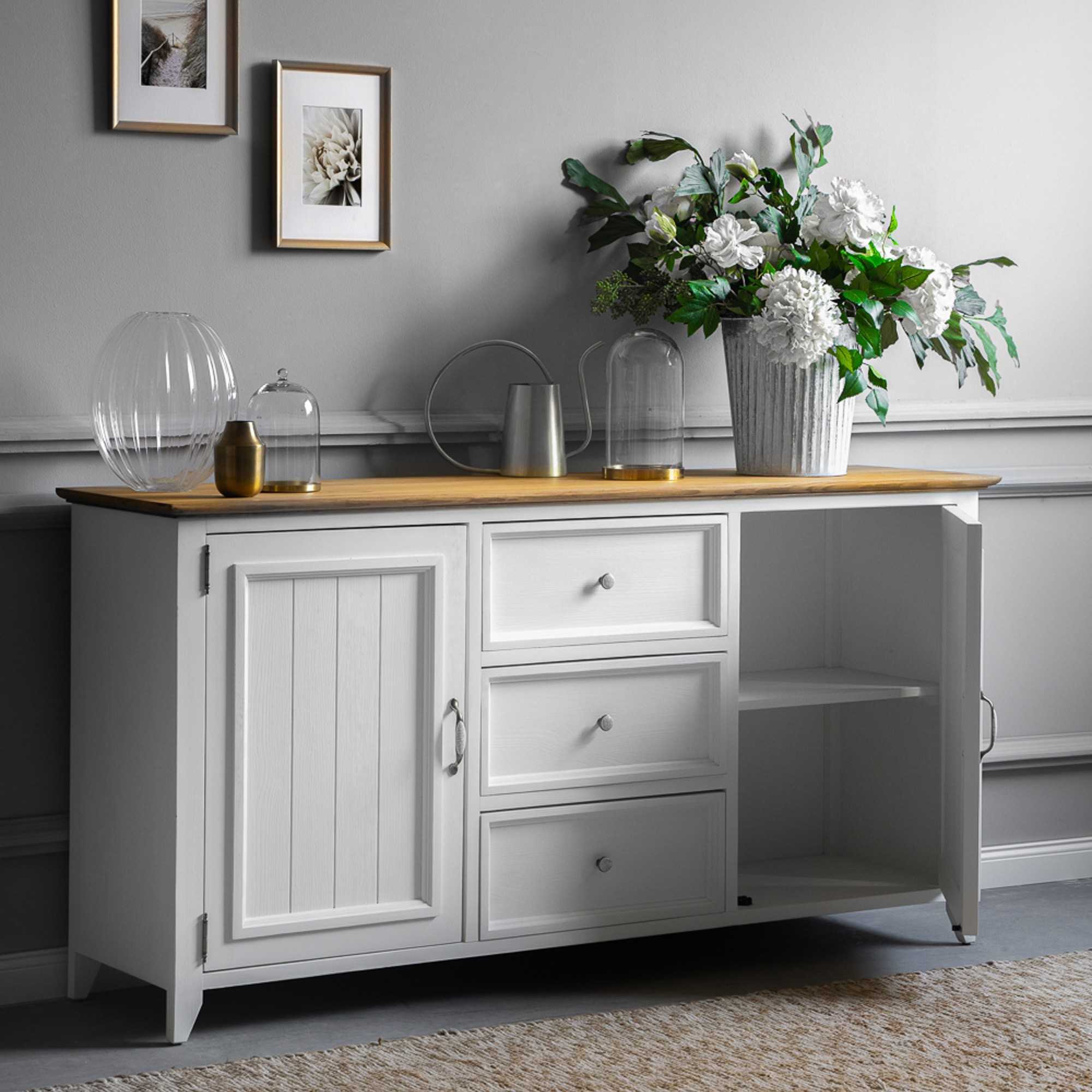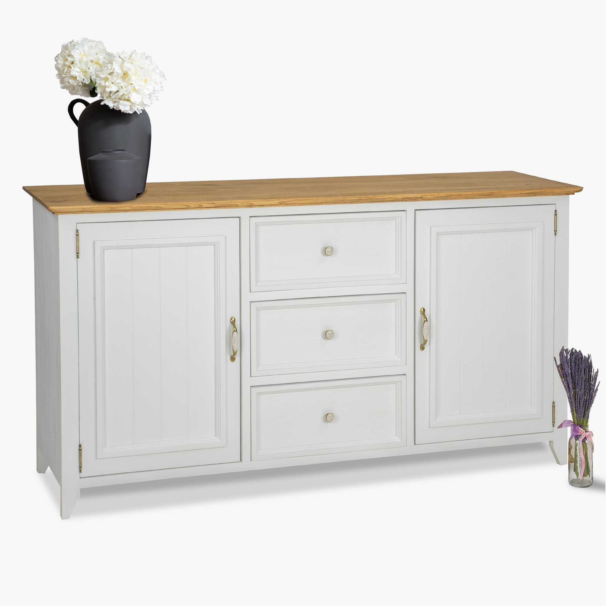 Természetes komód provence-i stílusban fehér‑barna színkombinációban, tiszta fenyőfából készült. A komód vonzó megjelenése a francia vidéket idézi. A komód hálószobába, dolgozóba és étkezőbe is alkalmas. Középen fiókok találhatók, oldalain ajtók, melyek belsejében középen egy fa polc van. A komód összeszerelve kerül kiszállításra. Gazdagítsa belső terét ezzel a látványos darabbal, és élvezze nap mint nap a természetes bútorok erejét. A természetes termékek ökológiája és a gyönyörű dizájn harmóniája azok a tulajdonságok, amelyeket a LILLE komód gyártásakor összehangoltunk.