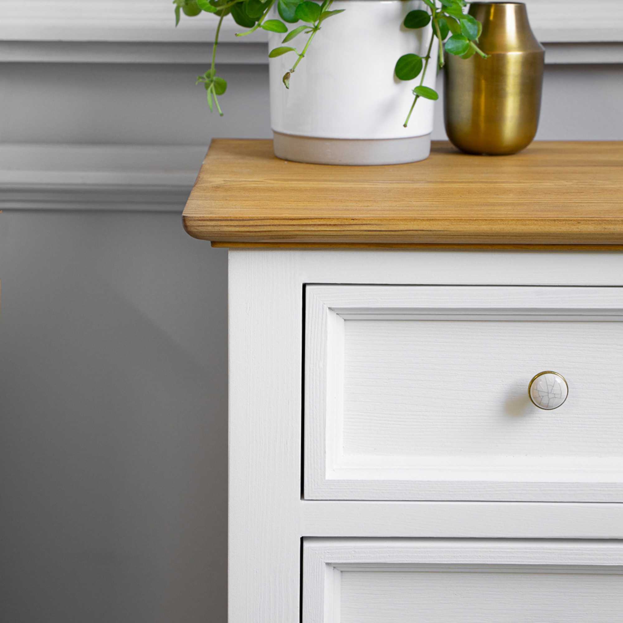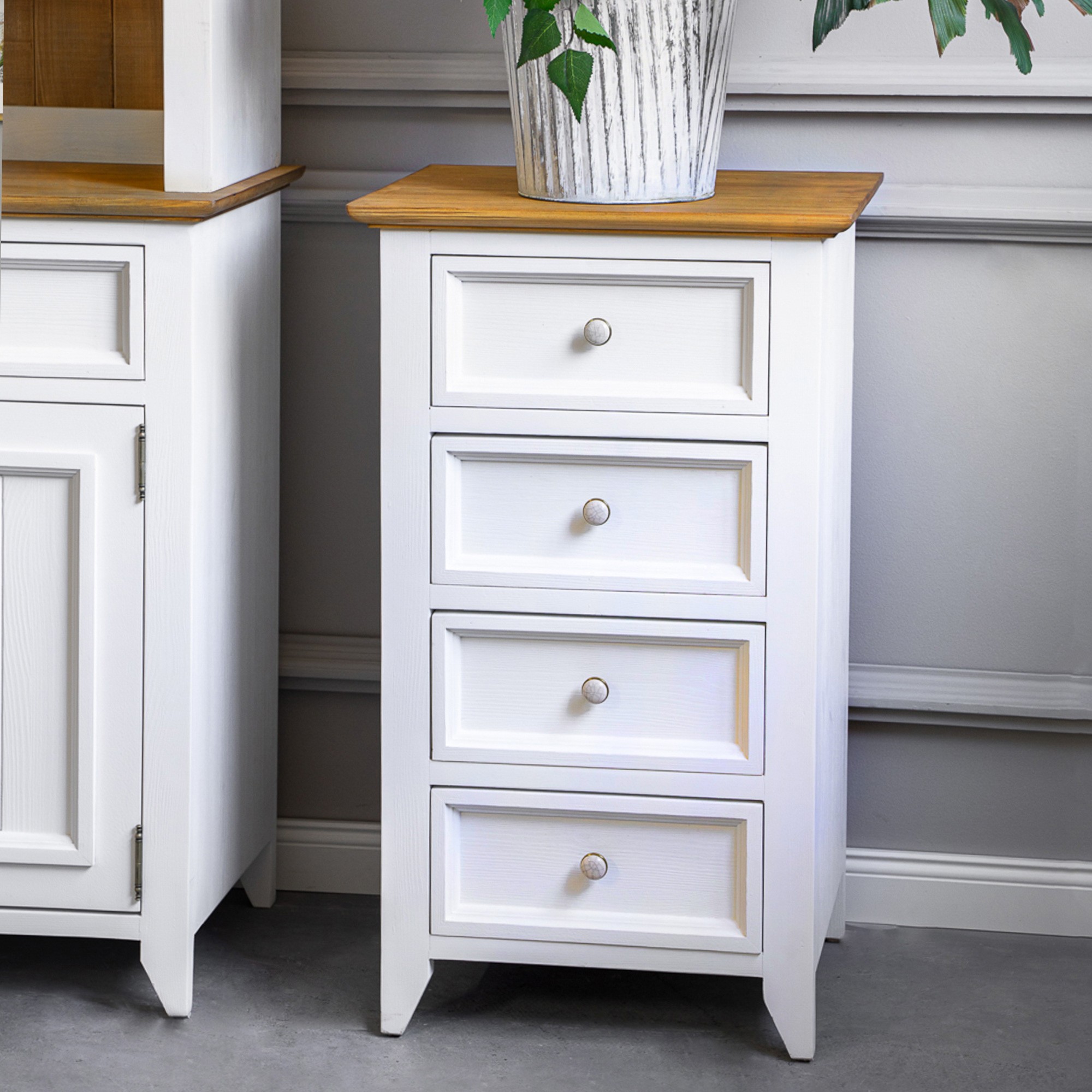 Fehér-barna fenyőfa provance stílusú keskeny 4 fiókos komód