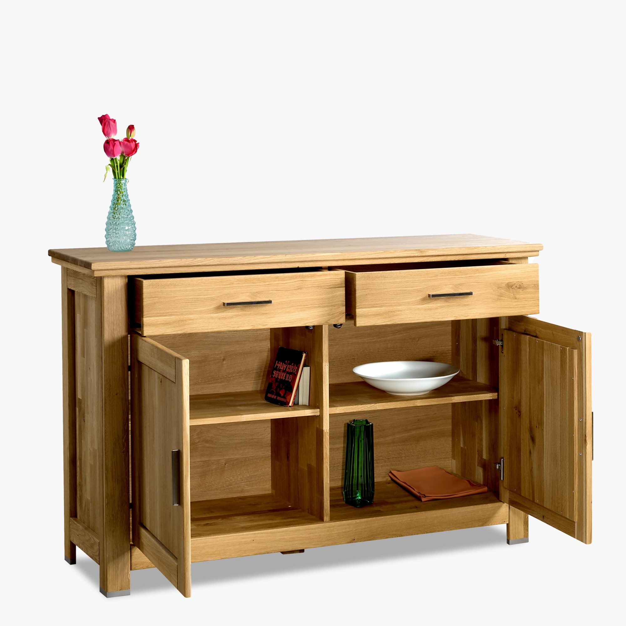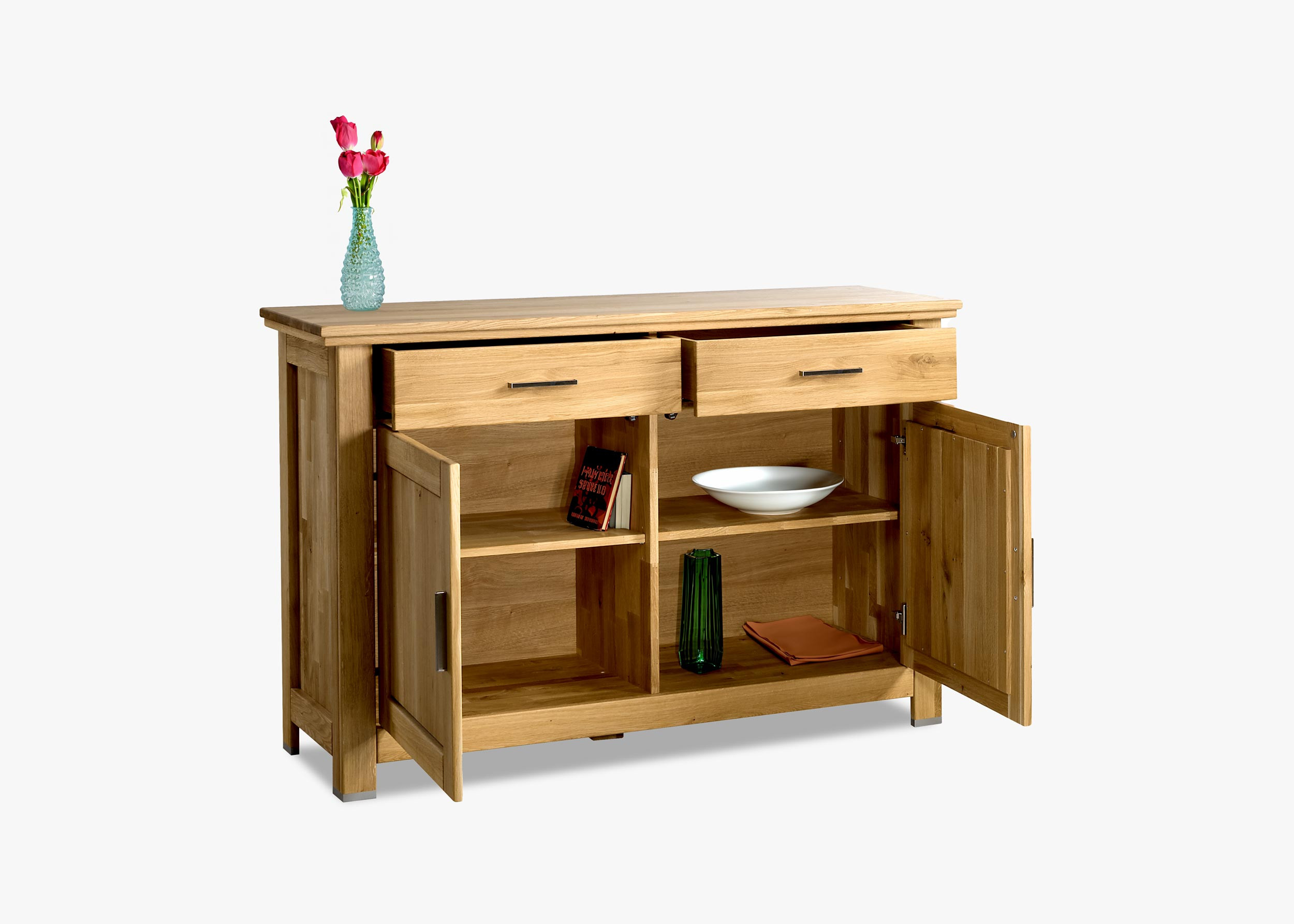 Keres hagyományos kivitelezést, precíz minőséget és természetes anyagokból készült terméket? Mindezt teljesíti az Alexandra bútorcsalád tölgy komódja. Az Alexandra tölgykomódát valódi tömör tölgyfából készítik. Gyönyörű dizájn és elsősorban valóban luxus kidolgozás. A komód felső részében 2 fiók található, amelyek halk záródású soft close rendszerrel rendelkeznek. Az alsó részben 2 nyíló ajtó van, mögöttük egy fa polc található. A bútor a korpusz és az oldalak tekintetében tölgyfából készült. A márkás német LIVOS olajjal végzett tökéletes kezelés ideális védelmet nyújt a tölgybútoroknak. Ne vesződjön a hosszadalmas összeszereléssel, a bútor már összeszerelve érkezik Önnek.