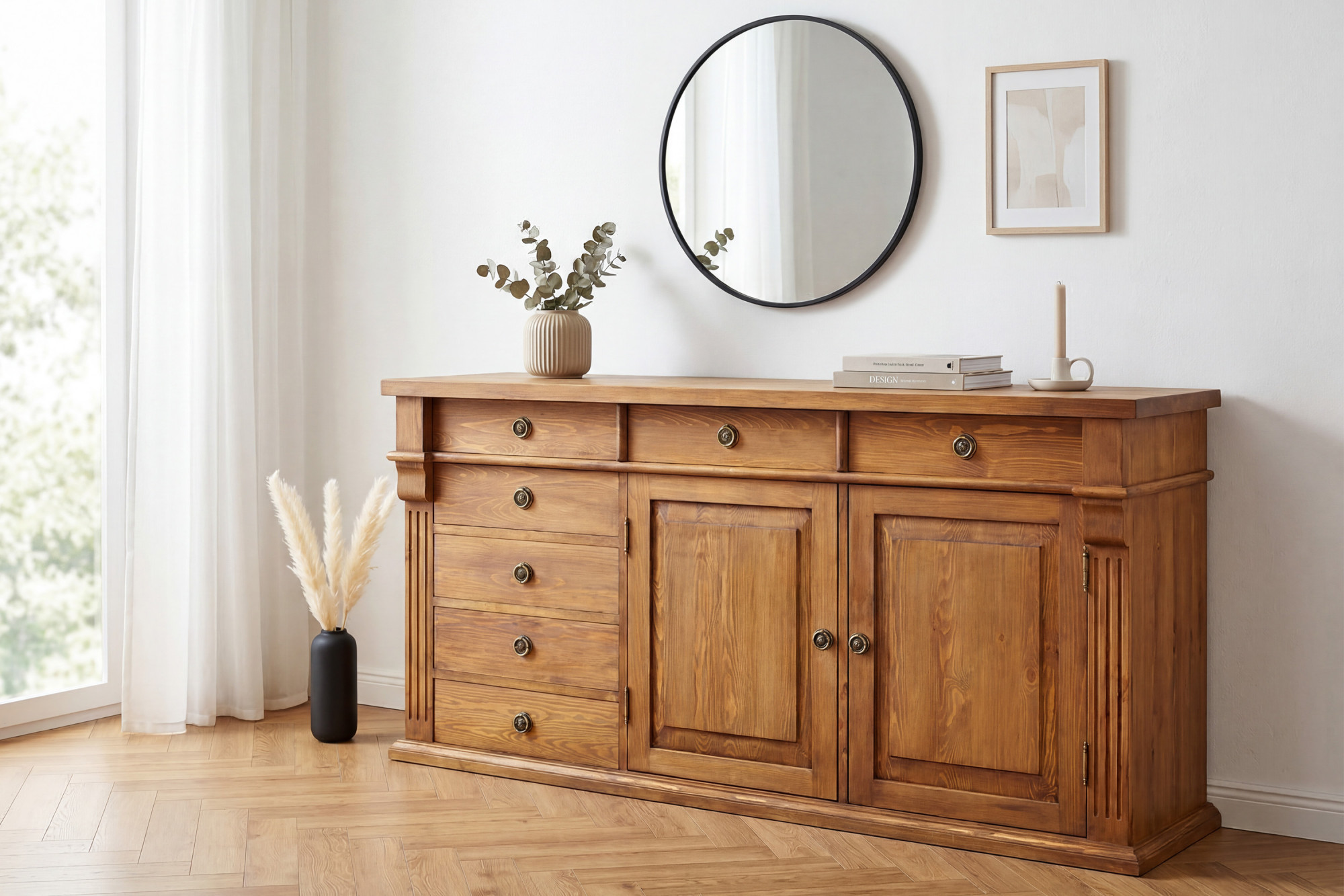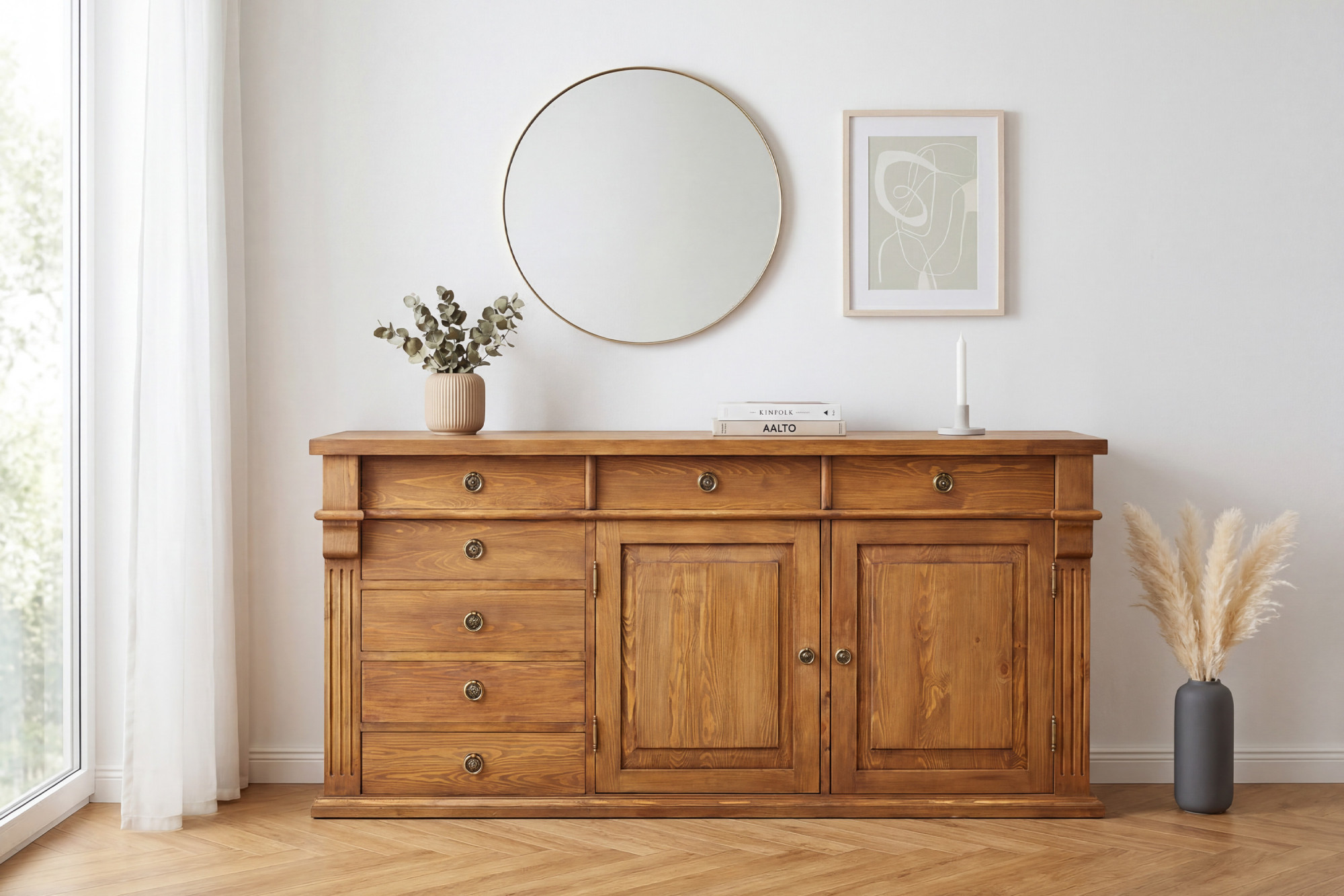 A tömör fenyő népszerű anyag szilárdsága, tartóssága és természetes megjelenése miatt. A barna lakkal és patinával kombinálva olyan bútort eredményez, amely elegáns, otthonos és nagyon időtlen hatású. Ha luxus fenyőkomódot keres, amely elegendő helyet kínál és egyben díszíti a belső terét, a D-COM-69 modell kiváló választás.