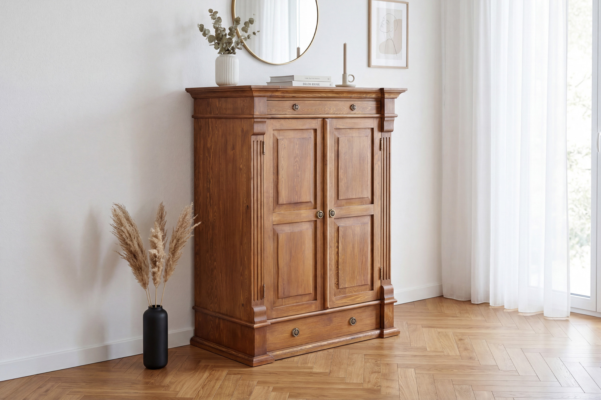 A fa Prestige komódot értékelni fogja mindenki, aki a minőségi bútort, a hosszú élettartamot és a tömörfa természetes szépségét részesíti előnyben. A barna lakk árnyalata és a patina meleg, barátságos hatást kelt, és autentikus megjelenést ad a hagyományos stílus ihlette bútoroknak. Ennek köszönhetően nem csak klasszikus belsőkbe illik, hanem rusztikus vagy elegánsan berendezett otthonokba is.