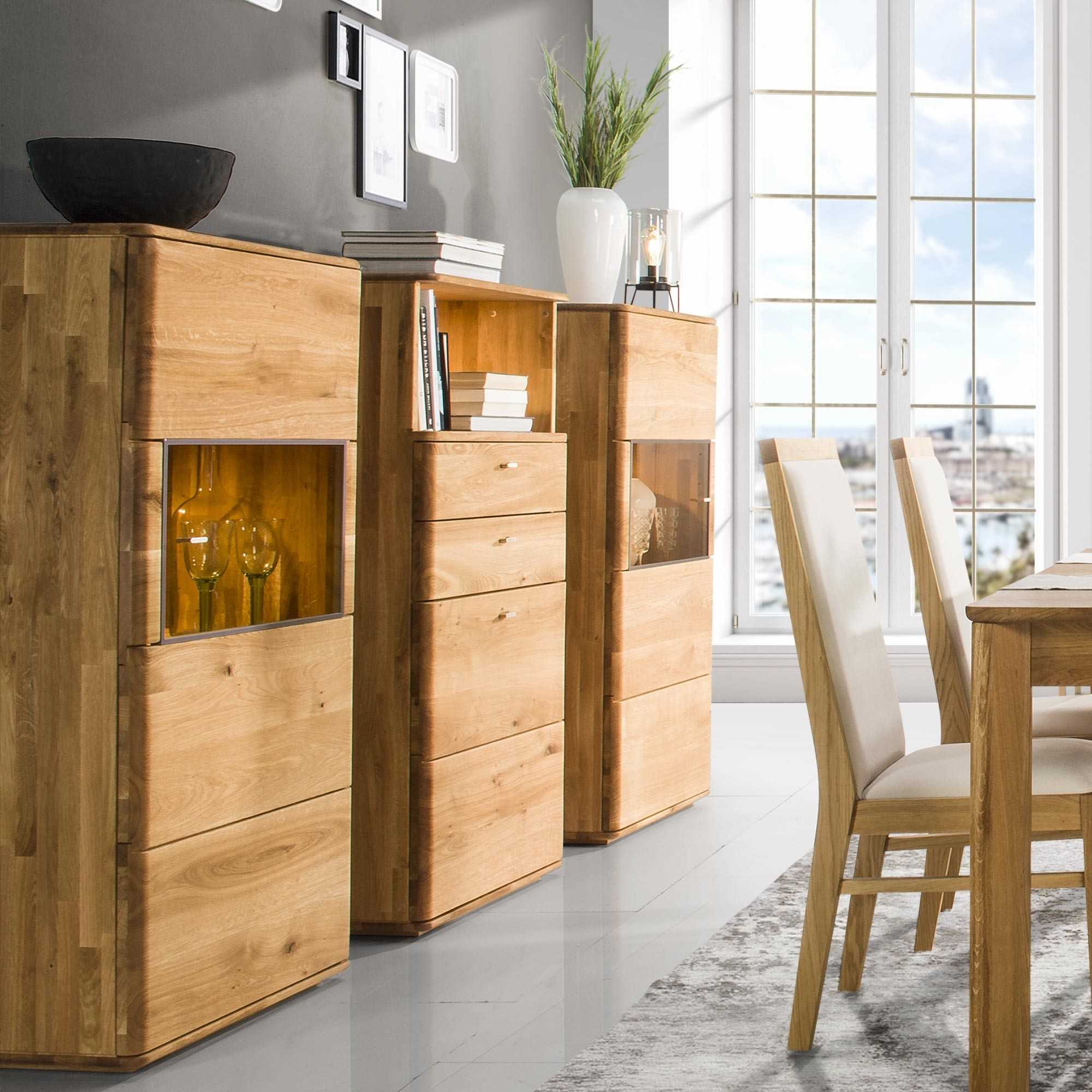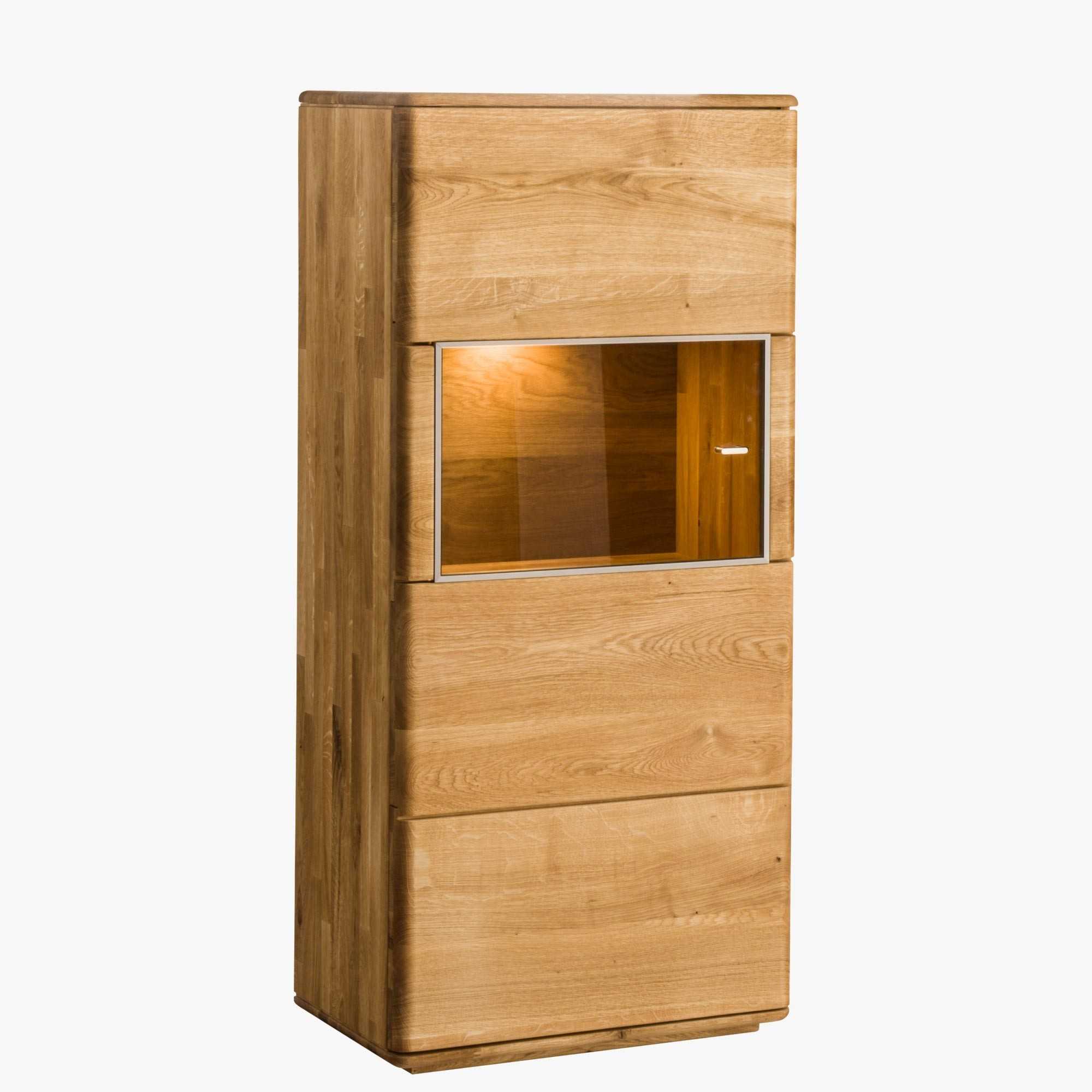 Tömör tölgy alacsony vitrin üvegajtókkal, 3 polcos, természetes fa