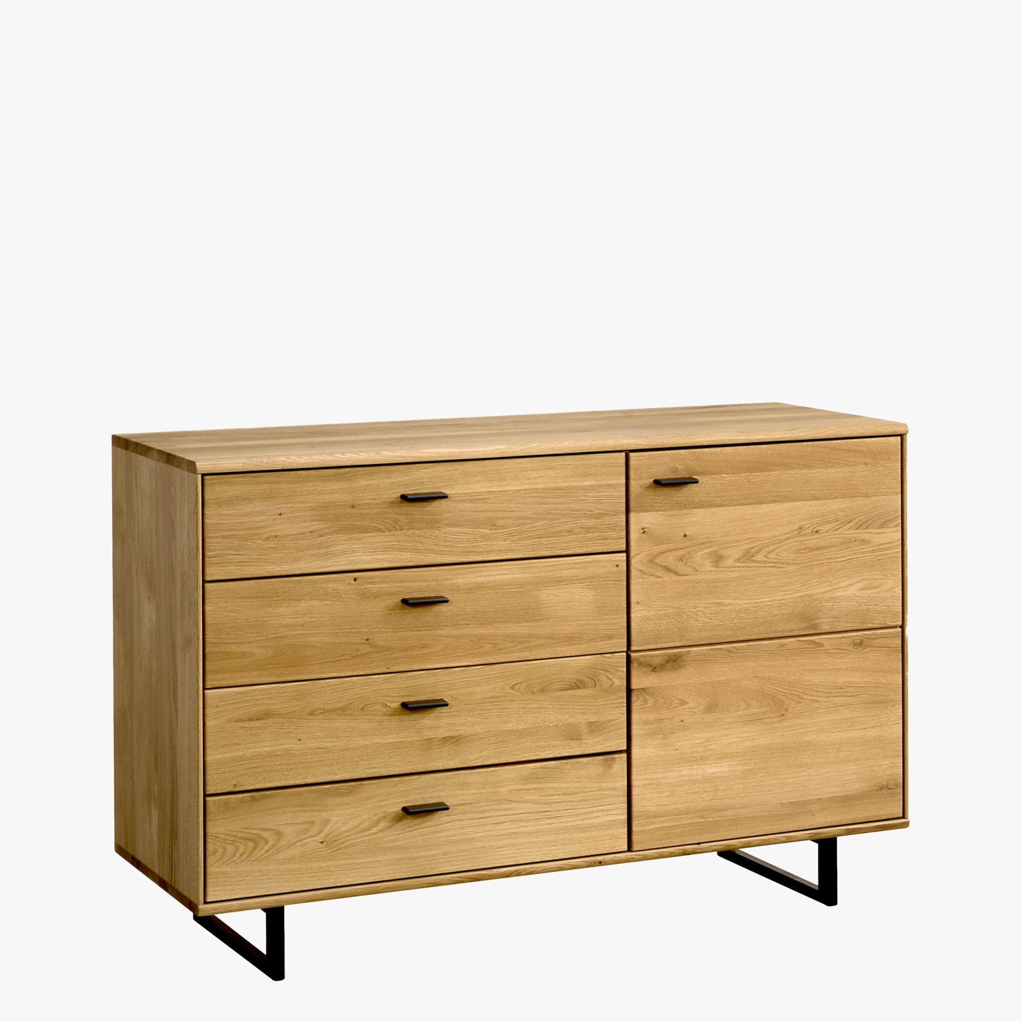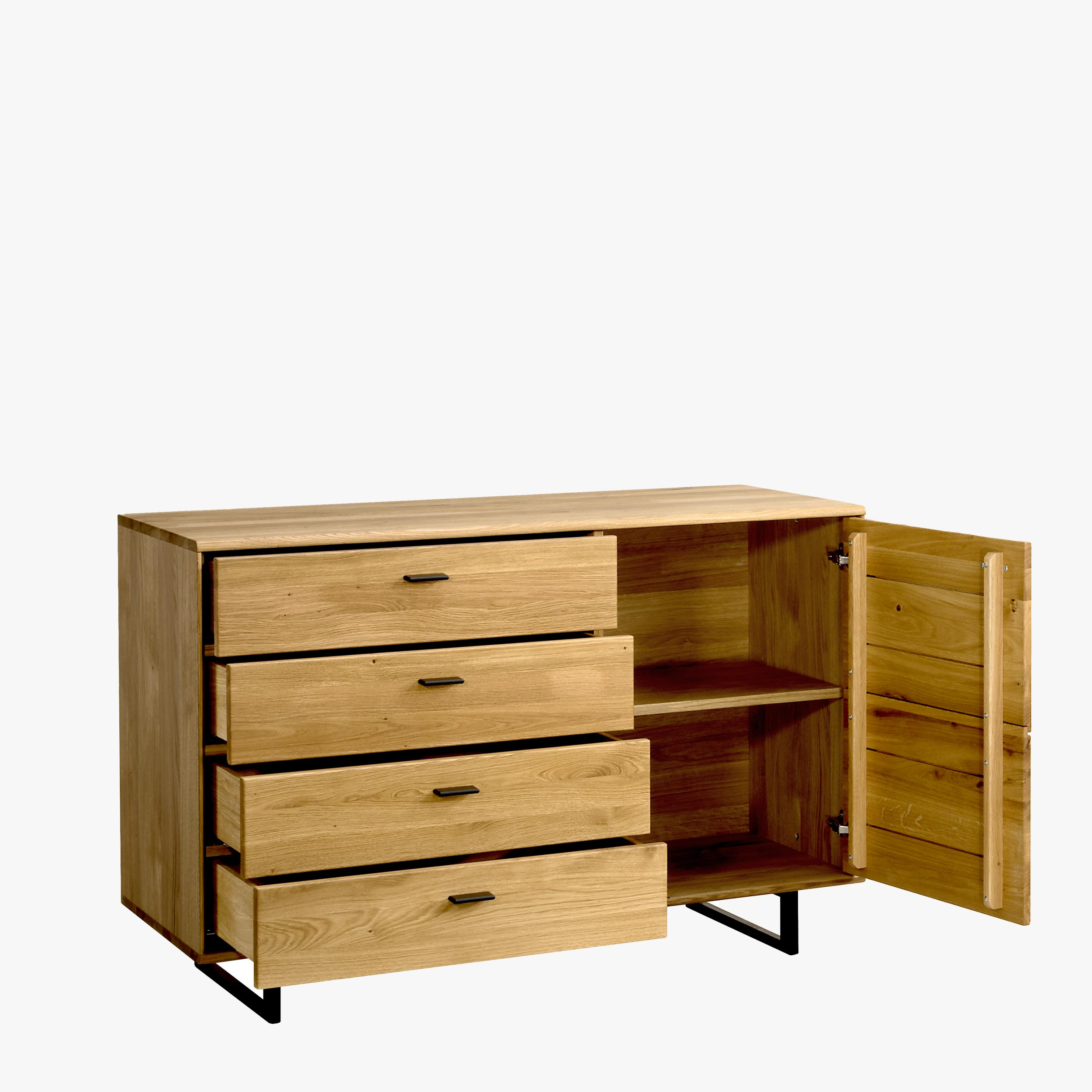 Gyakorlati tárolási megoldás: A komód két részre van osztva – jobb oldalon négy tágas fiók található, ideális ruhák, dokumentumok vagy más személyes tárgyak tárolására. Bal oldalon ajtó van, mögötte egy polc rejtőzik, amely további tárolóhelyet biztosít edények, könyvek vagy dekorációk számára.