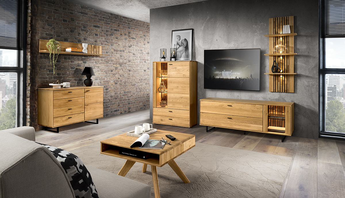 Luxus nappalibútor kiváló minőségű tömör tölgy kivitelben, tölgy furnérral kombinálva, ahol a főként látható részek tömör anyagból készülnek. Szállítjuk natúr mézszínű, kefélt tölgy dekorban. A bútor összeszerelt állapotban kerül leszállításra (erősebb, stabilabb, és nem látszanak az esztétikát rontó csavarok, mint a lapra szerelt daraboknál), a fiókok és az ajtók pedig csillapítórendszerrel vannak ellátva a puha és csendes záródás érdekében. Az üveges részek polcai üvegből készülnek. Elegáns tömör tölgy és natúr furnér nappali szett. A modern ipari dizájn parketta mintázattal és fém lábakkal – ezek a Tramontino tölgybútor fő előnyei. Az üveges ajtók hátoldalai speciális kialakítású, összeillesztett parketta lapocskákból készülnek, lásd a fotót. A bútor természetes viasszal és a német Livos márkájú olajjal van kezelve.