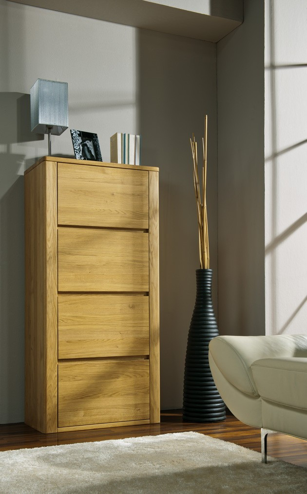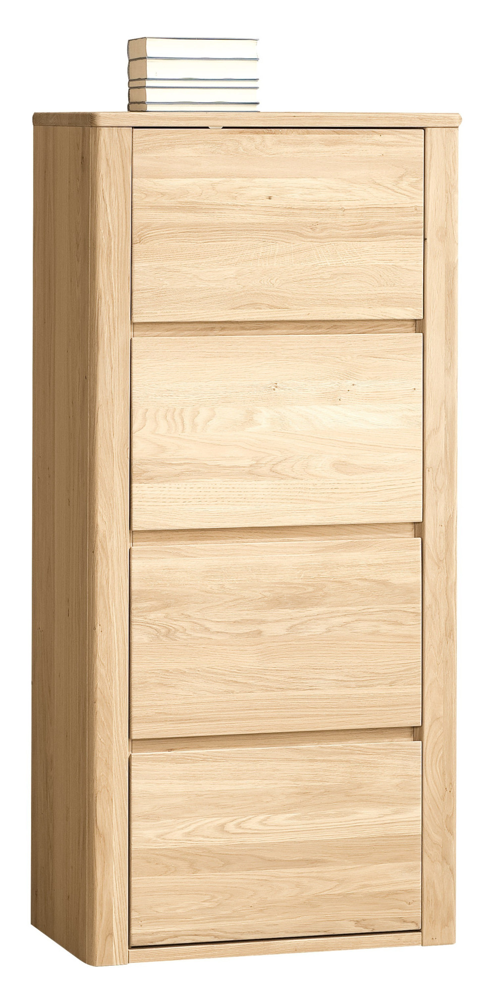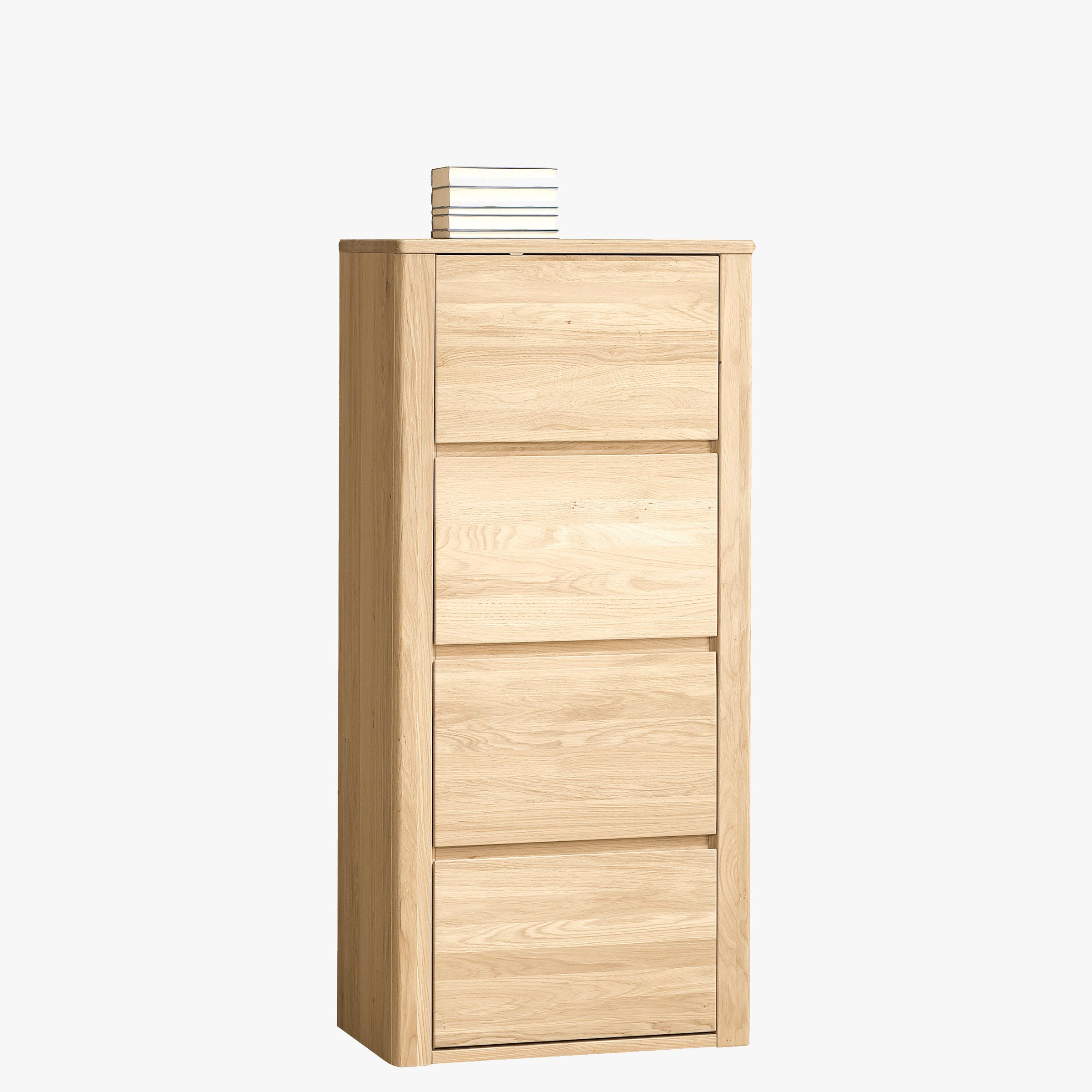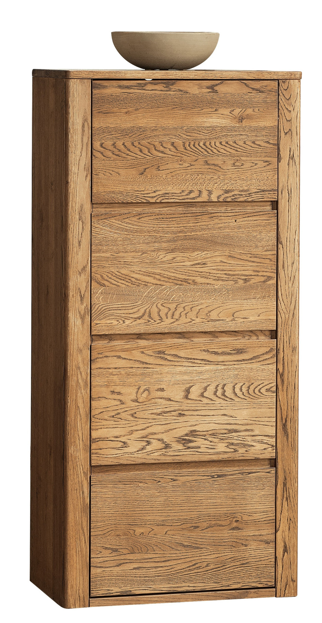 Keskeny tölgyfa komód gyönyörű, homogén megjelenésű, és azonnal elvarázsolja Önt a csodás textúrájával, amelyből készült. Bizonyítéka annak az állításnak, hogy kevesebb néha több. A légies minimalista dizájn, amelyet a simára megmunkált felületek és a finoman lekerekített élek uralnak, bizonyítja, hogy a tömörfából készült bútoroknak nem kell mindig rusztikus megjelenésűeknek lenniük. Ha Ön a modern formavilágú, elegáns tömörfa bútorok körében szeret berendezni, a NICE kollekció keskeny tölgyfa komódja a legjobb választás!