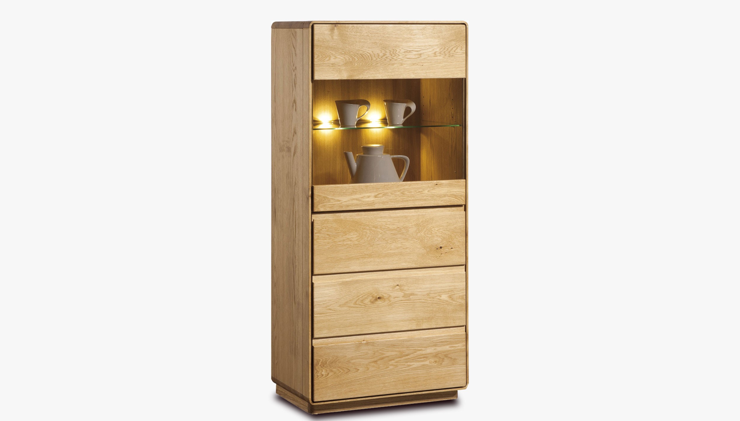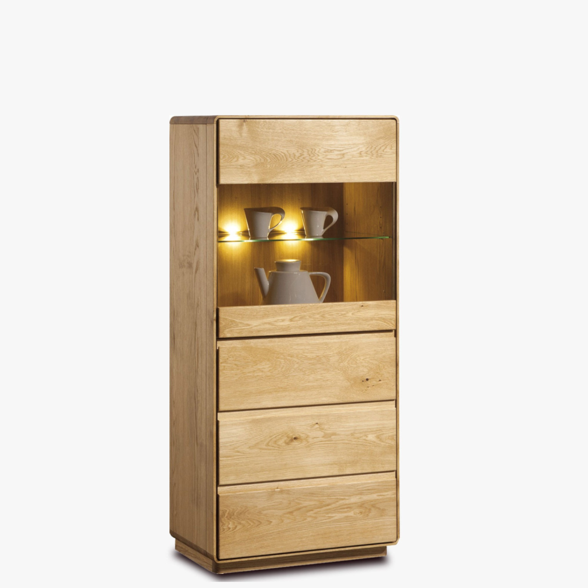 Tölgyfa vitrin natural színű, elegáns nappali bútor, kompakt méret