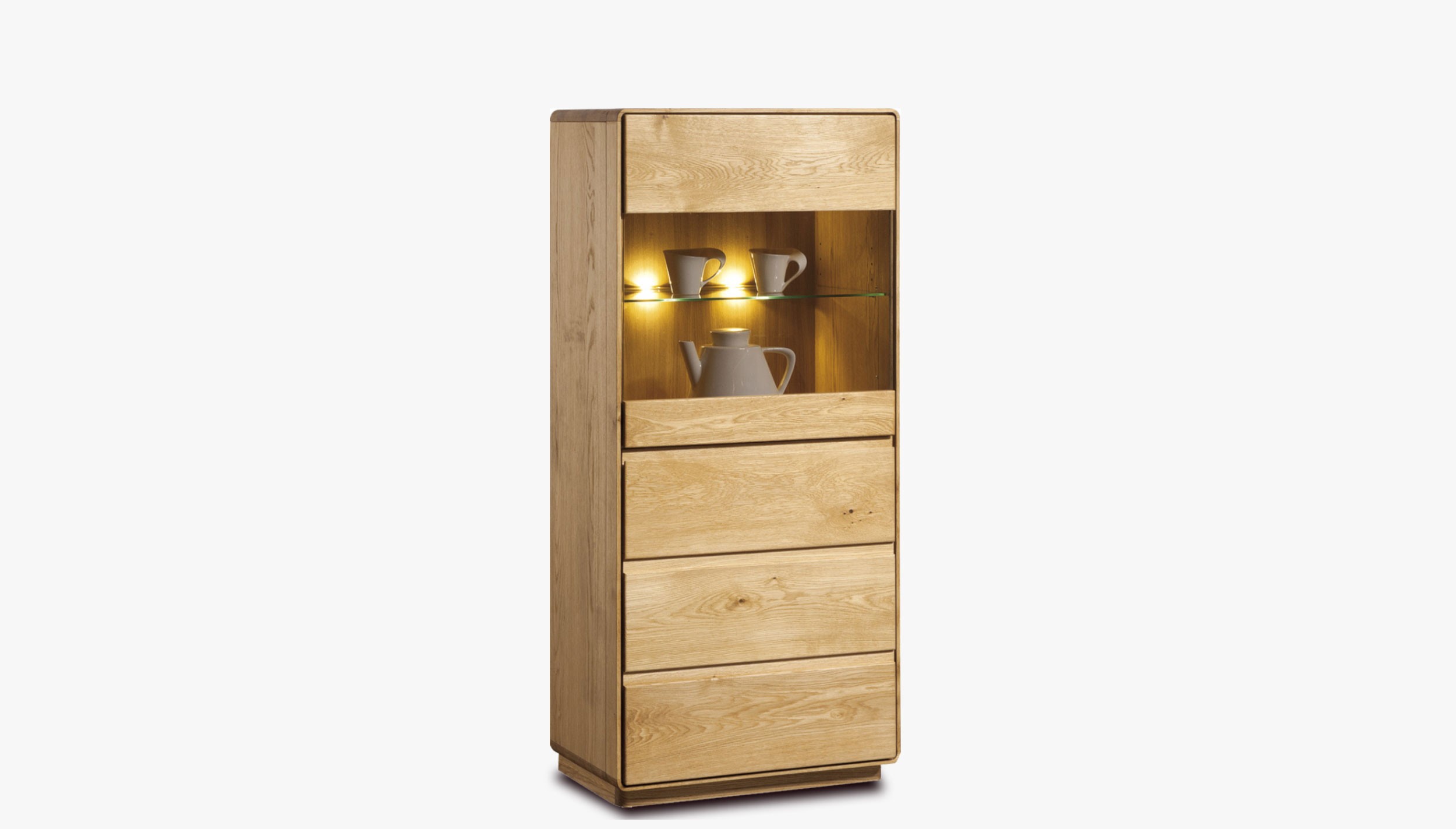 Az egyedülálló vad tölgy erezetének, a kiváló mesteri kidolgozásnak és a kellemes illatnak köszönhetően, amely betölti az egész helyiséget, a vitrinbe szó szerint beleszeret majd! Egy neves külföldi tervező munkája a vitrint légies stílussal ruházta fel, minimalista megoldással, sima felületekkel és finoman lekerekített élekkel. A légies hatást tökéletesen fokozza a fogantyú nélküli nyitórendszer ajtók.