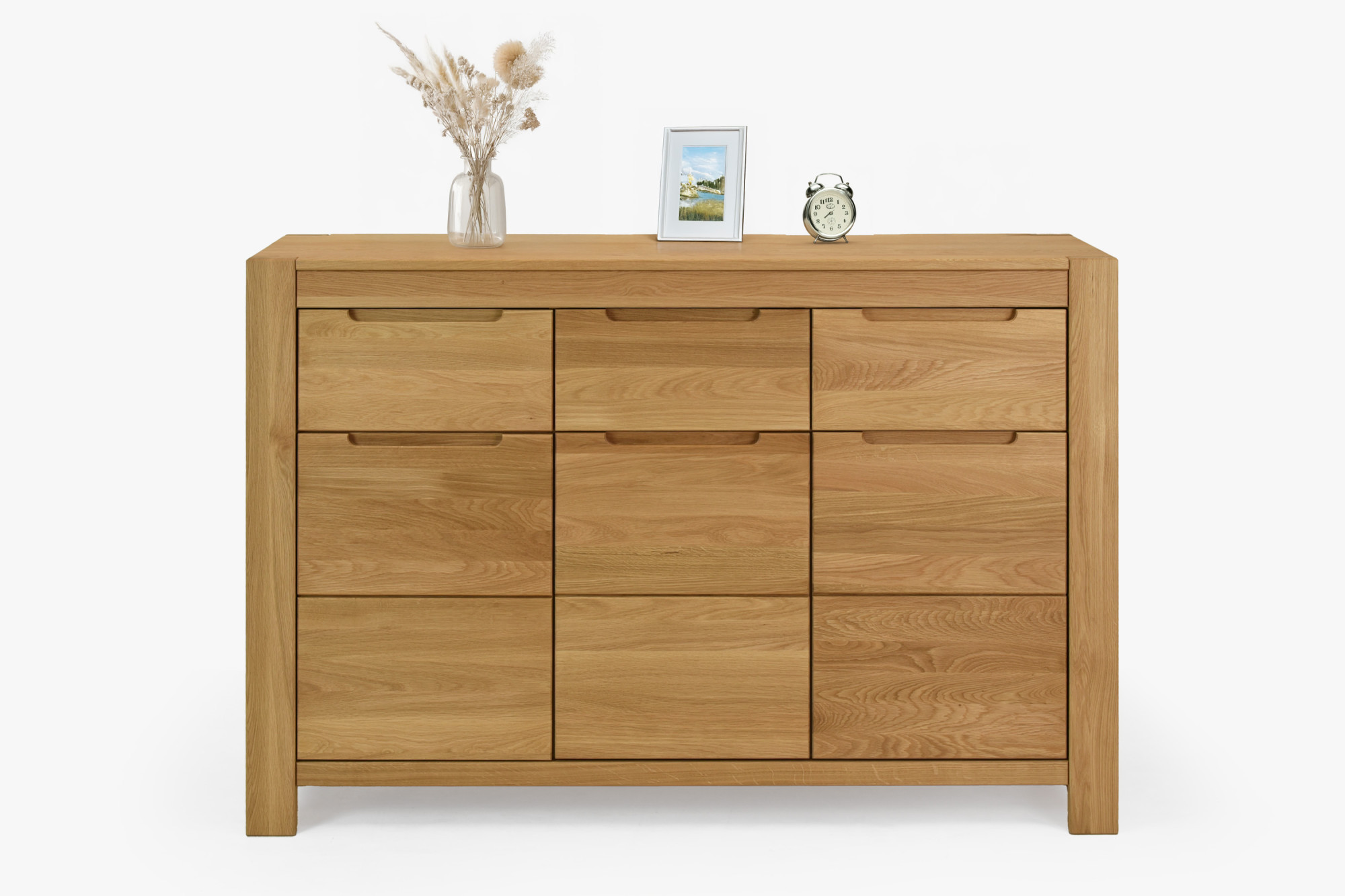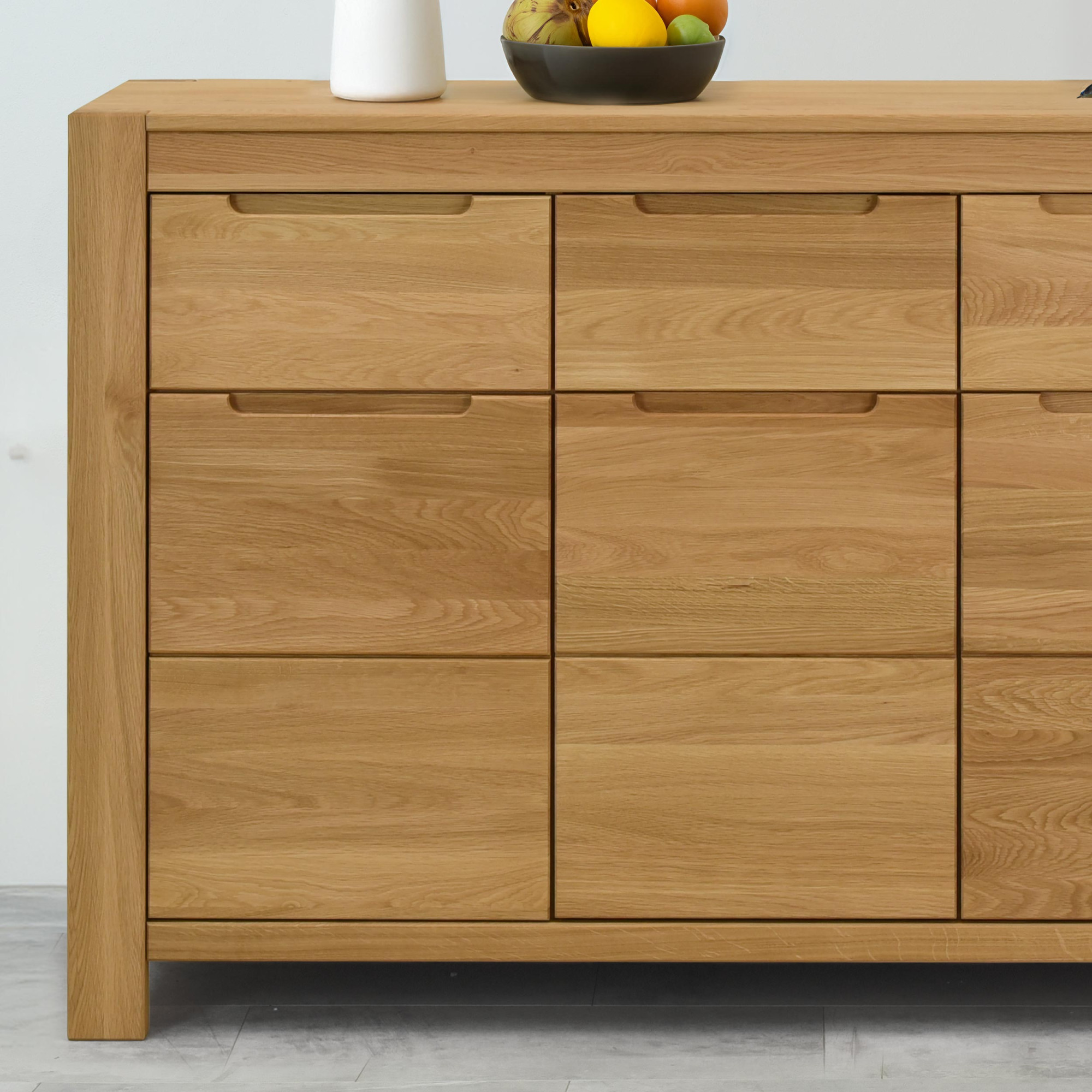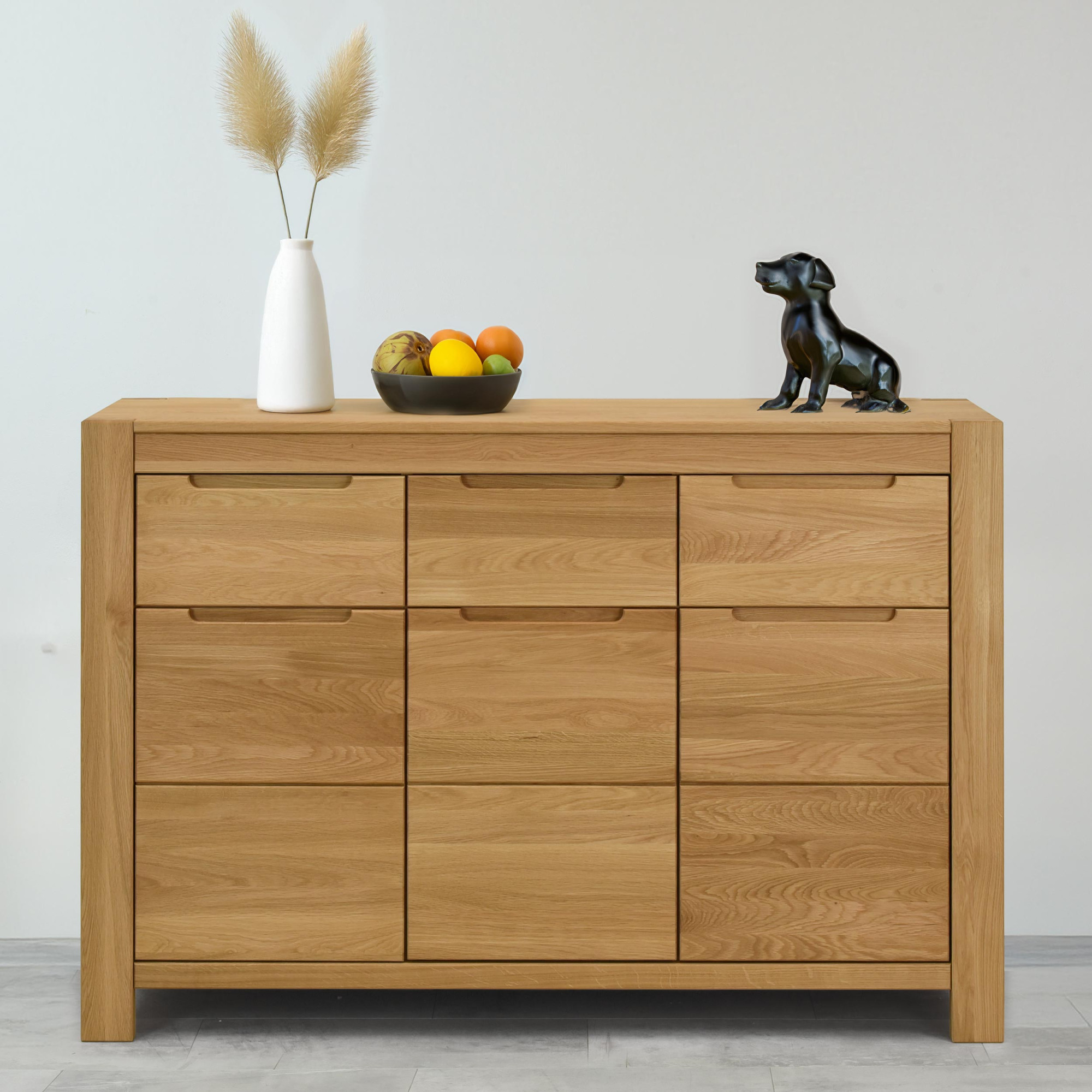 A Napolen kollekcióból származó tölgyfa komód természetes megjelenést, praktikusságot és kedvező árat kínál közvetlenül a gyártótól. Három tágas fiókot és három ajtót kínál; az ajtók mögött polcos tárolóhely található az asztali textíliák, edények vagy iratok áttekinthető elhelyezéséhez. A beépített (süllyesztett) fogantyúk nem törik meg a tiszta vonalakat, és hangsúlyozzák a kortalan, minimalista dizájnt, amely könnyen illeszkedik a modern és hagyományos enteriőrökhöz. A tölgy natúr árnyalatú felületet természetes olajjal kezelték. Minden ajtó és fiók soft-close mechanizmussal van felszerelve a csendes és kíméletes záródás érdekében – különösen a családi háztartásokban fogják értékelni.