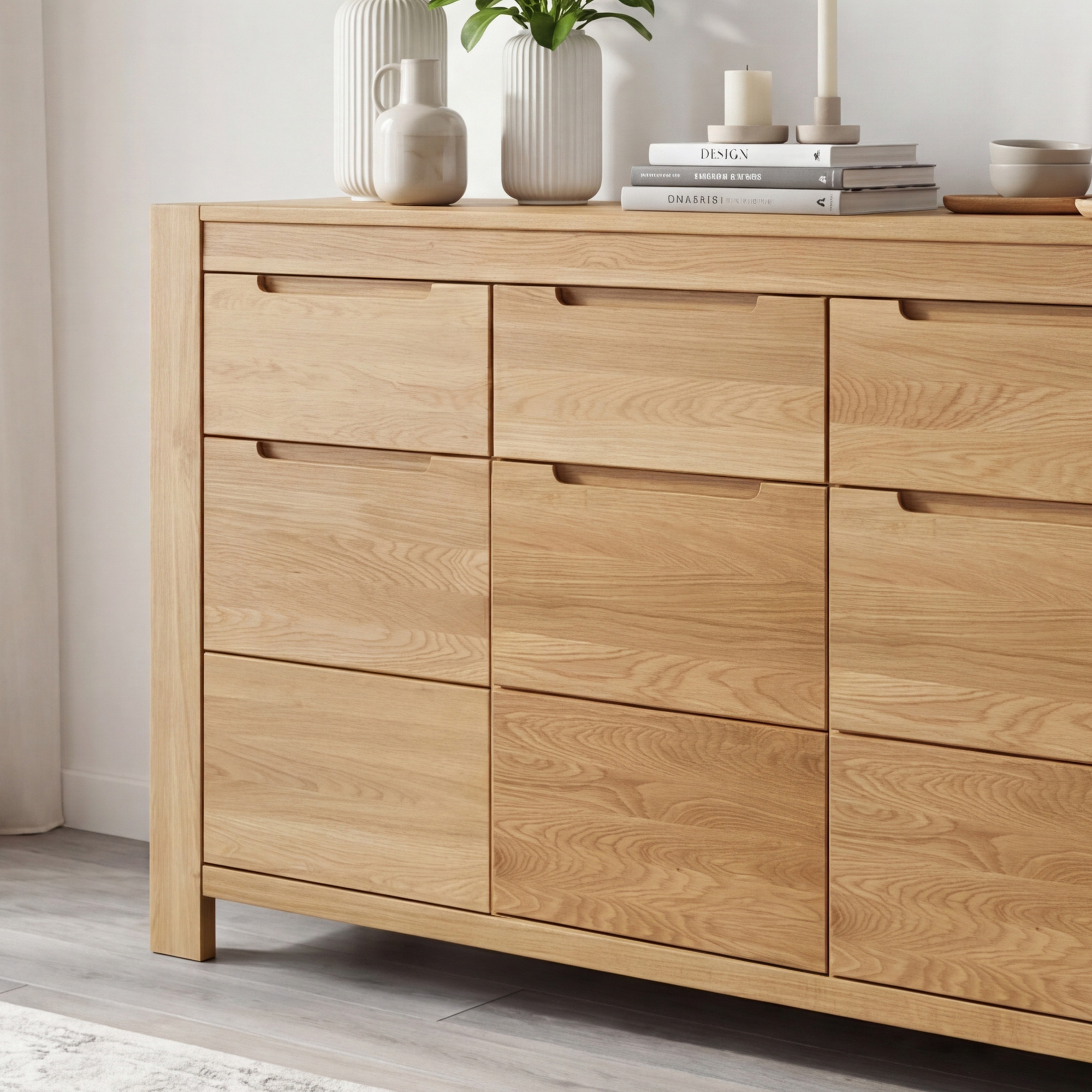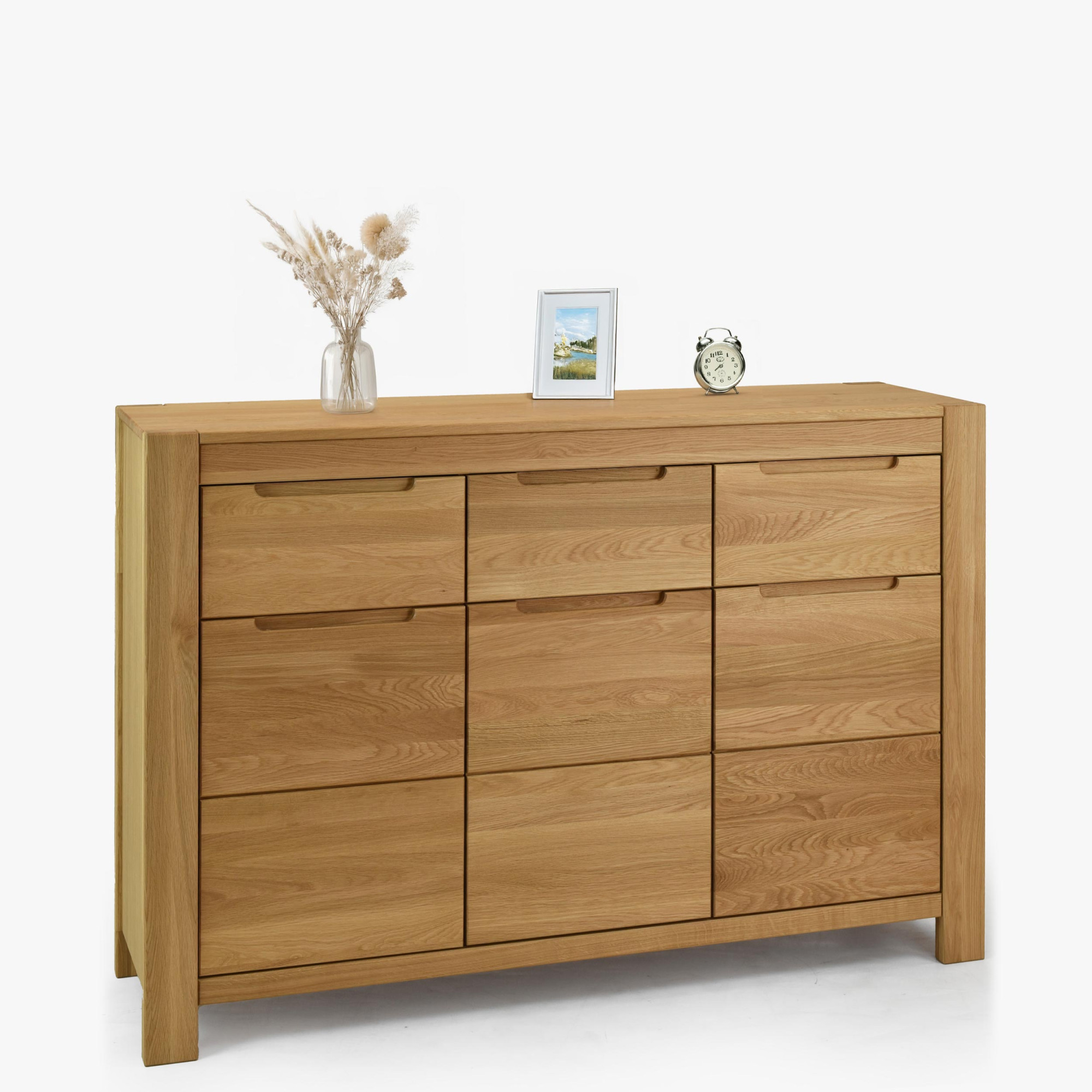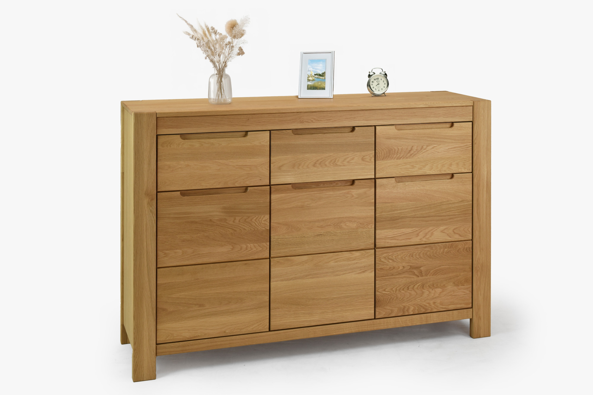 A Napolen kollekcióból származó tölgyfa komód természetes megjelenést, praktikusságot és kedvező árat kínál közvetlenül a gyártótól. Három tágas fiókot és három ajtót kínál; az ajtók mögött polcos tárolóhely található az asztali textíliák, edények vagy iratok áttekinthető elhelyezéséhez. A beépített (süllyesztett) fogantyúk nem törik meg a tiszta vonalakat, és hangsúlyozzák a kortalan, minimalista dizájnt, amely könnyen illeszkedik a modern és hagyományos enteriőrökhöz. A tölgy natúr árnyalatú felületet természetes olajjal kezelték. Minden ajtó és fiók soft-close mechanizmussal van felszerelve a csendes és kíméletes záródás érdekében – különösen a családi háztartásokban fogják értékelni.