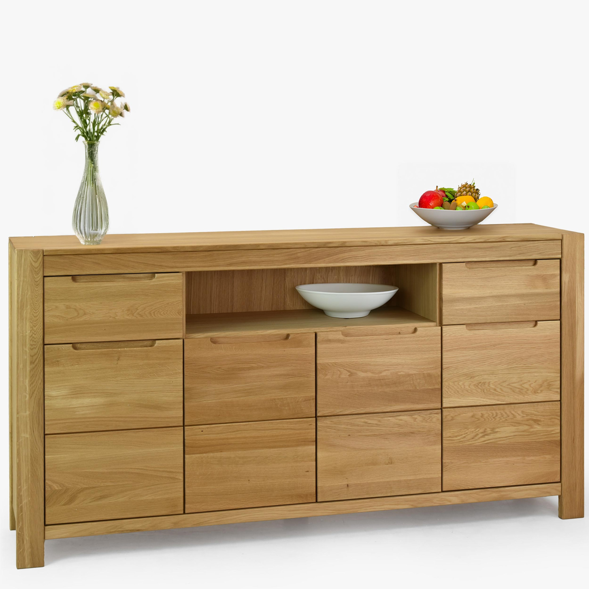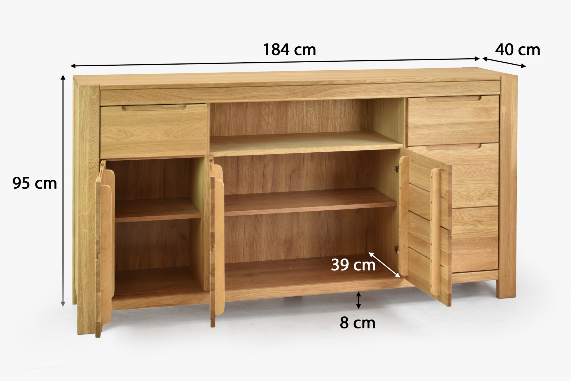 Natúr tölgyfa komód ajtókkal, fiókokkal és nyitott polccal, 184 cm